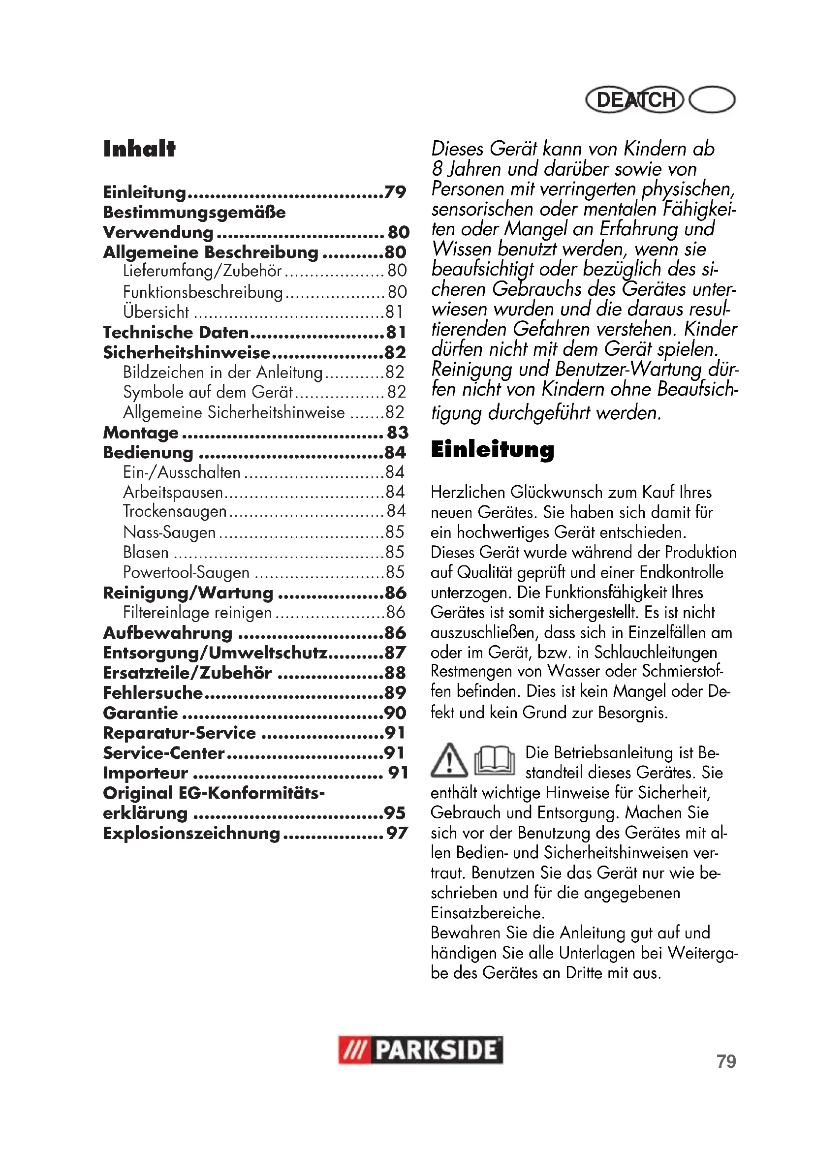 - Explosionszeichnung Dieses Gerät kann von Kindern ab 8Jahren und darüber sowie von Personen mit verringerten physischen, sensorischen oder mentalen Fähigkei- ten oder Mangel an Erfahrung und Wissen benutzt werden, wenn sie beaufsichtigt oder bezüglich des si- cheren Gebrauchs des Gerätes unter- wiesen wurden und die daraus resul- tierenden Gefahren verstehen. Kinder dürfen nicht mit dem Gerät spielen. Reinigung und Benutzer-Wartung dür- fen nicht von Kindern ohne Beaufsich- tigung durchgeführt werden. Einleitung Herzlichen Glückwunsch zum Kauf Ihres neuen Gerätes. Sie haben sich damit für ein hochwertiges Gerät entschieden. Dieses Gerät wurde während der Produktion auf Qualität geprüft und einer Endkontrolle unterzogen. Die Funktionsfähigkeit Ihres Gerätes ist somit sichergestellt. Es ist nicht auszuschließen, dass sich in Einzelfällen am oder im Gerät, bzw. in Schlauchleitungen Restmengen von Wasser oder Schmierstof- fen benden. Dies ist kein Mangel oder De- fekt und kein Grund zur Besorgnis. Die Betriebsanleitung ist Be- standteil dieses Gerätes. Sie enthält wichtige Hinweise für Sicherheit, Gebrauch und Entsorgung. Machen Sie sich vor der Benutzung des Gerätes mit al- len Bedien- und Sicherheitshinweisen ver- traut. Benutzen Sie das Gerät nur wie be- schrieben und für die angegebenen Einsatzbereiche. Bewahren Sie die Anleitung gut auf und händigen Sie alle Unterlagen bei Weiterga- be des Gerätes an Dritte mit aus.80 DE AT CH Bestimmungsgemäße Verwendung Das Gerät ist zum Nass- und Trockensau- gen im häuslichen Bereich wie z.B. im Haushalt, im Hobbyraum, im Auto oder in der Garage bestimmt. Das Gerät ist auch als Gebläse oder zum Absaugen von Was- ser einsetzbar. Dieses Gerät ist nicht zur gewerblichen Nutzung geeignet. Bei gewerblichem Ein- satz erlischt die Garantie. Das Aufsaugen von brennbaren, explosiven oder gesundheitsgefährdenden Stoffen ist verboten. Der Hersteller haftet nicht für Schäden, die durch bestimmungswidrigen Gebrauch oder falsche Bedienung verursacht wurden. Allgemeine Beschreibung Die Abbildungen nden Sie auf der vorderen und hinteren Aus- klappseite. Lieferumfang/Zubehör Packen Sie das Gerät aus und kontrollieren Sie, ob es vollständig ist: Das Gerät wird mit aufgesetztem Motor- kopf ( p. 97
