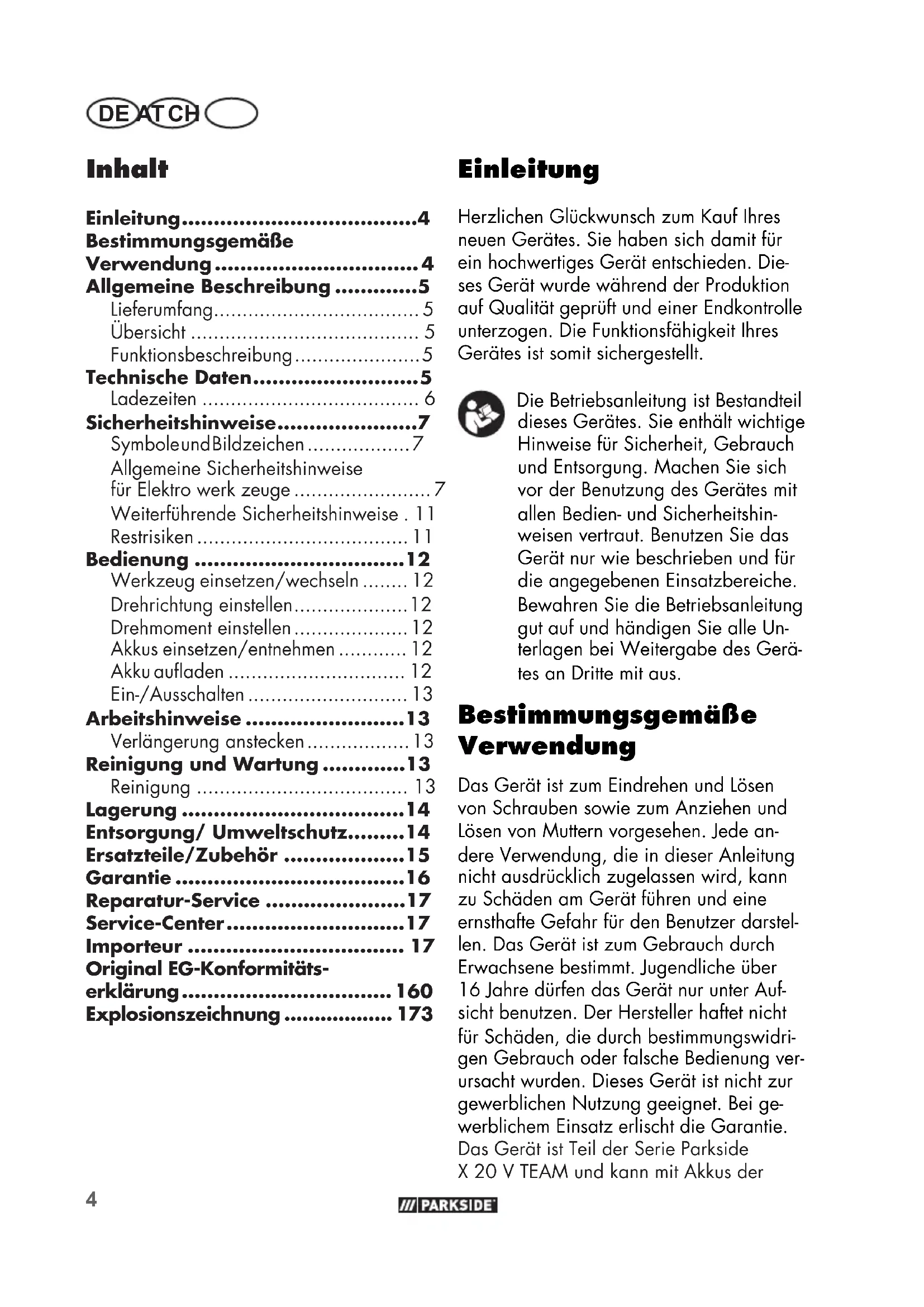 - Einleitung Herzlichen Glückwunsch zum Kauf Ihres neuen Gerätes. Sie haben sich damit für ein hochwertiges Gerät entschieden. Die- ses Gerät wurde während der Produktion auf Qualität geprüft und einer Endkontrolle unterzogen. Die Funktionsfähigkeit Ihres Gerätes ist somit sichergestellt. Die Betriebsanleitung ist Bestandteil dieses Gerätes. Sie enthält wichtige Hinweise für Sicherheit, Gebrauch und Entsorgung. Machen Sie sich vor der Benutzung des Gerätes mit allen Bedien- und Sicherheitshin- weisen vertraut. Benutzen Sie das Gerät nur wie beschrieben und für die angegebenen Einsatzbereiche. Bewahren Sie die Betriebsanleitung gut auf und händigen Sie alle Un- terlagen bei Weitergabe des Gerä- tes an Dritte mit aus. Bestimmungsgemäße Verwendung Das Gerät ist zum Eindrehen und Lösen von Schrauben sowie zum Anziehen und Lösen von Muttern vorgesehen. Jede an- dere Verwendung, die in dieser Anleitung nicht ausdrücklich zugelassen wird, kann zu Schäden am Gerät führen und eine ernsthafte Gefahr für den Benutzer darstel- len. Das Gerät ist zum Gebrauch durch Erwachsene bestimmt. Jugendliche über 16Jahre dürfen das Gerät nur unter Auf- sicht benutzen. Der Hersteller haftet nicht für Schäden, die durch bestimmungswidri- gen Gebrauch oder falsche Bedienung ver- ursacht wurden. Dieses Gerät ist nicht zur gewerblichen Nutzung geeignet. Bei ge- werblichem Einsatz erlischt die Garantie. Das Gerät ist Teil der Serie Parkside X20VTEAM und kann mit Akkus der Original EG-Konformitäts- erklärung p. 160