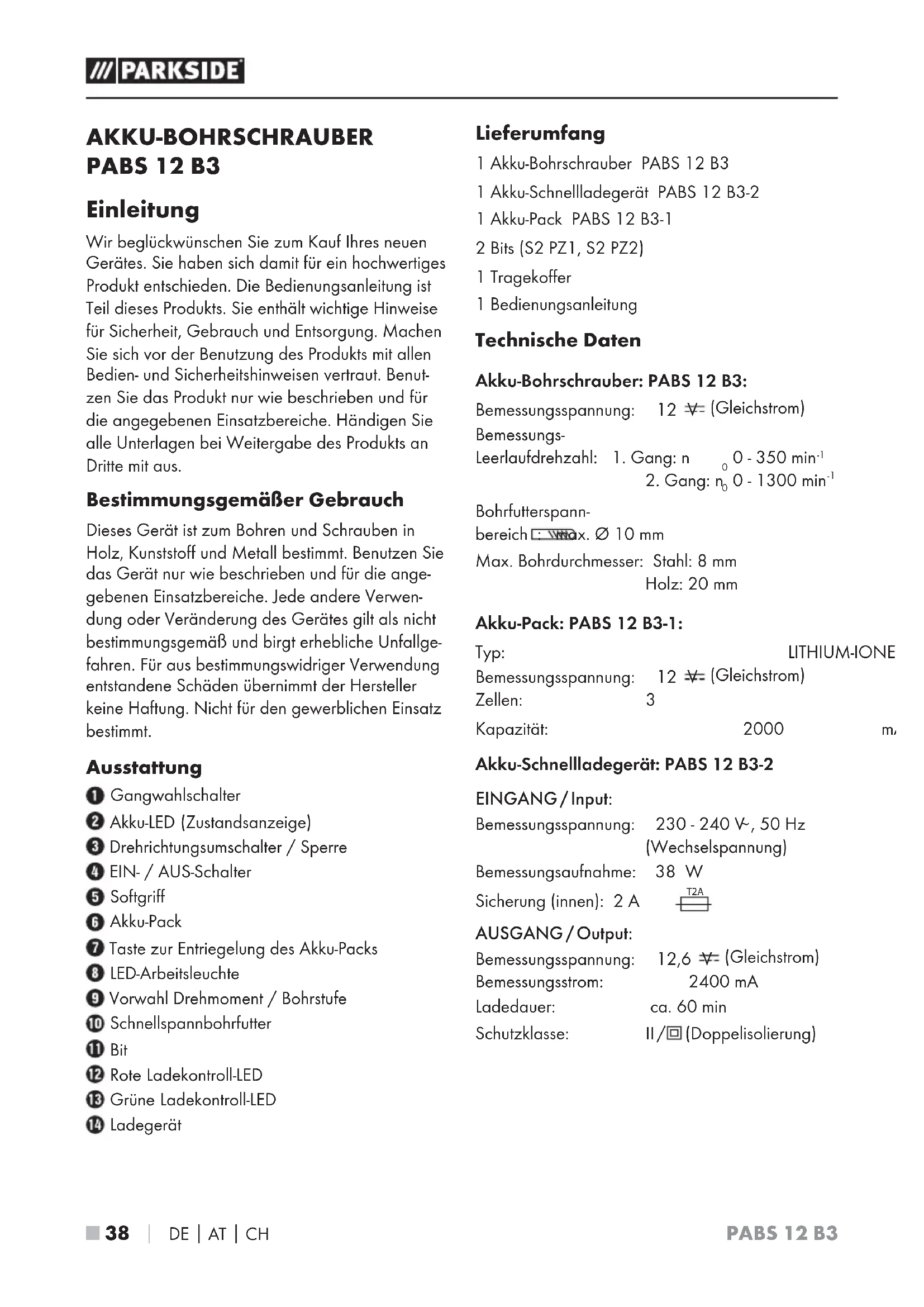 Bohrfutterspann- bereich : max. Ø 10 mm Max. Bohrdurchmesser: Stahl: 8 mm Holz: 20 mm Akku-Pack: PABS 12 B3-1: Typ: LITHIUM-IONEN Bemessungsspannung: 12 V (Gleichstrom) Zellen: 3 Kapazität: 2000 mAh Akku-Schnellladegerät: PABS 12 B3-2 EINGANG / Input: Bemessungsspannung: 230 - 240 V