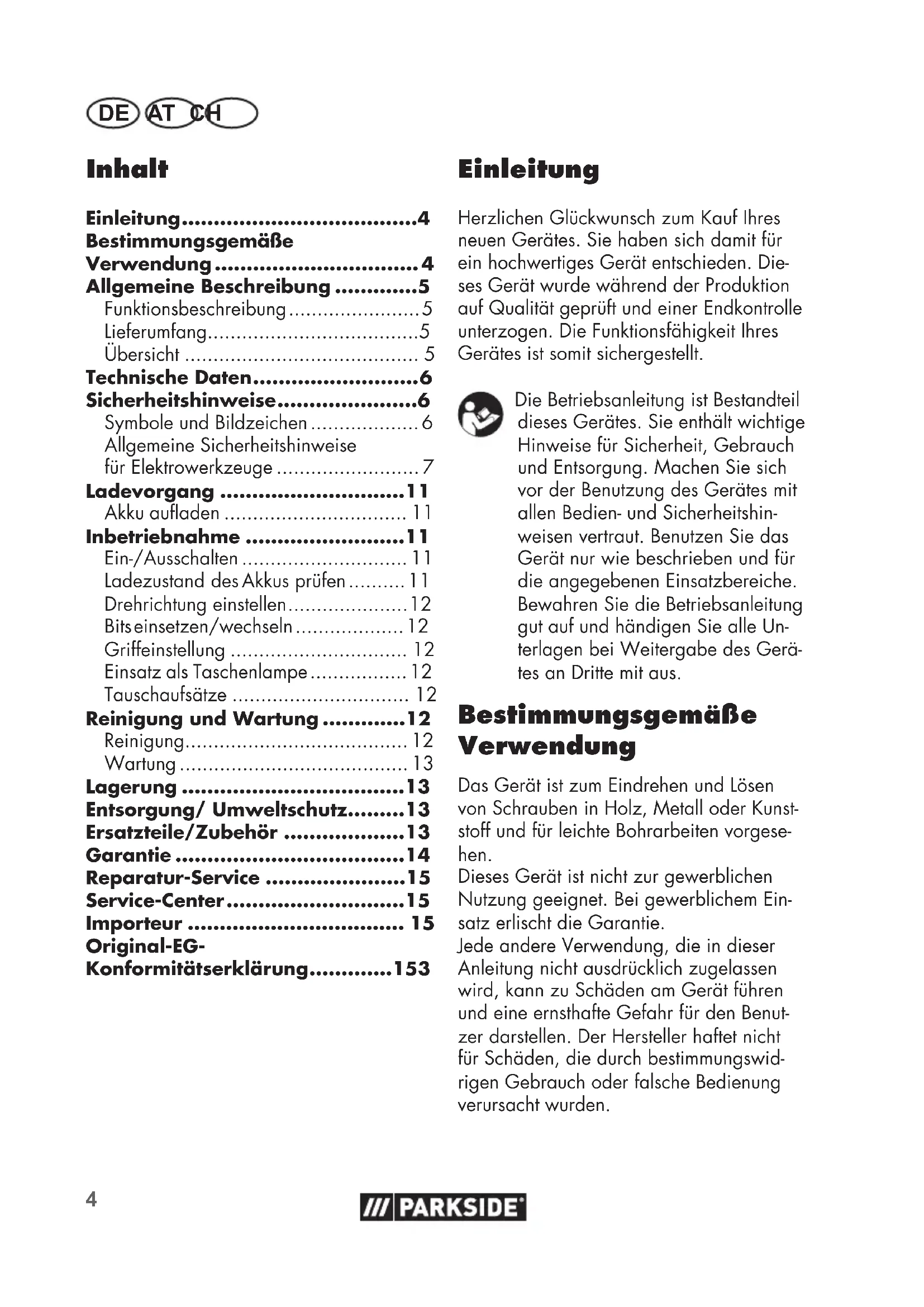 - Einleitung Herzlichen Glückwunsch zum Kauf Ihres neuen Gerätes. Sie haben sich damit für ein hochwertiges Gerät entschieden. Die- ses Gerät wurde während der Produktion auf Qualität geprüft und einer Endkontrolle unterzogen. Die Funktionsfähigkeit Ihres Gerätes ist somit sichergestellt. Die Betriebsanleitung ist Bestandteil dieses Gerätes. Sie enthält wichtige Hinweise für Sicherheit, Gebrauch und Entsorgung. Machen Sie sich vor der Benutzung des Gerätes mit allen Bedien- und Sicherheitshin- weisen vertraut. Benutzen Sie das Gerät nur wie beschrieben und für die angegebenen Einsatzbereiche. Bewahren Sie die Betriebsanleitung gut auf und händigen Sie alle Un- terlagen bei Weitergabe des Gerä- tes an Dritte mit aus. Bestimmungsgemäße Verwendung Das Gerät ist zum Eindrehen und Lösen von Schrauben in Holz, Metall oder Kunst- stoff und für leichte Bohrarbeiten vorgese- hen. Dieses Gerät ist nicht zur gewerblichen Nutzung geeignet. Bei gewerblichem Ein- satz erlischt die Garantie. Jede andere Verwendung, die in dieser Anleitung nicht ausdrücklich zugelassen wird, kann zu Schäden am Gerät führen und eine ernsthafte Gefahr für den Benut- zer darstellen. Der Hersteller haftet nicht für Schäden, die durch bestimmungswid- rigen Gebrauch oder falsche Bedienung verursacht wurden. Original-EG- Konformitätserklärung ATDE CH p. 153