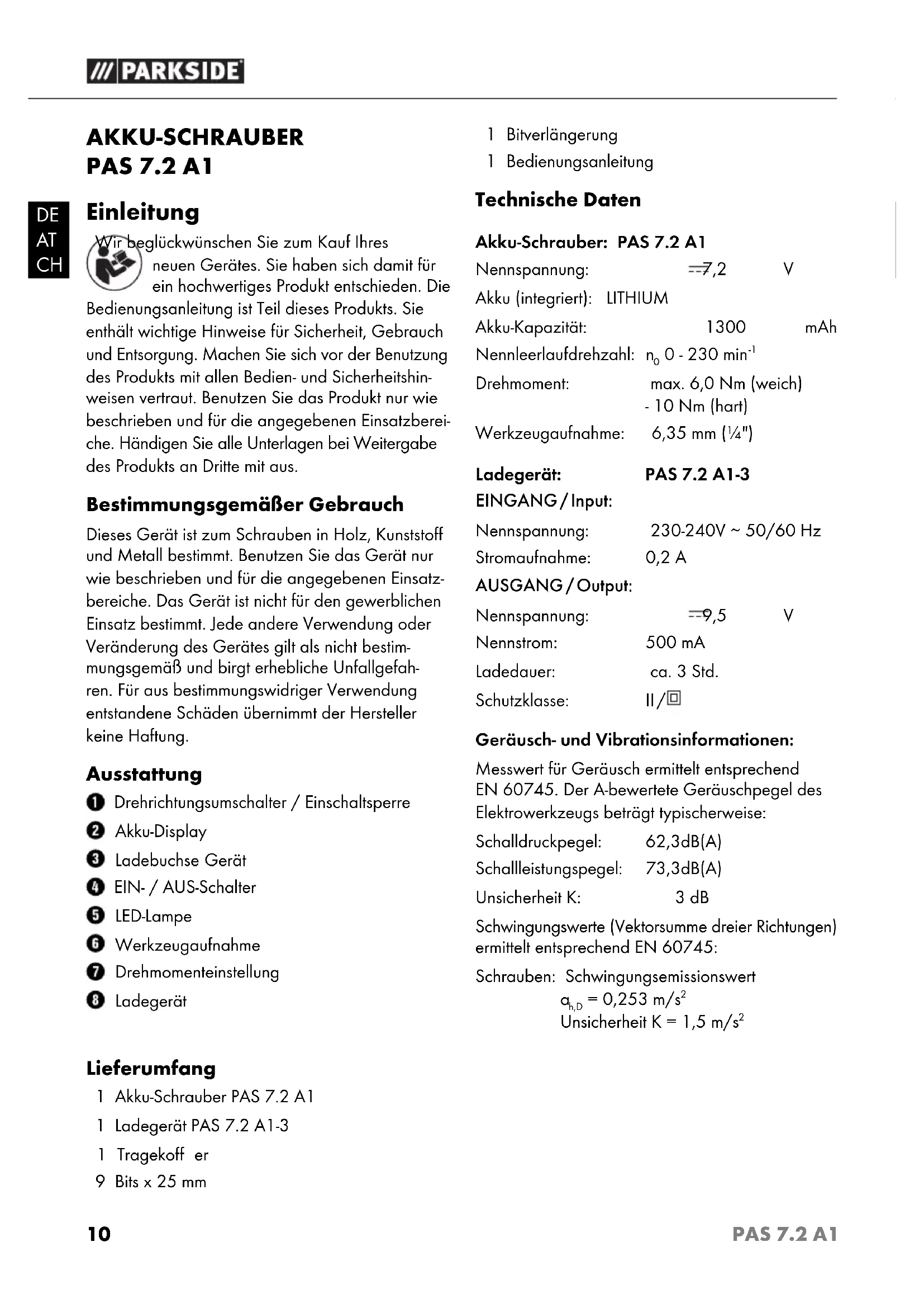 Drehmoment: max. 6,0 Nm (weich) - 10 Nm (hart) Werkzeugaufnahme: 6,35 mm (¼") Ladegerät: PAS 7.2 A1-3 EINGANG / Input: Nennspannung: 230-240V ∼ 50/60 Hz Stromaufnahme: 0,2 A AUSGANG / Output: Nennspannung: 9,5 V Nennstrom: 500 mA Ladedauer: ca. 3 Std. Schutzklasse: II / Geräusch- und Vibrationsinformationen: Messwert für Geräusch ermittelt entsprechend EN 60745. Der A-bewertete Geräuschpegel des Elektrowerkzeugs beträgt typischerweise: Schalldruckpegel: 62,3 dB(A) Schallleistungspegel: 73,3 dB(A) Unsicherheit K: 3 dB Schwingungswerte (Vektorsumme dreier Richtungen) ermittelt entsprechend EN 60745: Schrauben: Schwingungsemissionswert