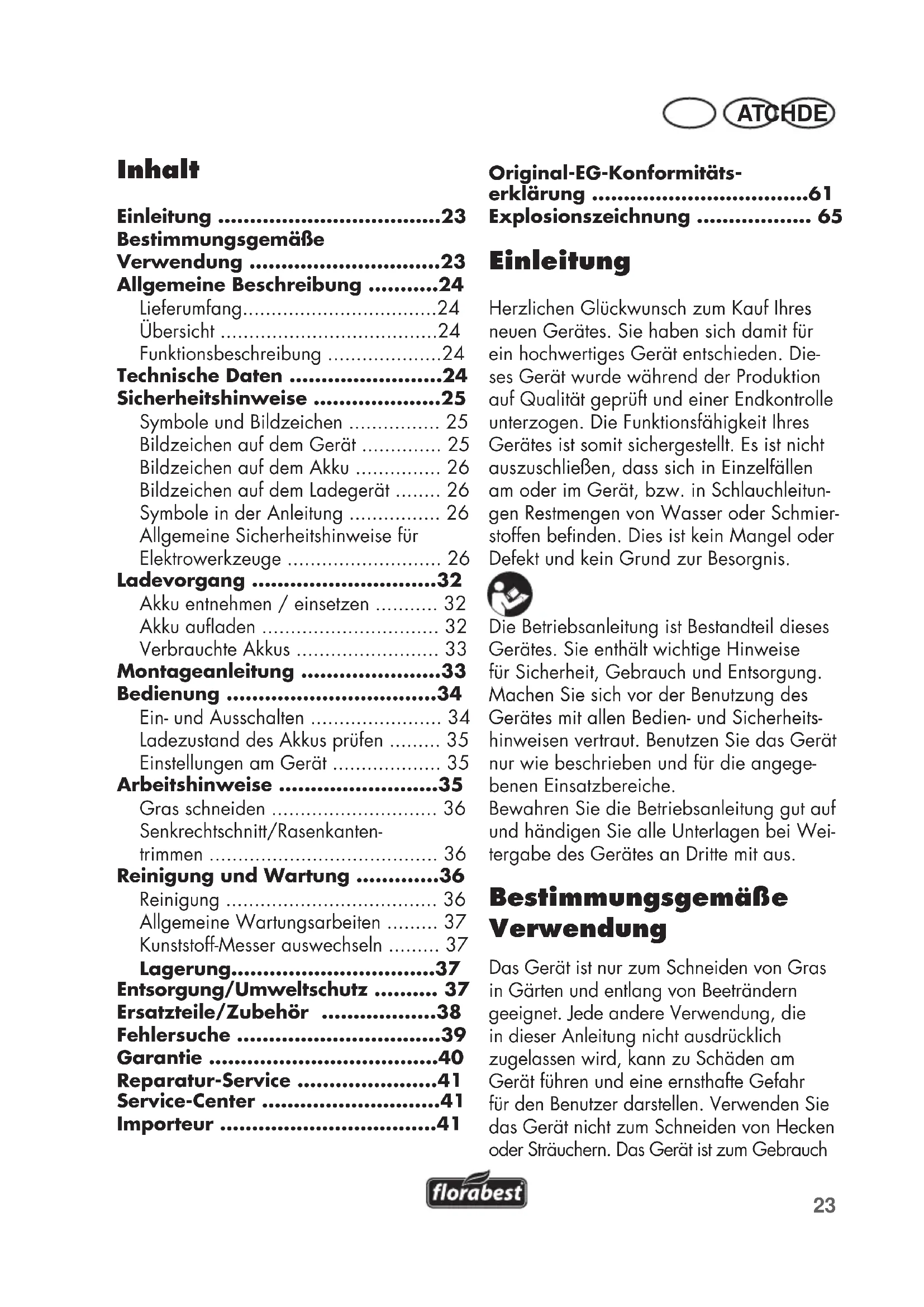 - Einleitung Herzlichen Glückwunsch zum Kauf Ihres neuen Gerätes. Sie haben sich damit für ein hochwertiges Gerät entschieden. Die- ses Gerät wurde während der Produktion auf Qualität geprüft und einer Endkontrolle unterzogen. Die Funktionsfähigkeit Ihres Gerätes ist somit sichergestellt. Es ist nicht auszuschließen, dass sich in Einzelfällen am oder im Gerät, bzw. in Schlauchleitun- gen Restmengen von Wasser oder Schmier- stoffen benden. Dies ist kein Mangel oder Defekt und kein Grund zur Besorgnis. Die Betriebsanleitung ist Bestandteil dieses Gerätes. Sie enthält wichtige Hinweise für Sicherheit, Gebrauch und Entsorgung. Machen Sie sich vor der Benutzung des Gerätes mit allen Bedien- und Sicherheits- hinweisen vertraut. Benutzen Sie das Gerät nur wie beschrieben und für die angege- benen Einsatzbereiche. Bewahren Sie die Betriebsanleitung gut auf und händigen Sie alle Unterlagen bei Wei- tergabe des Gerätes an Dritte mit aus. Bestimmungsgemäße Verwendung Das Gerät ist nur zum Schneiden von Gras in Gärten und entlang von Beeträndern geeignet. Jede andere Verwendung, die in dieser Anleitung nicht ausdrücklich zugelassen wird, kann zu Schäden am Gerät führen und eine ernsthafte Gefahr für den Benutzer darstellen. Verwenden Sie das Gerät nicht zum Schneiden von Hecken oder Sträuchern. Das Gerät ist zum Gebrauch Original-EG-Konformitäts- erklärung p. 61