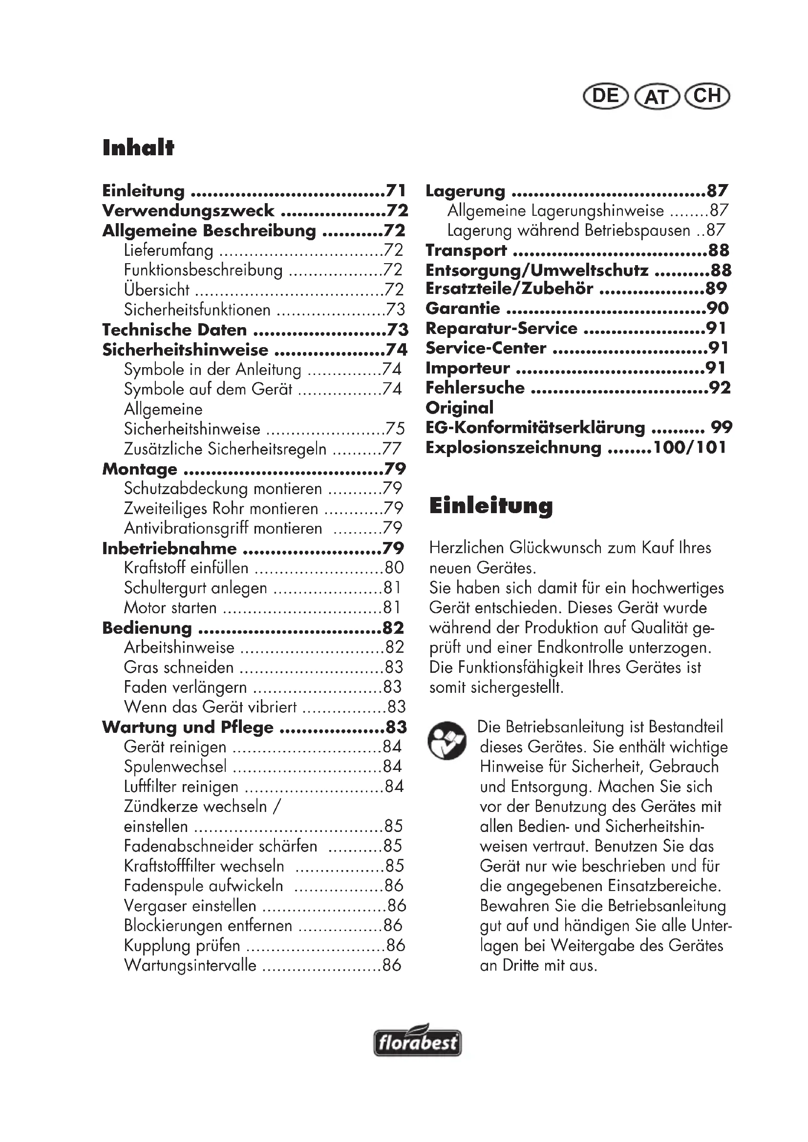 Garantie Sehr geehrte Kundin, sehr geehrter Kunde, Sie erhalten auf dieses Gerät 3 Jahre Ga- rantie ab Kaufdatum. Im Falle von Mängeln dieses Gerätes stehen Ihnen gegen den Verkäufer des Gerätes gesetzliche Rechte zu. Diese gesetzlichen Rechte werden durch unsere im Folgenden dargestellte Garantie nicht eingeschränkt. Garantiebedingungen Die Garantiefrist beginnt mit dem Kaufda- tum. Bitte bewahren Sie den original Kas- senbon gut auf. Diese Unterlage wird als Nachweis für den Kauf benötigt. Tritt innerhalb von drei Jahren ab dem Kauf- datum dieses Gerätes ein Material- oder Fabrikationsfehler auf, wird das Gerät von uns – nach unserer Wahl – für Sie kostenlos repariert oder ersetzt. Diese Garantieleis- tung setzt voraus, dass innerhalb der Drei- Jahres-Frist das defekte Gerät und der Kauf- beleg (Kassenbon) vorgelegt und schriftlich kurz beschrieben wird, worin der Mangel besteht und wann er aufgetreten ist. Wenn der Defekt von unserer Garantie gedeckt ist, erhalten Sie das reparierte oder ein neues Gerät zurück. Mit Reparatur oder Austausch des Gerätes beginnt kein neuer Garantiezeitraum. Garantiezeit und gesetzliche Mängelansprüche Die Garantiezeit wird durch die Gewähr- leistung nicht verlängert. Dies gilt auch für ersetzte und reparierte Teile. Eventuell schon beim Kauf vorhandene Schäden und Mängel müssen sofort nach dem Auspa- cken gemeldet werden. Nach Ablauf der Garantiezeit anfallende Reparaturen sind kostenpichtig. Garantieumfang Das Gerät wurde nach strengen Qualitäts- richtlinien sorgfältig produziert und vor Anlieferung gewissenhaft geprüft. Die Garantieleistung gilt für Material- oder Fabrikationsfehler. Diese Garantie erstreckt sich nicht auf Geräteteile, die normaler Abnutzung ausgesetzt sind und daher als Verschleißteile angesehen werden können (z.B. Fadenspule, Schneidfaden, Fadenab- schneider, Luftlter und Zündkerze) oder für Beschädigungen an zerbrechlichen Teilen (z.B. Schalter). Diese Garantie verfällt, wenn das Gerät beschädigt, nicht sachgemäß benutzt oder nicht gewartet wurde. Für eine sachgemäße Benutzung des Gerätes sind alle in der Be- triebsanleitung aufgeführten Anweisungen genau einzuhalten. Verwendungszwecke und Handlungen, von denen in der Betriebs- anleitung abgeraten oder vor denen gewarnt wird, sind unbedingt zu vermeiden. Das Gerät ist lediglich für den privaten und nicht für den gewerblichen Gebrauch bestimmt. Bei missbräuchlicher und unsach- gemäßer Behandlung, Gewaltanwendung und bei Eingriffen, die nicht von unserer autorisierten Service-Niederlassung vorge- nommen wurden, erlischt die Garantie. Abwicklung im Garantiefall Um eine schnelle Bearbeitung Ihres Anlie- gens zu gewährleisten, folgen Sie bitte den folgenden Hinweisen: