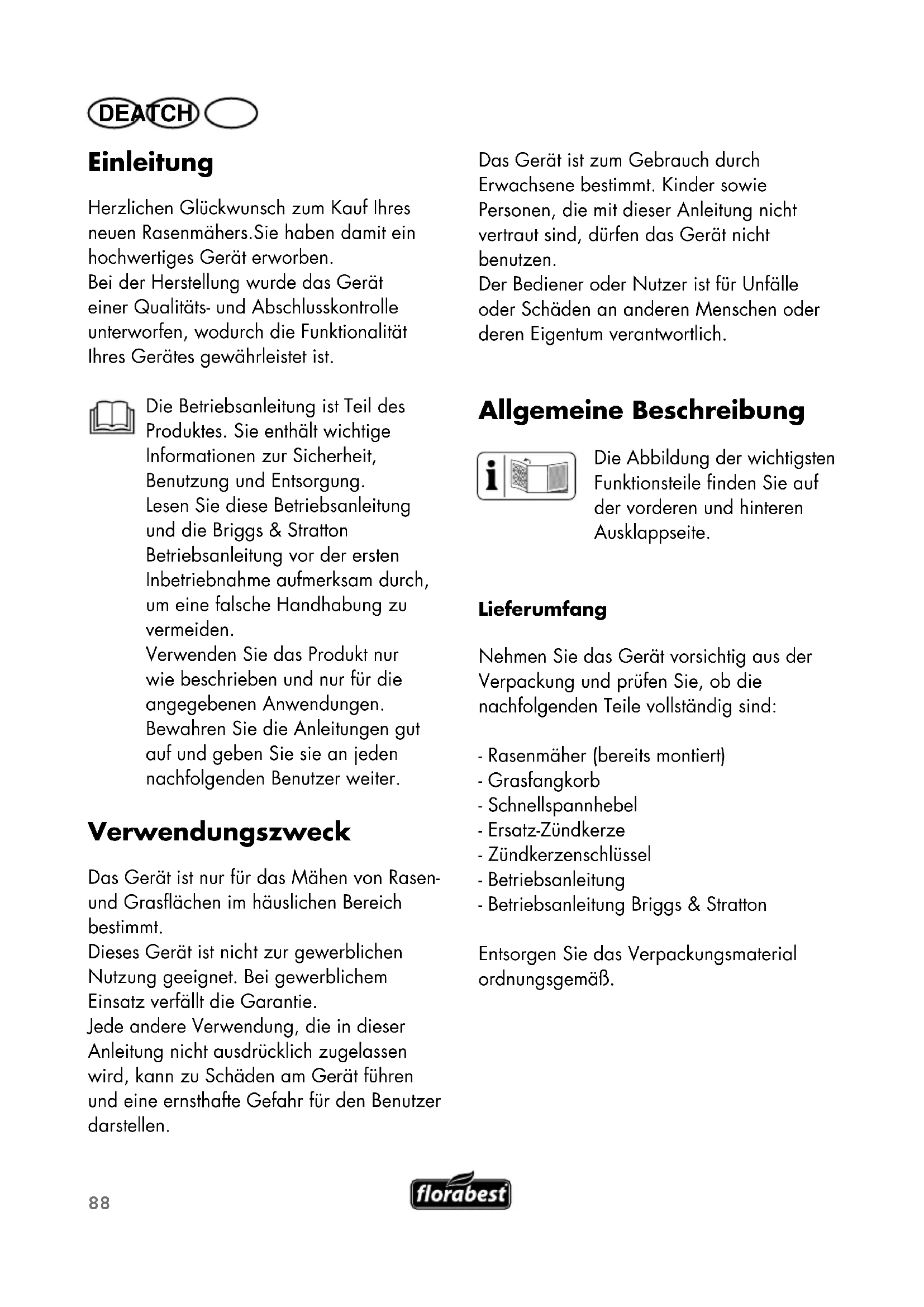 - Importeur Original EU Konformitätserklärung…… …10988 DE AT CH Einleitung Herzlichen Glückwunsch zum Kauf Ihres neuen Rasenmähers.Sie haben damit ein hochwertiges Gerät erworben. Bei der Herstellung wurde das Gerät einer Qualitäts- und Abschlusskontrolle unterworfen, wodurch die Funktionalität Ihres Gerätes gewährleistet ist. Die Betriebsanleitung ist Teil des Produktes. Sie enthält wichtige Informationen zur Sicherheit, Benutzung und Entsorgung. Lesen Sie diese Betriebsanleitung und die Briggs & Stratton Betriebsanleitung vor der ersten Inbetriebnahme aufmerksam durch, um eine falsche Handhabung zu vermeiden. Verwenden Sie das Produkt nur wie beschrieben und nur für die angegebenen Anwendungen. Bewahren Sie die Anleitungen gut auf und geben Sie sie an jeden nachfolgenden Benutzer weiter. Verwendungszweck Das Gerät ist nur für das Mähen von Rasen- und Grasflächen im häuslichen Bereich bestimmt. Dieses Gerät ist nicht zur gewerblichen Nutzung geeignet. Bei gewerblichem Einsatz verfällt die Garantie. Jede andere Verwendung, die in dieser Anleitung nicht ausdrücklich zugelassen wird, kann zu Schäden am Gerät führen und eine ernsthafte Gefahr für den Benutzer darstellen. Das Gerät ist zum Gebrauch durch Erwachsene bestimmt. Kinder sowie Personen, die mit dieser Anleitung nicht vertraut sind, dürfen das Gerät nicht benutzen. Der Bediener oder Nutzer ist für Unfälle oder Schäden an anderen Menschen oder deren Eigentum verantwortlich. Allgemeine Beschreibung Die Abbildung der wichtigsten Funktionsteile finden Sie auf der vorderen und hinteren Ausklappseite. Lieferumfang Nehmen Sie das Gerät vorsichtig aus der Verpackung und prüfen Sie, ob die nachfolgenden Teile vollständig sind: - Rasenmäher (bereits montiert) - Grasfangkorb - Schnellspannhebel - Ersatz-Zündkerze - Zündkerzenschlüssel - Betriebsanleitung - Betriebsanleitung Briggs & Stratton Entsorgen Sie das Verpackungsmaterial ordnungsgemäß.89 DE AT CH Übersicht 1 Oberer Griffholm 2 Sicherheitsbügel 3 Starterseil-Führung 4 Unterer Griffholm 5 Bowdenzug 6 Kabelklemme 7 Startergriff mit Starterseil 8 Tankdeckel 9 Luftfilterbox 10 Luftfilter (ohne Abbildung) 11 Motorabdeckung mit Lüftungsschlitzen (Fingerschutz) 12 Zündkerzenstecker 13 Zündkerze (ohne Abbildung) 14 Auspuffschutz 15 2 Vorderräder 16 Stahlblechgehäuse 17 Hebel zur Schnittstellen- Einstellung 18 Hinterräder (x2) 19 Öltankkappe mit Ölmessstab 20 Grasfangkorb 21 2 Schnellspannhebel zur Holmbefestigung unten 22 Hinterer Prallschutz 23 Tragegriff Grasfangkorb 23a Unterer Griff zum Entleeren des Grasfangkorbs (ohne Abbildung) 24 Füllstandsanzeige 25 2 Schnellspannhebel zur Holmbefestigung am oberen Griff 26 Ersatz-Zündkerze 27 Zündkerzenschlüssel 28 Plastikstrips Fangkorb 29 Fangkorbstange 30 Grasfangkorb Aufhängung 31 Einfüllstutzen 32 Benzinpumpe (Primer) 33 Position Schnitthöhe Funktionsbeschreibung Das Gerät wird mit einem leistungsfähigen 4-Takt-Motor (Briggs & Stratton 450 E Series) angetrieben. Das Gerät ist mit einem hochwertigen Stahlblechgehäuse, einem Grasfangkorb und einem zusammenklappbaren Griffholm ausgestattet. Die Funktion der Bedienteile entnehmen Sie bitte den nachfolgenden Beschreibungen. Schutzeinrichtungen 2 Sicherheitsbügel Bei Loslassen des Sicherheits- bügels stoppt das Gerät. 14 Auspuffschutz Verhindert, dass Hände oder brennbare Materialien mit einem heißen Auspuff in Kontakt kommen. 22 Hinterer Prallschutz Schützt die Bedienperson vor weggeschleuderten Teilen und vor unbeabsichtigter Messerberührung, wenn ohne Grasfangkorb gemäht wird. p. 108
