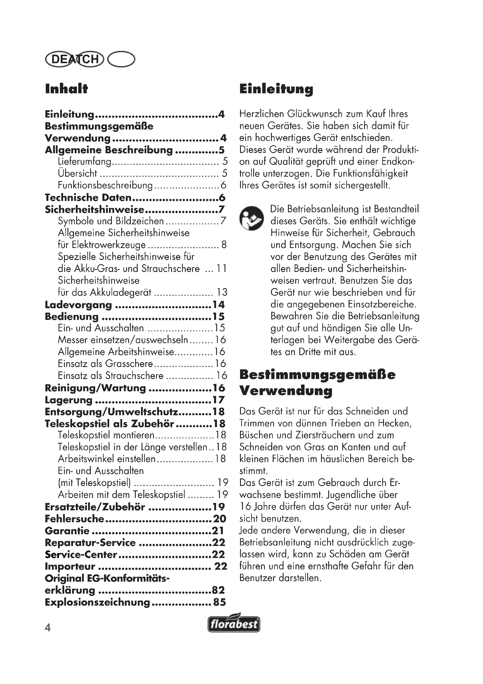 - DE AT CH Einleitung Herzlichen Glückwunsch zum Kauf Ihres neuen Gerätes. Sie haben sich damit für ein hochwertiges Gerät entschieden. Dieses Gerät wurde während der Produkti- on auf Qualität geprüft und einer Endkon- trolle unterzogen. Die Funktionsfähigkeit Ihres Gerätes ist somit sichergestellt. Die Betriebsanleitung ist Bestandteil dieses Geräts. Sie enthält wichtige Hinweise für Sicherheit, Gebrauch und Entsorgung. Machen Sie sich vor der Benutzung des Gerätes mit allen Bedien- und Sicherheitshin- weisen vertraut. Benutzen Sie das Gerät nur wie beschrieben und für die angegebenen Einsatzbereiche. Bewahren Sie die Betriebsanleitung gut auf und händigen Sie alle Un- terlagen bei Weitergabe des Gerä- tes an Dritte mit aus. Bestimmungsgemäße Verwendung Das Gerät ist nur für das Schneiden und Trimmen von dünnen Trieben an Hecken, Büschen und Ziersträuchern und zum Schneiden von Gras an Kanten und auf kleinen Flächen im häuslichen Bereich be- stimmt. Das Gerät ist zum Gebrauch durch Er- wachsene bestimmt. Jugendliche über 16Jahre dürfen das Gerät nur unter Auf- sicht benutzen. Jede andere Verwendung, die in dieser Betriebsanleitung nicht ausdrücklich zuge- lassen wird, kann zu Schäden am Gerät führen und eine ernsthafte Gefahr für den Benutzer darstellen. Inhalt Einleitung p. 4