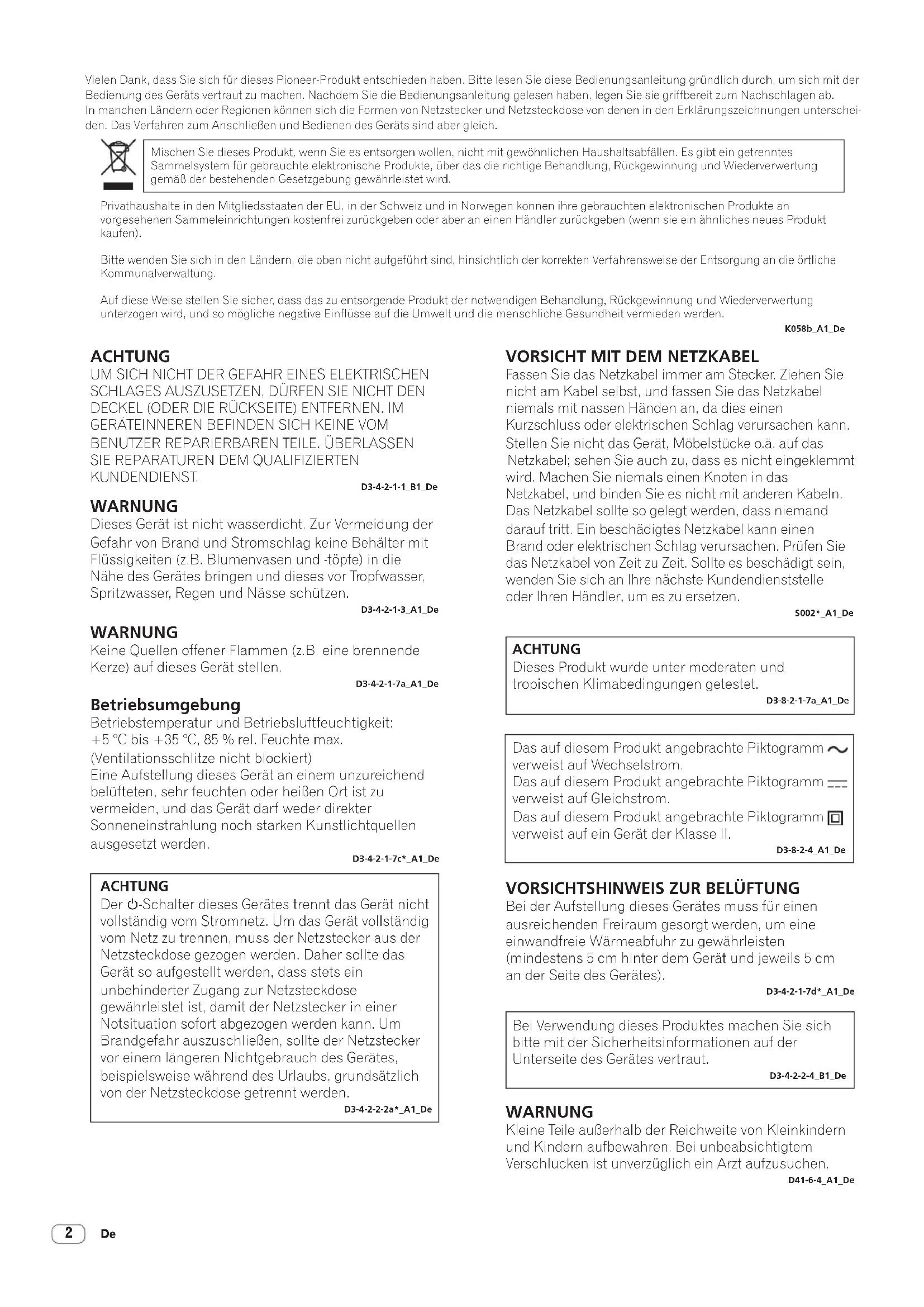 Vielen Dank, dass Sie sich für dieses Pioneer-Produkt entschieden haben. Bitte lesen Sie diese Bedienungsanleitung gründlich durch, um sich mit der Bedienung des Geräts vertraut zu machen. Nachdem Sie die Bedienungsanleitung gelesen haben, legen Sie sie griffbereit zum Nachschlagen ab. In manchen Ländern oder Regionen können sich die Formen von Netzstecker und Netzsteckdose von denen in den Erklärungszeichnungen unterschei- den. Das Verfahren zum Anschließen und Bedienen des Geräts sind aber gleich. Mischen Sie dieses Produkt, wenn Sie es entsorgen wollen, nicht mit gewöhnlichen Haushaltsabfällen. Es gibt ein getrenntes Sammelsystem für gebrauchte elektronische Produkte, über das die richtige Behandlung, Rückgewinnung und Wiederverwertung gemäß der bestehenden Gesetzgebung gewährleistet wird. Privathaushalte in den Mitgliedsstaaten der EU, in der Schweiz und in Norwegen können ihre gebrauchten elektronischen Produkte an vorgesehenen Sammeleinrichtungen kostenfrei zurückgeben oder aber an einen Händler zurückgeben (wenn sie ein ähnliches neues Produkt kaufen). Bitte wenden Sie sich in den Ländern, die oben nicht aufgeführt sind, hinsichtlich der korrekten Verfahrensweise der Entsorgung an die örtliche Kommunalverwaltung. Auf diese Weise stellen Sie sicher, dass das zu entsorgende Produkt der notwendigen Behandlung, Rückgewinnung und Wiederverwertung unterzogen wird, und so mögliche negative Einflüsse auf die Umwelt und die menschliche Gesundheit vermieden werden. K058b_A1_De ACHTUNG UM SICH NICHT DER GEFAHR EINES ELEKTRISCHEN SCHLAGES AUSZUSETZEN, DÜRFEN SIE NICHT DEN DECKEL (ODER DIE RÜCKSEITE) ENTFERNEN. IM