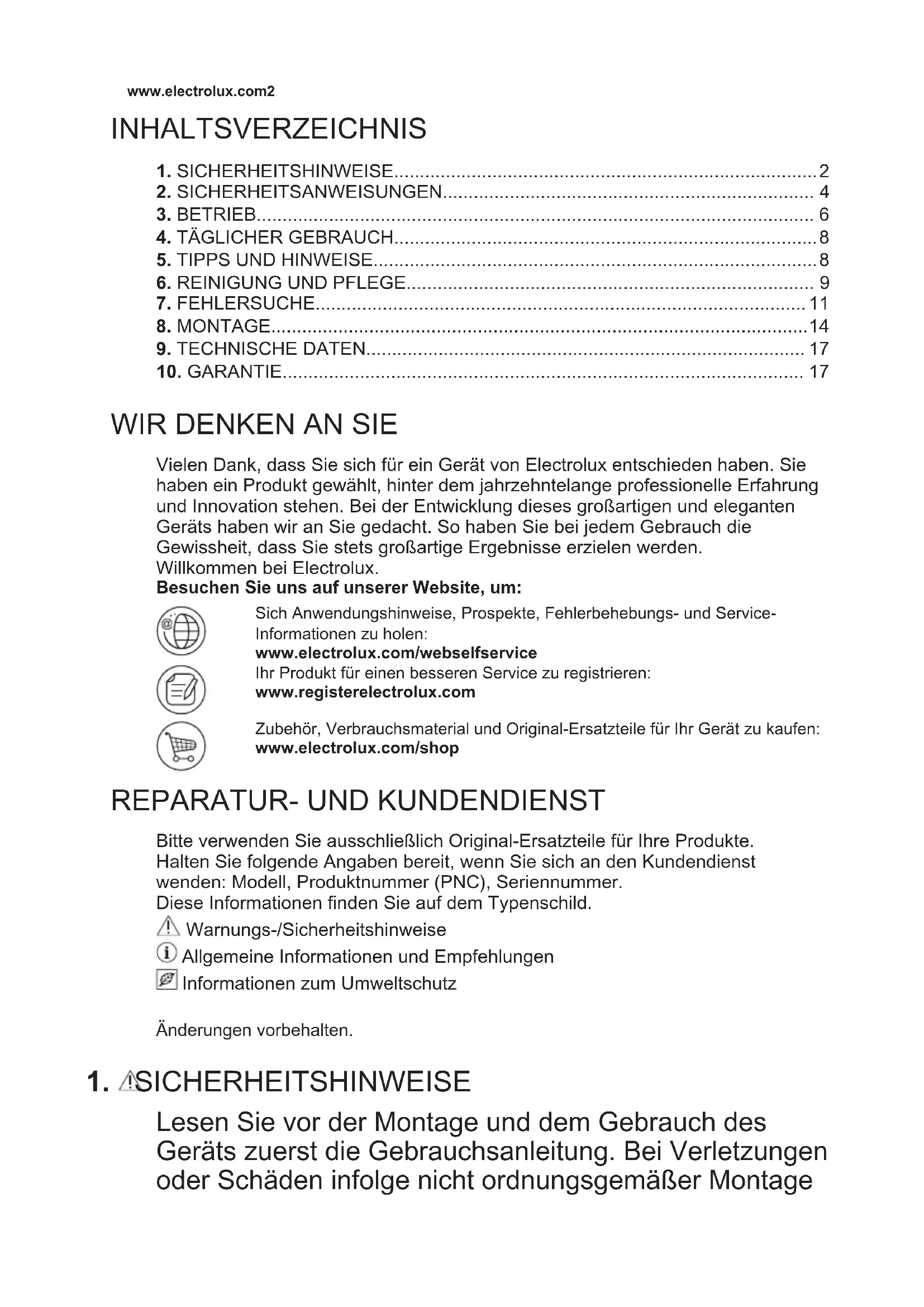 Vielen Dank, dass Sie sich für ein Gerät von Electrolux entschieden haben. Sie haben ein Produkt gewählt, hinter dem jahrzehntelange professionelle Erfahrung und Innovation stehen. Bei der Entwicklung dieses großartigen und eleganten Geräts haben wir an Sie gedacht. So haben Sie bei jedem Gebrauch die Gewissheit, dass Sie stets großartige Ergebnisse erzielen werden. Willkommen bei Electrolux. Besuchen Sie uns auf unserer Website, um: Sich Anwendungshinweise, Prospekte, Fehlerbehebungs- und Service- Informationen zu holen: www.electrolux.com/webselfservice Ihr Produkt für einen besseren Service zu registrieren: www.registerelectrolux.com Zubehör, Verbrauchsmaterial und Original-Ersatzteile für Ihr Gerät zu kaufen: www.electrolux.com/shop