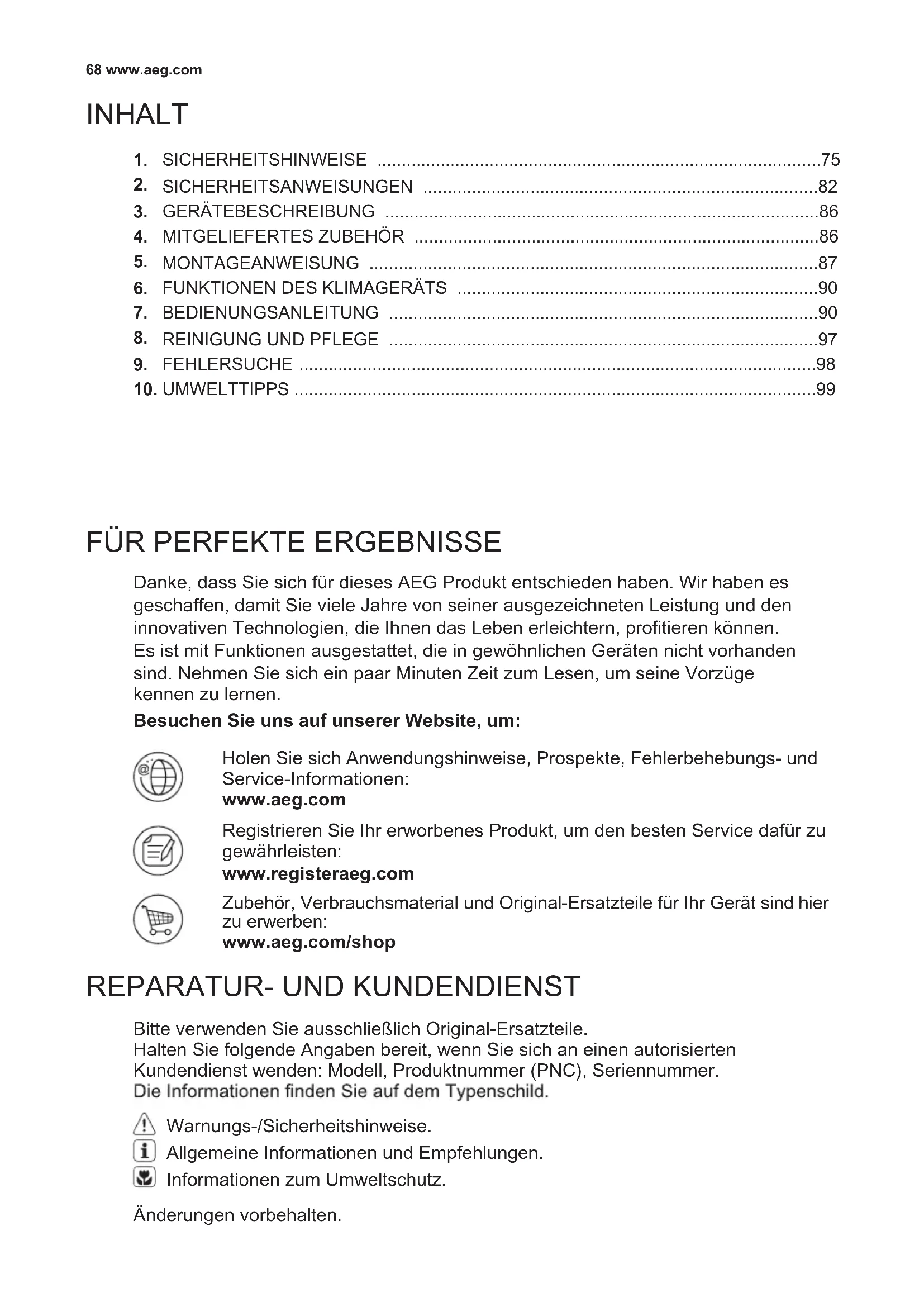 Bitte verwenden Sie ausschließlich Original-Ersatzteile. Halten Sie folgende Angaben bereit, wenn Sie sich an einen autorisierten Kundendienst wenden: Modell, Produktnummer (PNC), Seriennummer. Besuchen Sie uns auf unserer Website, um: Holen Sie sich Anwendungshinweise, Prospekte, Fehlerbehebungs- und Service-Informationen: www.aeg.com Registrieren Sie Ihr erworbenes Produkt, um den besten Service dafür zu gewährleisten: www.registeraeg.com Zubehör, Verbrauchsmaterial und Original-Ersatzteile für Ihr Gerät sind hier zu erwerben: www.aeg.com/shop