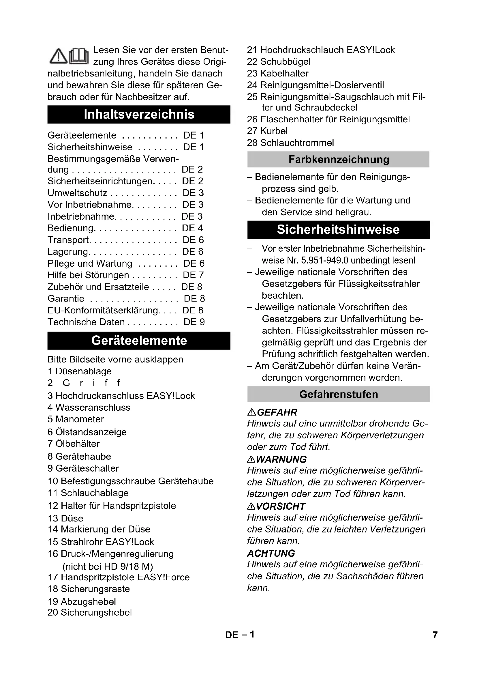 • Vor erster Inbetriebnahme Sicherheitshin- weise Nr. 5.951-949.0 unbedingt lesen! – Jeweilige nationale Vorschriften des Gesetzgebers für Flüssigkeitsstrahler beachten. – Jeweilige nationale Vorschriften des Gesetzgebers zur Unfallverhütung be- achten. Flüssigkeitsstrahler müssen re- gelmäßig geprüft und das Ergebnis der Prüfung schriftlich festgehalten werden. – Am Gerät/Zubehör dürfen keine Verän- derungen vorgenommen werden. GEFAHR Hinweis auf eine unmittelbar drohende Ge- fahr, die zu schweren Körperverletzungen oder zum Tod führt. 몇 WARNUNG Hinweis auf eine möglicherweise gefährli- che Situation, die zu schweren Körperver- letzungen oder zum Tod führen kann. 몇 VORSICHT Hinweis auf eine möglicherweise gefährli- che Situation, die zu leichten Verletzungen führen kann. ACHTUNG Hinweis auf eine möglicherweise gefährli- che Situation, die zu Sachschäden führen kann. Inhaltsverzeichnis Geräteelemente DE 1 Sicherheitshinweise DE 1 Bestimmungsgemäße Verwen- dung DE 2 Sicherheitseinrichtungen DE 2 Umweltschutz DE 3 Vor Inbetriebnahme DE 3 Inbetriebnahme DE 3 Bedienung DE 4 Transport DE 6 Lagerung DE 6 Pflege und Wartung DE 6 Hilfe bei Störungen DE 7 Zubehör und Ersatzteile DE 8 Garantie DE 8 EU-Konformitätserklärung DE 8 Technische Daten DE 9 Geräteelemente Farbkennzeichnung Sicherheitshinweise Gefahrenstufen 7DE– 2 Hochdruckstrahlen können bei unsachgemäßem Gebrauch ge- fährlich sein. Der Strahl darf nicht auf Per- sonen, Tiere, aktive elektrische Ausrüstung oder auf das Gerät selbst gerichtet werden. Gemäß gültiger Vorschriften darf das Gerät nie ohne Systemtrenner am Trinkwassernetz betrieben werden. Es ist ein geeigneter Sys- temtrenner der Fa. KÄRCHER oder alter- nativ ein Systemtrenner gemäß EN 12729 Typ BA zu verwenden. Wasser, das durch einen Systemtrenner ge- flossen ist, wird als nicht trinkbar eingestuft. 몇 VORSICHT Systemtrenner immer an der Wasserversor- gung, niemals direkt am Gerät anschließen. Diesen Hochdruckreiniger ausschließlich verwenden – zum Reinigen mit dem Niederdruck- strahl und Reinigungsmittel (z.B. Reini- gen von Maschinen, Fahrzeugen, Bau- werken, Werkzeugen), – zum Reinigen mit Hochdruckstrahl ohne Reinigungsmittel (z.B. Reinigen von Fassa- den, Terrassen, Gartengeräten). Für hartnäckige Verschmutzungen empfeh- len wir den Dreckfräser als Sonderzubehör. Bei HD