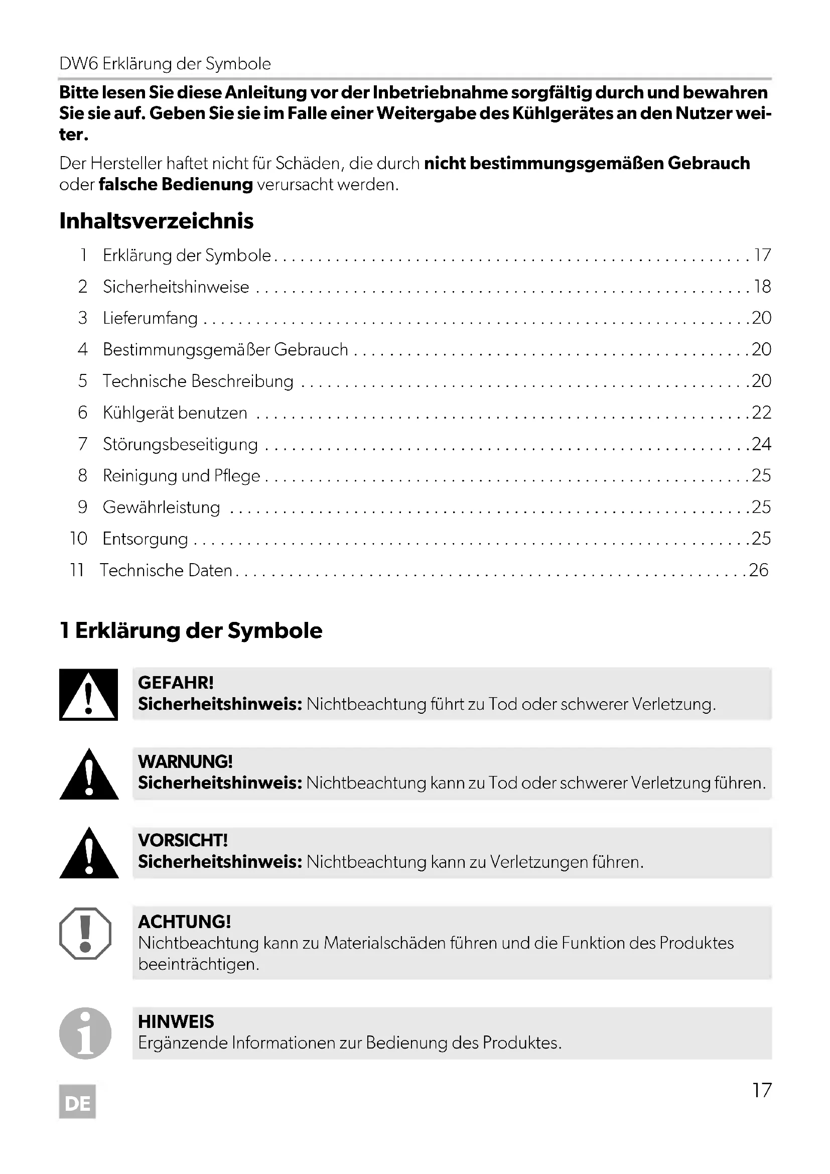 - Bitte lesen Sie diese Anleitung vor der Inbetriebnahme sorgfältig durch und bewahren Sie sie auf. Geben Sie sie im Falle einer Weitergabe des Kühlgerätes an den Nutzer wei- ter. Der Hersteller haftet nicht für Schäden, die durch nicht bestimmungsgemäßen Gebrauch oder falsche Bedienung verursacht werden. Inhaltsverzeichnis 1 Erklärung der Symbole p. 17