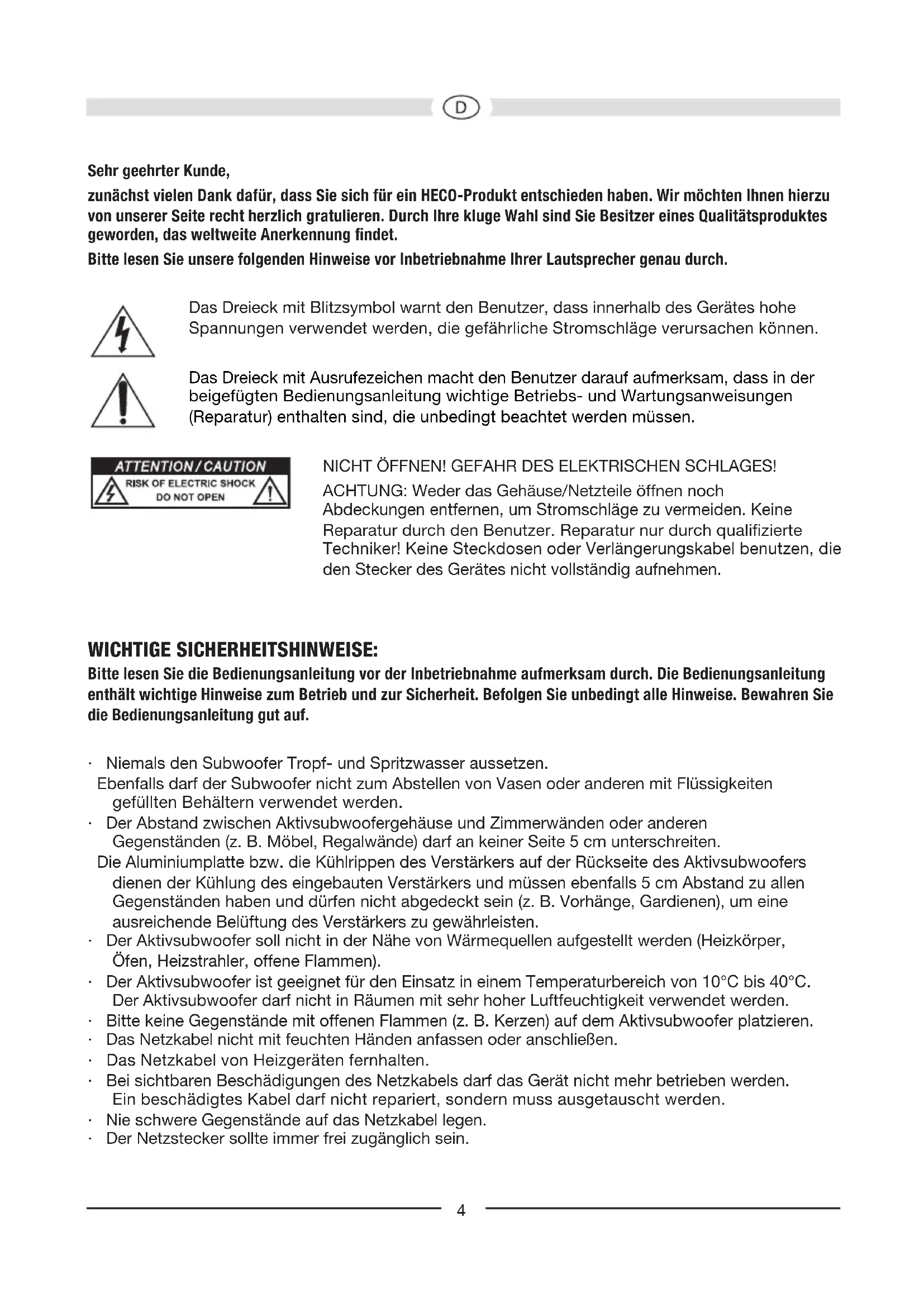 Abbildungen/Illustrations4 Sehr geehrter Kunde, zunächst vielen Dank dafür, dass Sie sich für ein HECO-Produkt entschieden haben. Wir möchten Ihnen hierzu von unserer Seite recht herzlich gratulieren. Durch Ihre kluge Wahl sind Sie Besitzer eines Qualitätsproduktes geworden, das weltweite Anerkennung ndet. Bitte lesen Sie unsere folgenden Hinweise vor Inbetriebnahme Ihrer Lautsprecher genau durch. Das Dreieck mit Blitzsymbol warnt den Benutzer, dass innerhalb des Gerätes hohe Spannungen verwendet werden, die gefährliche Stromschläge verursachen können. Das Dreieck mit Ausrufezeichen macht den Benutzer darauf aufmerksam, dass in der beigefügten Bedienungsanleitung wichtige Betriebs- und Wartungsanweisungen (Reparatur) enthalten sind, die unbedingt beachtet werden müssen. NICHT ÖFFNEN! GEFAHR DES ELEKTRISCHEN SCHLAGES! ACHTUNG: Weder das Gehäuse/Netzteile öffnen noch Abdeckungen entfernen, um Stromschläge zu vermeiden. Keine Reparatur durch den Benutzer. Reparatur nur durch qualizierte Techniker! Keine Steckdosen oder Verlängerungskabel benutzen, die den Stecker des Gerätes nicht vollständig aufnehmen. WICHTIGE SICHERHEITSHINWEISE: Bitte lesen Sie die Bedienungsanleitung vor der Inbetriebnahme aufmerksam durch. Die Bedienungsanleitung enthält wichtige Hinweise zum Betrieb und zur Sicherheit. Befolgen Sie unbedingt alle Hinweise. Bewahren Sie die Bedienungsanleitung gut auf.