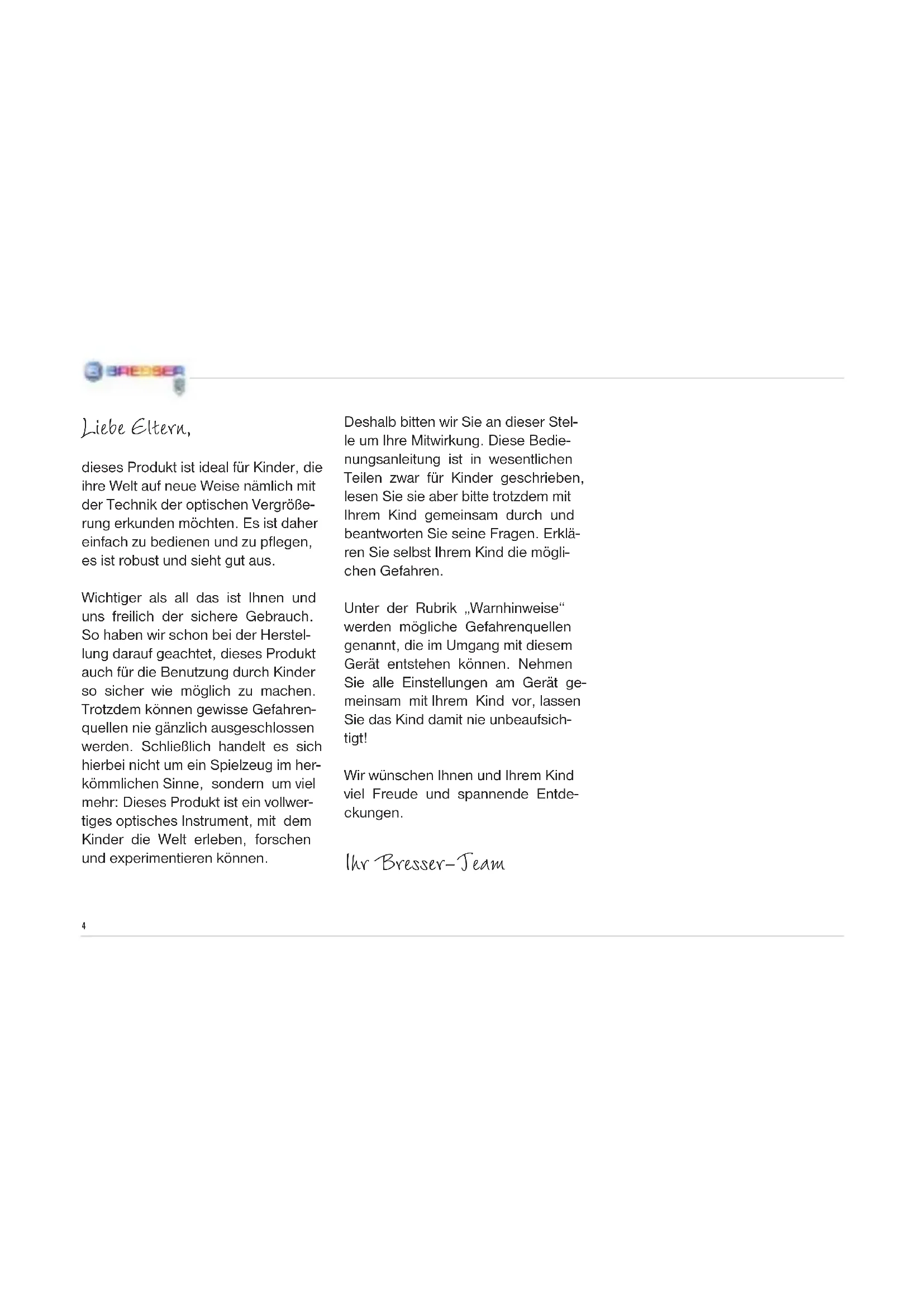 Fig. 1 Fig. 2 Fig. 3 Fig. 44 Liebe Eltern, dieses Produkt ist ideal für Kinder, die ihre Welt auf neue Weise nämlich mit der Technik der optischen Vergröße- rung erkunden möchten. Es ist daher einfach zu bedienen und zu pegen, es ist robust und sieht gut aus. Wichtiger als all das ist Ihnen und uns freilich der sichere Gebrauch. So haben wir schon bei der Herstel- lung darauf geachtet, dieses Produkt auch für die Benutzung durch Kinder so sicher wie möglich zu machen. Trotzdem können gewisse Gefahren- quellen nie gänzlich ausgeschlossen werden. Schließlich handelt es sich hierbei nicht um ein Spielzeug im her- kömmlichen Sinne, sondern um viel mehr: Dieses Produkt ist ein vollwer- tiges optisches Instrument, mit dem Kinder die Welt erleben, forschen und experimentieren können. Deshalb bitten wir Sie an dieser Stel- le um Ihre Mitwirkung. Diese Bedie- nungsanleitung ist in wesentlichen Teilen zwar für Kinder geschrieben, lesen Sie sie aber bitte trotzdem mit Ihrem Kind gemeinsam durch und beantworten Sie seine Fragen. Erklä- ren Sie selbst Ihrem Kind die mögli- chen Gefahren. Unter der Rubrik „Warnhinweise“ werden mögliche Gefahrenquellen genannt, die im Umgang mit diesem Gerät entstehen können. Nehmen Sie alle Einstellungen am Gerät ge- meinsam mit Ihrem Kind vor, lassen Sie das Kind damit nie unbeaufsich- tigt! Wir wünschen Ihnen und Ihrem Kind viel Freude und spannende Entde- ckungen. Ihr Bresser-Team5