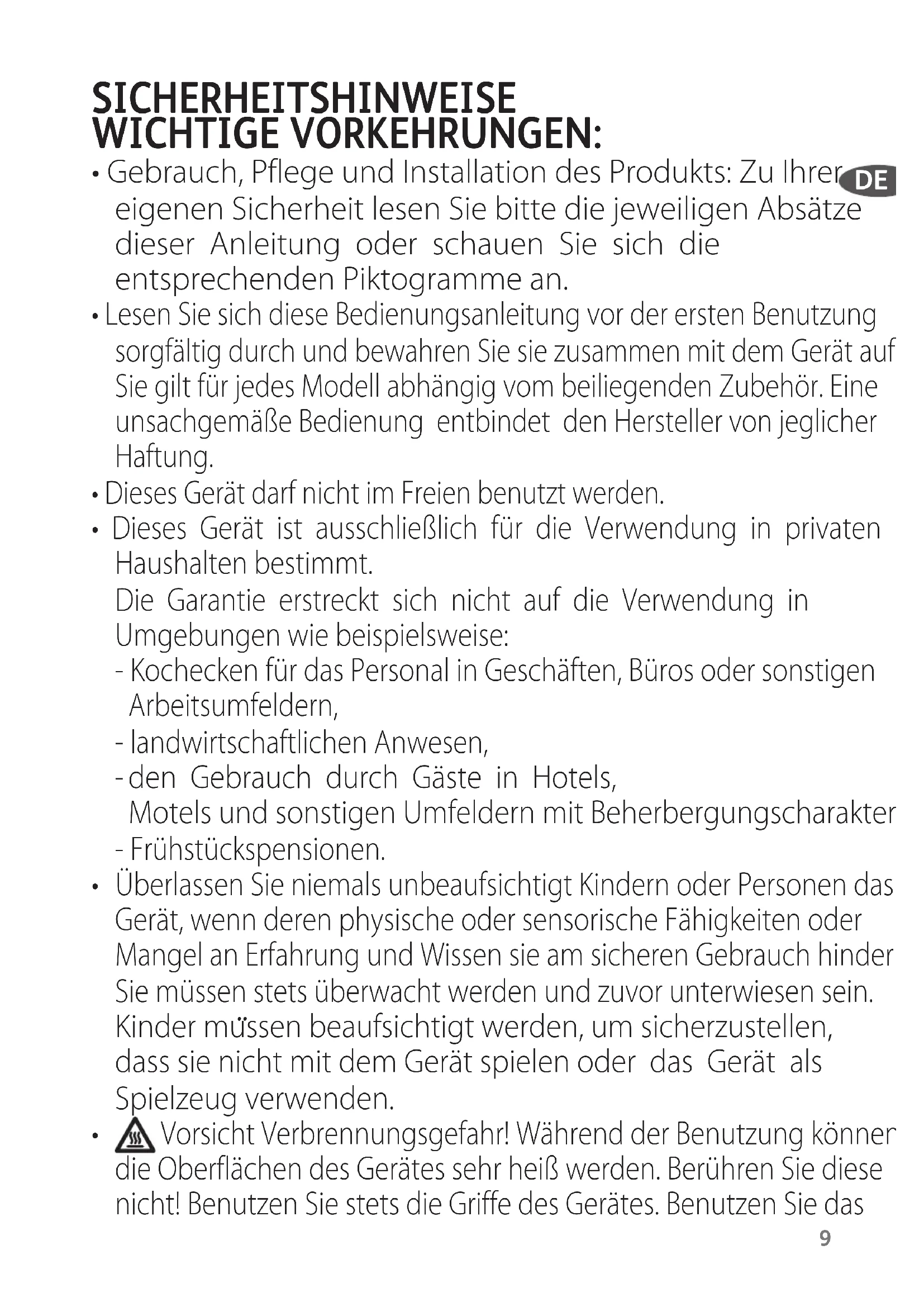 - Vorsicht Verbrennungsgefahr! Während der Benutzung können die Oberflächen des Gerätes sehr heiß werden. Berühren Sie diese nicht! Benutzen Sie stets die Griffe des Gerätes. Benutzen Sie das