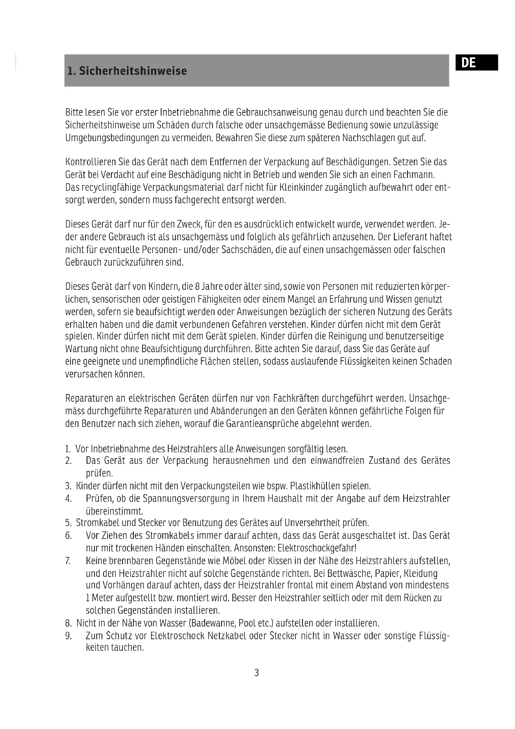 1. Vor Inbetriebnahme des Heizstrahlers alle Anweisungen sorgfältig lesen.