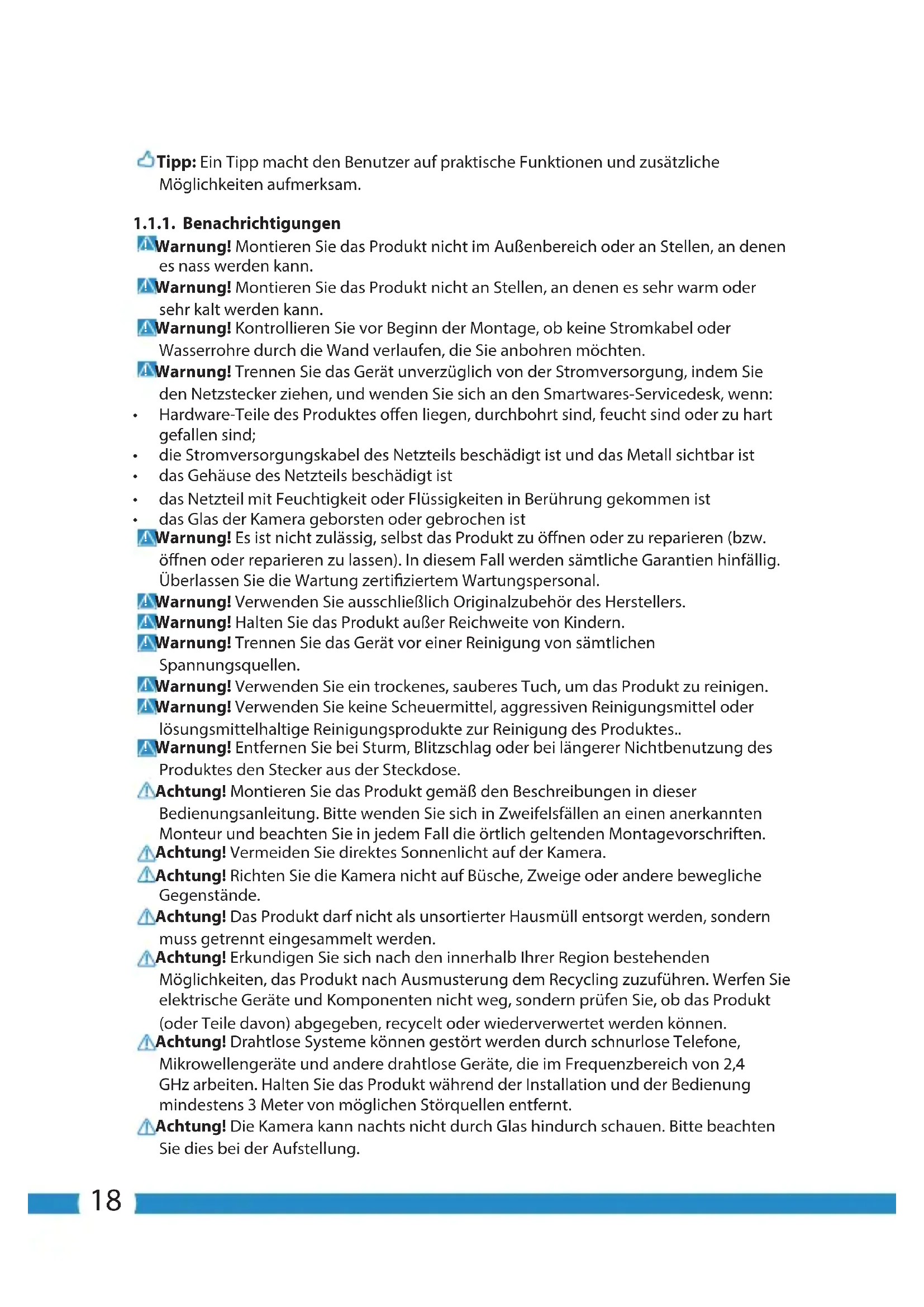 Warnung! Entfernen Sie bei Sturm, Blitzschlag oder bei längerer Nichtbenutzung des Produktes den Stecker aus der Steckdose. Achtung! Montieren Sie das Produkt gemäß den Beschreibungen in dieser Bedienungsanleitung. Bitte wenden Sie sich in Zweifelsfällen an einen anerkannten Monteur und beachten Sie in jedem Fall die örtlich geltenden Montagevorschriften. Achtung! Vermeiden Sie direktes Sonnenlicht auf der Kamera. Achtung! Richten Sie die Kamera nicht auf Büsche, Zweige oder andere bewegliche Gegenstände. Achtung! Das Produkt darf nicht als unsortierter Hausmüll entsorgt werden, sondern muss getrennt eingesammelt werden. Achtung! Erkundigen Sie sich nach den innerhalb Ihrer Region bestehenden Möglichkeiten, das Produkt nach Ausmusterung dem Recycling zuzuführen. Werfen Sie elektrische Geräte und Komponenten nicht weg, sondern prüfen Sie, ob das Produkt (oder Teile davon) abgegeben, recycelt oder wiederverwertet werden können. Achtung! Drahtlose Systeme können gestört werden durch schnurlose Telefone, Mikrowellengeräte und andere drahtlose Geräte, die im Frequenzbereich von 2,4 GHz arbeiten. Halten Sie das Produkt während der Installation und der Bedienung mindestens 3 Meter von möglichen Störquellen entfernt. Achtung! Die Kamera kann nachts nicht durch Glas hindurch schauen. Bitte beachten Sie dies bei der Aufstellung.19