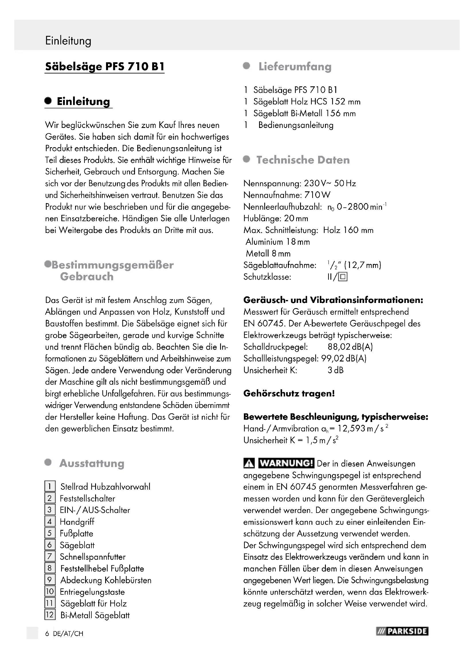 85 DE/AT/CH Inhaltsverzeichnis Einleitung Bestimmungsgemäßer Gebrauch .......................................................................................................Seite 6 Ausstattung ..........................................................................................................................................Seite 6 Lieferumfang ........................................................................................................................................ Seite 6 Technische Daten ................................................................................................................................Seite 6 Allgemeine Sicherheitshinweise für Elektrowerkzeuge 1. Arbeitsplatz-Sicherheit .................................................................................................................... Seite 7 2. Elektrische Sicherheit ......................................................................................................................Seite 7 3. Sicherheit von Personen .................................................................................................................Seite 7 4. Verwendung und Behandlung des Elektrowerkzeugs ..................................................................Seite 8 5. Service .............................................................................................................................................Seite 9 Gerätespezifische Sicherheitshinweise für Säbelsägen ....................................................................Seite 9 Originalzubehör / -zusatzgeräte ........................................................................................................Seite 9 Informationen zu Sägeblättern ...........................................................................................................Seite 9 Vor der Inbetriebnahme Sägeblatt montieren / wechseln .........................................................................................................Seite 10 Gerätegriff drehen ..............................................................................................................................Seite 10 Fußplatte verstellen .............................................................................................................................Seite 10 Hubzahlvorwahl ..................................................................................................................................Seite 10 Inbetriebnahme Ein- und ausschalten ............................................................................................................................Seite 10 Säbelsäge sicher führen .....................................................................................................................Seite 10 Arbeitshinweise zum Sägen ...............................................................................................................Seite 11 Wartung und Reinigung .....................................................................................................Seite 11 Service ...............................................................................................................................................Seite 11 Garantie ........................................................................................................................................... Seite 12 Entsorgung .....................................................................................................................................Seite 12 Original-EG-Konformitätserklärung / Hersteller ............................................Seite 136 DE/AT/CH Einleitung Einleitung / Allgemeine Sicherheitshinweise für Elektrowerkzeuge Säbelsäge PFS 710 B1 Einleitung Wir beglückwünschen Sie zum Kauf Ihres neuen Gerätes. Sie haben sich damit für ein hochwertiges Produkt entschieden. Die Bedienungsanleitung ist Teil dieses Produkts. Sie enthält wichtige Hinweise für Sicherheit, Gebrauch und Entsorgung. Machen Sie sich vor der Benutzung des Produkts mit allen Bedien- und Sicherheitshinw eisen vertraut. Benutzen Sie das Produkt nur wie beschrieben und für die angegebe- nen Einsatzbereiche. Händigen Sie alle Unterlagen bei Weitergabe des Produkts an Dritte mit aus. Bestimmungsgemäßer Gebrauch Das Gerät ist mit festem Anschlag zum Sägen, Ablängen und Anpassen von Holz, Kunststoff und Baustoffen bestimmt. Die Säbelsäge eignet sich für grobe Sägearbeiten, gerade und kurvige Schnitte und trennt Flächen bündig ab. Beachten Sie die In- formationen zu Sägeblättern und Arbeitshinweise zum Sägen. Jede andere Verwendung oder Veränderung der Maschine gilt als nicht bestimmungsgemäß und birgt erhebliche Unfallgefahren. Für aus bestimmungs-