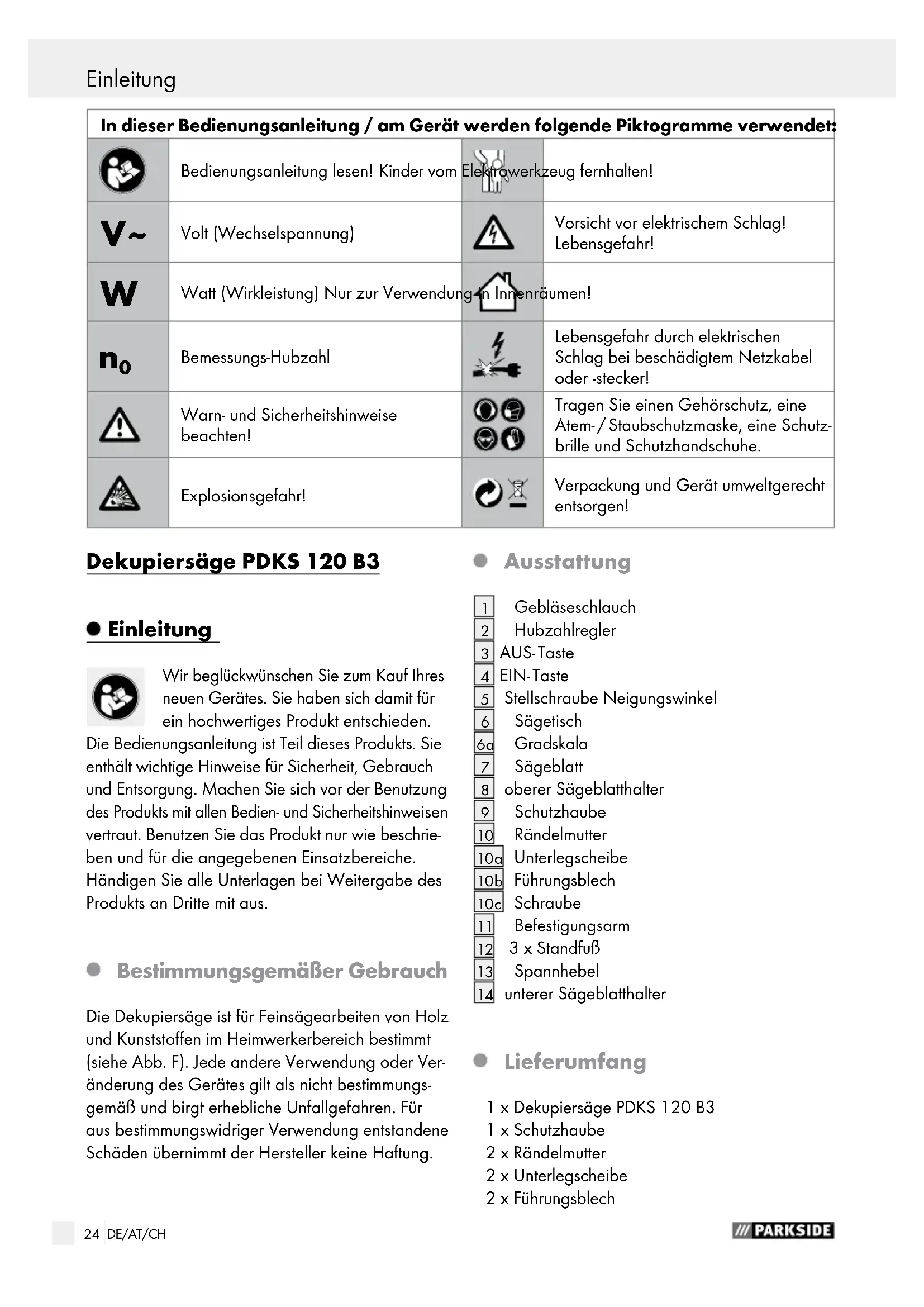 Gebläseschlauch Hubzahlregler AUS- Taste EIN- Taste Stellschraube Neigungswinkel Sägetisch 6 a Gradskala Sägeblatt oberer Sägeblatthalter Schutzhaube Rändelmutter 10 a Unterlegscheibe 10 b Führungsblech 10 c Schraube Befestigungsarm 3 x Standfuß Spannhebel unterer Sägeblatthalter Lieferumfang 1 x Dekupiersäge PDKS 120 B3 1 x Schutzhaube 2 x Rändelmutter 2 x Unterlegscheibe 2 x Führungsblech Einleitung In dieser Bedienungsanleitung / am Gerät werden folgende Piktogramme verwendet:Bedienungsanleitung lesen! Kinder vom Elektrowerkzeug fernhalten!