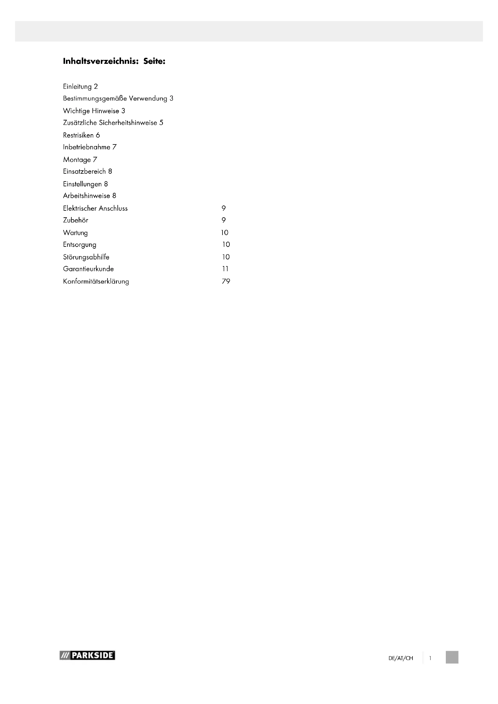 Fig. 61 DE/AT/CH Inhaltsverzeichnis: Seite: Einleitung 2 Bestimmungsgemäße Verwendung 3 Wichtige Hinweise 3 Zusätzliche Sicherheitshinweise 5 Restrisiken 6 Inbetriebnahme 7 Montage 7 Einsatzbereich 8 Einstellungen 8 Arbeitshinweise 8 Elektrischer Anschluss 9 Zubehör 9 Wartung 10 Entsorgung 10 Störungsabhilfe 10 Garantieurkunde 11 Konformitätserklärung 792 DE/AT/CH Einleitung HERSTELLER: scheppach Fabrikation von Holzbearbeitungsmaschine GmbH Günzburger Straße 69 D-89335 Ichenhausen VEREHRTER KUNDE, Wir wünschen Ihnen viel Freude und Erfolg beim Arbeiten mit Ihrem neuen Gerät. Hinweis: Der Hersteller dieses Gerätes haftet nach dem geltenden Produkthaftungsgesetz nicht für Schäden, die an diesem Gerät oder durch dieses Gerät entstehen bei: