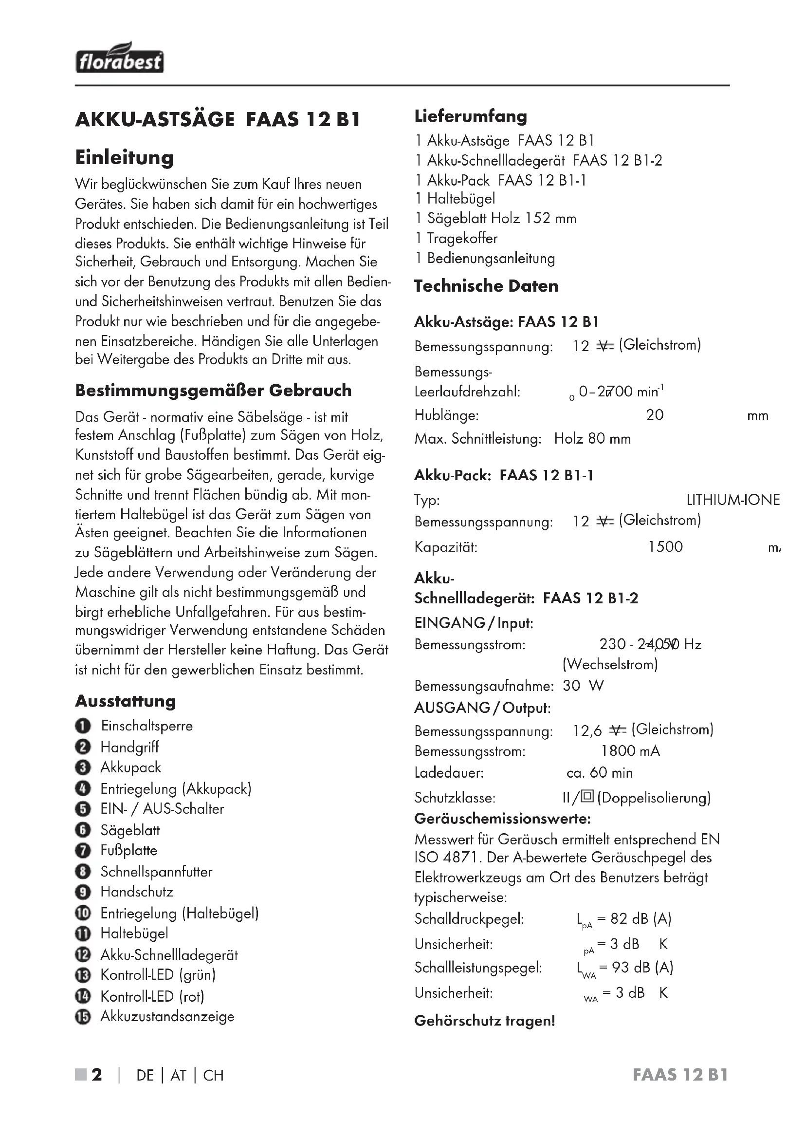 Einleitung Wir beglückwünschen Sie zum Kauf Ihres neuen Gerätes. Sie haben sich damit für ein hochwertiges Produkt entschieden. Die Bedienungsanleitung ist Teil dieses Produkts. Sie enthält wichtige Hinweise für Sicherheit, Gebrauch und Entsorgung. Machen Sie sich vor der Benutzung des Produkts mit allen Bedien- und Sicherheitshinweisen vertraut. Benutzen Sie das Produkt nur wie beschrieben und für die angegebe- nen Einsatzbereiche. Händigen Sie alle Unterlagen bei Weitergabe des Produkts an Dritte mit aus. Bestimmungsgemäßer Gebrauch Das Gerät - normativ eine Säbelsäge - ist mit festem Anschlag (Fußplatte) zum Sägen von Holz, Kunststoff und Baustoffen bestimmt. Das Gerät eig- net sich für grobe Sägearbeiten, gerade, kurvige Schnitte und trennt Flächen bündig ab. Mit mon- tiertem Haltebügel ist das Gerät zum Sägen von Ästen geeignet. Beachten Sie die Informationen zu Sägeblättern und Arbeitshinweise zum Sägen. Jede andere Verwendung oder Veränderung der Maschine gilt als nicht bestimmungsgemäß und birgt erhebliche Unfallgefahren. Für aus bestim- mungswidriger Verwendung entstandene Schäden übernimmt der Hersteller keine Haftung. Das Gerät ist nicht für den gewerblichen Einsatz bestimmt. Ausstattung Einschaltsperre Handgriff Akkupack Entriegelung (Akkupack) EIN- / AUS-Schalter Sägeblatt Fußplatte Schnellspannfutter Handschutz Entriegelung (Haltebügel) Haltebügel Akku-Schnellladegerät Kontroll-LED (grün) Kontroll-LED (rot) Akkuzustandsanzeige Lieferumfang 1 Akku-Astsäge FAAS 12 B1 1 Akku-Schnellladegerät FAAS 12 B1-2 1 Akku-Pack FAAS 12 B1-1 1 Haltebügel 1 Sägeblatt Holz 152 mm 1 Tragekoffer 1 Bedienungsanleitung Technische Daten Akku-Astsäge: FAAS 12 B1 Bemessungsspannung: 12 V (Gleichstrom) Bemessungs- Leerlaufdrehzahl: n