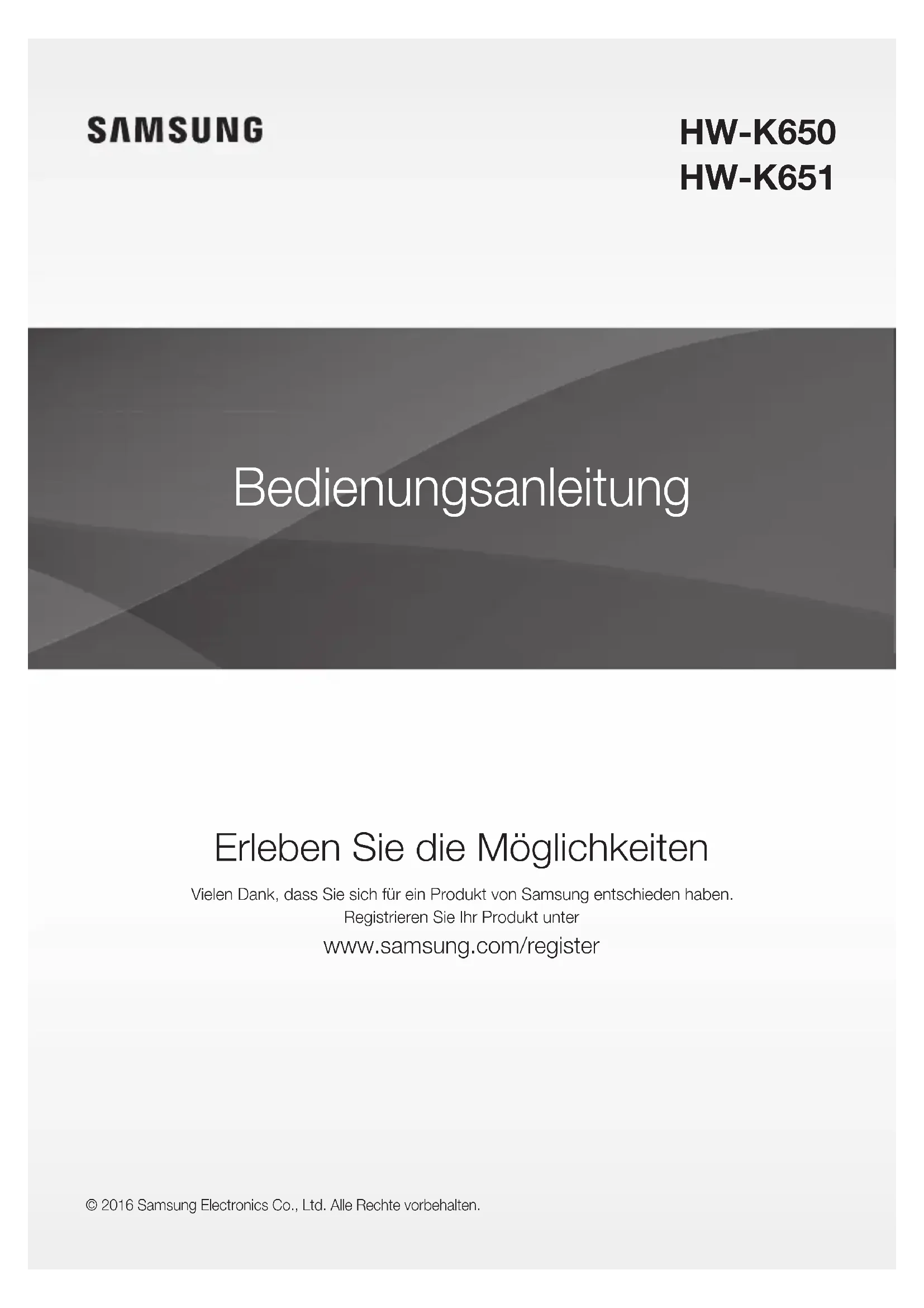 Web Site AUSTRIA 0800-SAMSUNG (0800-7267864) [Only for Premium HA] 0800-366661 [Only for Dealers] 0810-112233 www.samsung.com/at/support SWITZERLAND 0800 726 78 64 (0800-SAMSUNG) www.samsung.com/ch/support (German) www.samsung.com/ch_fr/ support (French) CZECH 800 - SAMSUNG (800-726786) www.samsung.com/cz/support SLOVAKIA 0800 - SAMSUNG (0800-726 786) www.samsung.com/sk/support CROATIA 072 726 786 www.samsung.com/hr/support BOSNIA 055 233 999 www.samsung.com/support MONTENEGRO 020 405 888 www.samsung.com/support SLOVENIA 080 697 267 (brezplačna številka) www.samsung.com/si SERBIA 011 321 6899 www.samsung.com/rs/support BULGARIA *3000 Цена в мрежата 0800 111 31 , Безплатна телефонна линия www.samsung.com/bg/support ROMANIA *8000 (apel in retea) 08008-726-78-64 (08008-SAMSUNG) Apel GRATUIT www.samsung.com/ro/support CYPRUS 8009 4000 only from landline, toll free www.samsung.com/gr/support GREECE 80111-SAMSUNG (80111 726 7864) only from land line (+30) 210 6897691 from mobile and land line LITHUANIA 8-800-77777 www.samsung.com/lt/support LATVIA 8000-7267 www.samsung.com/lv/support ESTONIA 800-7267 www.samsung.com/ee/supportBedienungsanleitung Erleben Sie die Möglichkeiten Vielen Dank, dass Sie sich für ein Produkt von Samsung entschieden haben. Registrieren Sie Ihr Produkt unter www.samsung.com/register HW-K650 HW-K651 © 2016 Samsung Electronics Co., Ltd. Alle Rechte vorbehalten.32 erste schritte SICHERHEITSINFORMATIONEN HinWeise zur sicHerHeit ZUR VERMEIDUNG VON STROMSCHLÄGEN DARF DIESES GERÄT NICHT GEÖFFNET WERDEN. ES ENTHÄLT KEINE BAUTEILE, DIE VOM BENUTZER GEWARTET ODER REPARIERT WERDEN KÖNNEN. WARTUNGS- UND REPARATURARBEITEN DÜRFEN NUR VON FACHPERSONAL AUSGEFÜHRT WERDEN. AcHtunG GefAHr eleKtriscHer scHläGe! Gerät nicHt öffnen!Dieses Symbol zeigt an, dass im Gerät eine hohe Spannung vorliegt. Aufgrund der bestehenden Stromschlaggefahr dürfen keine Teile im Innern des Geräts berührt werden.Dieses Symbol zeigt an, dass mit dem Gerät wichtige schriftliche Anleitungen bezüglich der Bedienung und Wartung mitgeliefert wurden.Produkt der Klasse-II: Dieses Symbol zeigt an, dass das Gerät keinen elektrischen Erdungsanschluss (Masse) benötigt.Wechselspannung: Dieses Symbol zeigt an, dass es sich bei der mit diesem Symbol gekennzeichneten Nennspannung um eine Wechselspannung handelt.Gleichspannung: Dieses Symbol zeigt an, dass es sich bei der mit diesem Symbol gekennzeichneten Nennspannung um eine Gleichspannung handelt.Achtung! Gebrauchsanweisung beachten: Dieses Symbol weist den Benutzer an, weitere sicherheitsrelevante Informationen der Gebrauchsanweisung zu entnehmen. WArnunG : Setzen Sie das Gerät nicht Nässe oder Feuchtigkeit aus, um die Gefahr eines Brandes bzw. eines elektrischen Schlags zu vermeiden.AcHtunG : UM ELEKTRISCHE SCHLÄGE ZU VERMEIDEN, RICHTEN SIE DEN BREITEN KONTAKTSTIFT DES STECKERS AN DEM BREITEN STECKPLATZ AUS, UND STECKEN SIE DEN STECKER VOLL EIN.• Dieses Gerät darf nur an eine Netzsteckdose mit Schutzerdung angeschlossen werden.