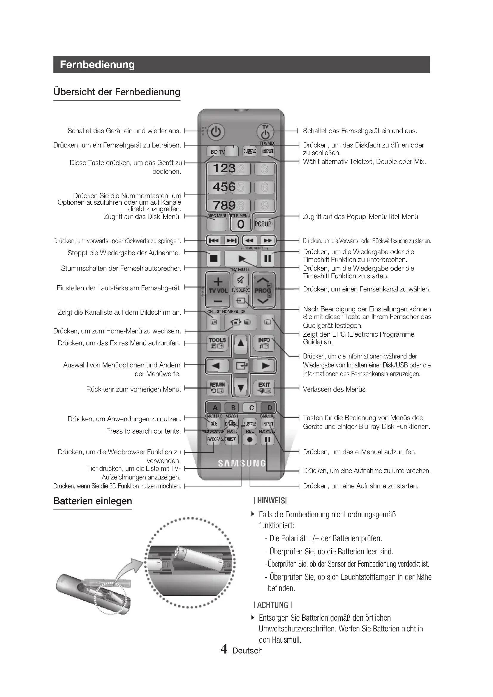 Entsorgen Sie Batterien gemäß den örtlichen Umweltschutzvorschriften. Werfen Sie Batterien nicht in den Hausmüll. Batterien einlegen Fernbedienung Übersicht der Fernbedienung Drücken, um ein Fernsehgerät zu betreiben. Schaltet das Gerät ein und wieder aus. Drücken, um das Extras Menü aufzurufen. Rückkehr zum vorherigen Menü. Drücken Sie die Nummerntasten, um Optionen auszuführen oder um auf Kanäle direkt zuzugreifen. Zugriff auf das Disk-Menü. Diese Taste drücken, um das Gerät zu bedienen. Drücken, um zum Home-Menü zu wechseln. Auswahl von Menüoptionen und Ändern der Menüwerte. Schaltet das Fernsehgerät ein und aus. Verlassen des Menüs Wählt alternativ Teletext, Double oder Mix. Zugriff auf das Popup-Menü/Titel-Menü Nach Beendigung der Einstellungen können Sie mit dieser Taste an Ihrem Fernseher das Quellgerät festlegen. Drücken, um die Informationen während der Wiedergabe von Inhalten einer Disk/USB oder die Informationen des Fernsehkanals anzuzeigen. Drücken, um die Vorwärts- oder Rückwärtssuche zu starten. Drücken, um vorwärts- oder rückwärts zu springen. Stoppt die Wiedergabe der Aufnahme. Einstellen der Lautstärke am Fernsehgerät. Stummschalten der Fernsehlautsprecher. Zeigt die Kanalliste auf dem Bildschirm an. Drücken, um die Wiedergabe oder die Timeshift Funktion zu unterbrechen. Drücken, um die Wiedergabe oder die Timeshift Funktion zu starten. Drücken, um einen Fernsehkanal zu wählen. Zeigt den EPG (Electronic Programme Guide) an. Tasten für die Bedienung von Menüs des Geräts und einiger Blu-ray-Disk Funktionen. FUNCTIONTV SOURCEPOWERRECEIVERDIGITALSUBTITLEINPUT