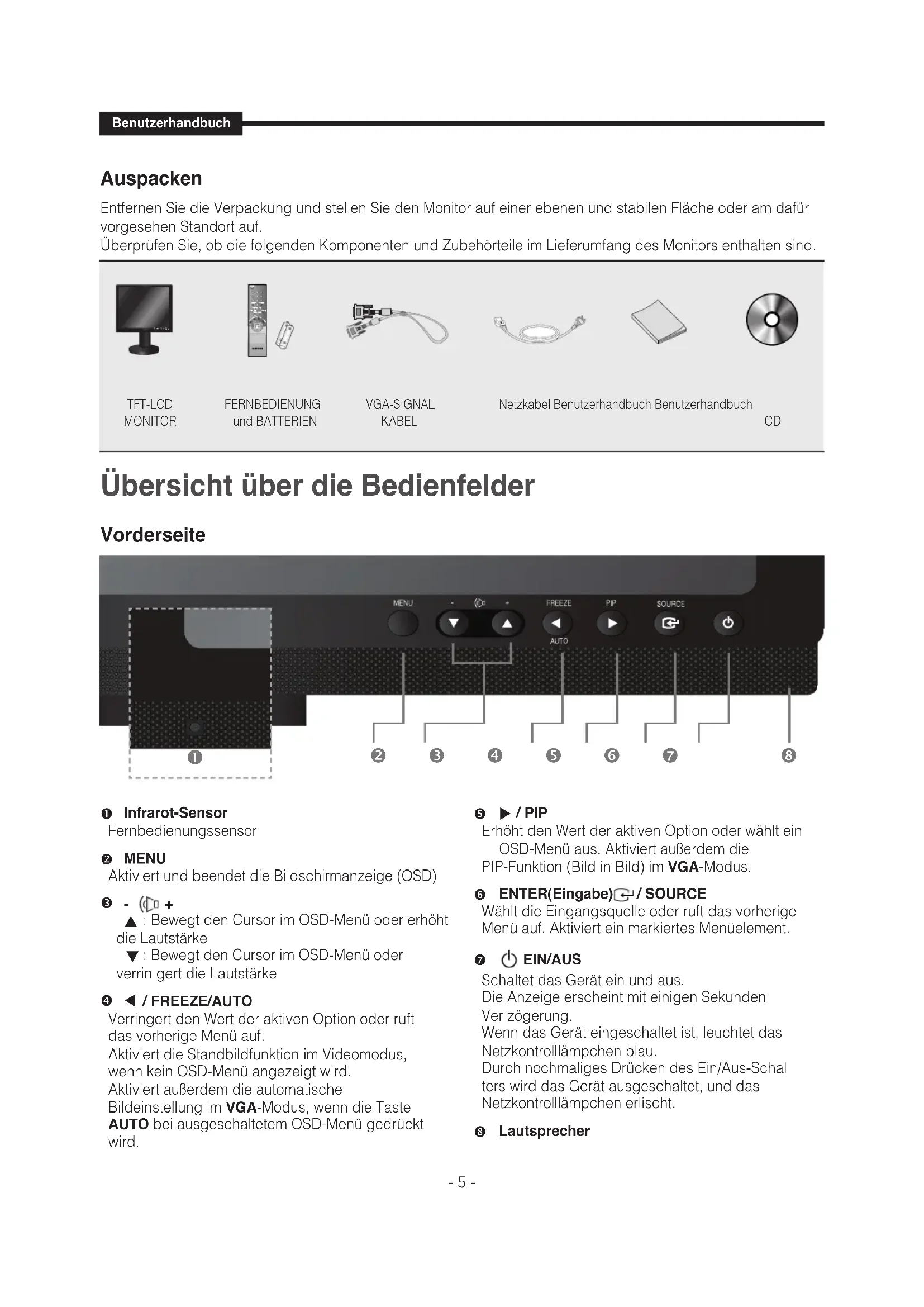 Technische Daten ...................................................................................17 Inhalt Benutzerhandbuch - 4 -- 5 - Benutzerhandbuch Auspacken Entfernen Sie die Verpackung und stellen Sie den Monitor auf einer ebenen und stabilen Fläche oder am dafür vorgesehen Standort auf. Überprüfen Sie, ob die folgenden Komponenten und Zubehörteile im Lieferumfang des Monitors enthalten sind. Vorderseite USER'S MANUALBenutzerhandbuch TFT-LCD MONITOR FERNBEDIENUNG und BATTERIEN VGA-SIGNAL KABEL Netzkabel Benutzerhandbuch Benutzerhandbuch