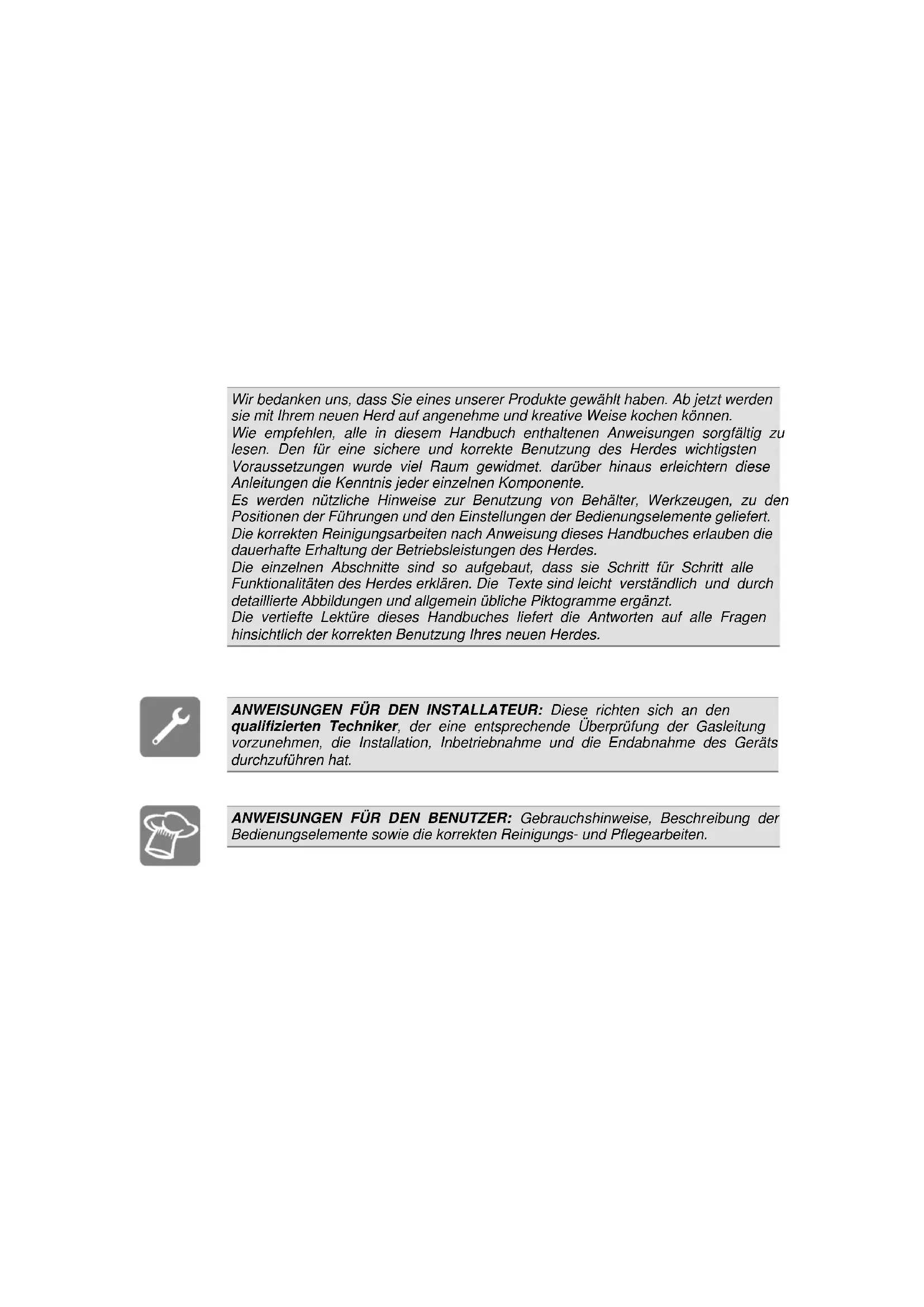 DIESES HANDBUCH STELLT EINEN BESTANDTEIL DES GERÄTS DAR UND IST DAHER VOLLSTÄNDIG UND GRIFFBEREIT FÜR DIE GESAMTE LEBENSDAUER DES HERDES AUFZUBEWAHREN. WIR EMPFEHLEN EINE AUFMERKSAME LEKTÜRE DIESES HANDBUCHES UND ALLER IN DIESEM ENTHALTENER ANWEISUNGEN VOR DER BENUTZUNG DES HERDES. BEWAHREN SIE, FALLS VORHANDEN, AUCH DEN MITGELIEFERTEN SATZ DÜSEN AUF. DIE INSTALLATION IST VON FACHPERSONAL SOWIE UNTER EINHALTUNG DER GELTENDEN VORSCHRIFTEN DURCHZUFÜHREN. DIESES GERÄT IST FÜR DEN EINSATZ IM HÄUSLICHEN BEREICH VORGESEHEN UND STEHE IN ÜBEREINSTIMMUNG MIT DEN AKTUELLE GELTENDEN EWG RICHTLINIEN. DIE PROFESSIONELLE VERWENDUNG UND DIE INSTALLATION IN ÖFFENTLICHEN BETRIEBEN WIE RESTAURANTS, BARS. BETRIEBSKANTINEN SOWIE JEGLICHE WEITERE VON DER SPEZIFIZIERTEN ABWEICHENDE VERWENDUNG FÜHREN ZUM UNVERZÜGLICHEN VERFALL DER GARANTIE. DAS GERÄT IST AUSGELEGT ZUR ERFÜLLUNG FOLGENDER FUNKTION: GAREN UND ERHITZEN VON LEBENSMITTELN. JEDE SONSTIGE VERWENDUNG IST ALS UNZULÄSSIG ZU BETRACHTEN. DER HERSTELLER LEHNT JEDE HAFTUNG FÜR VON DEN BEZEICHNETEN ABWEICHENDE VERWENDUNGEN AB.