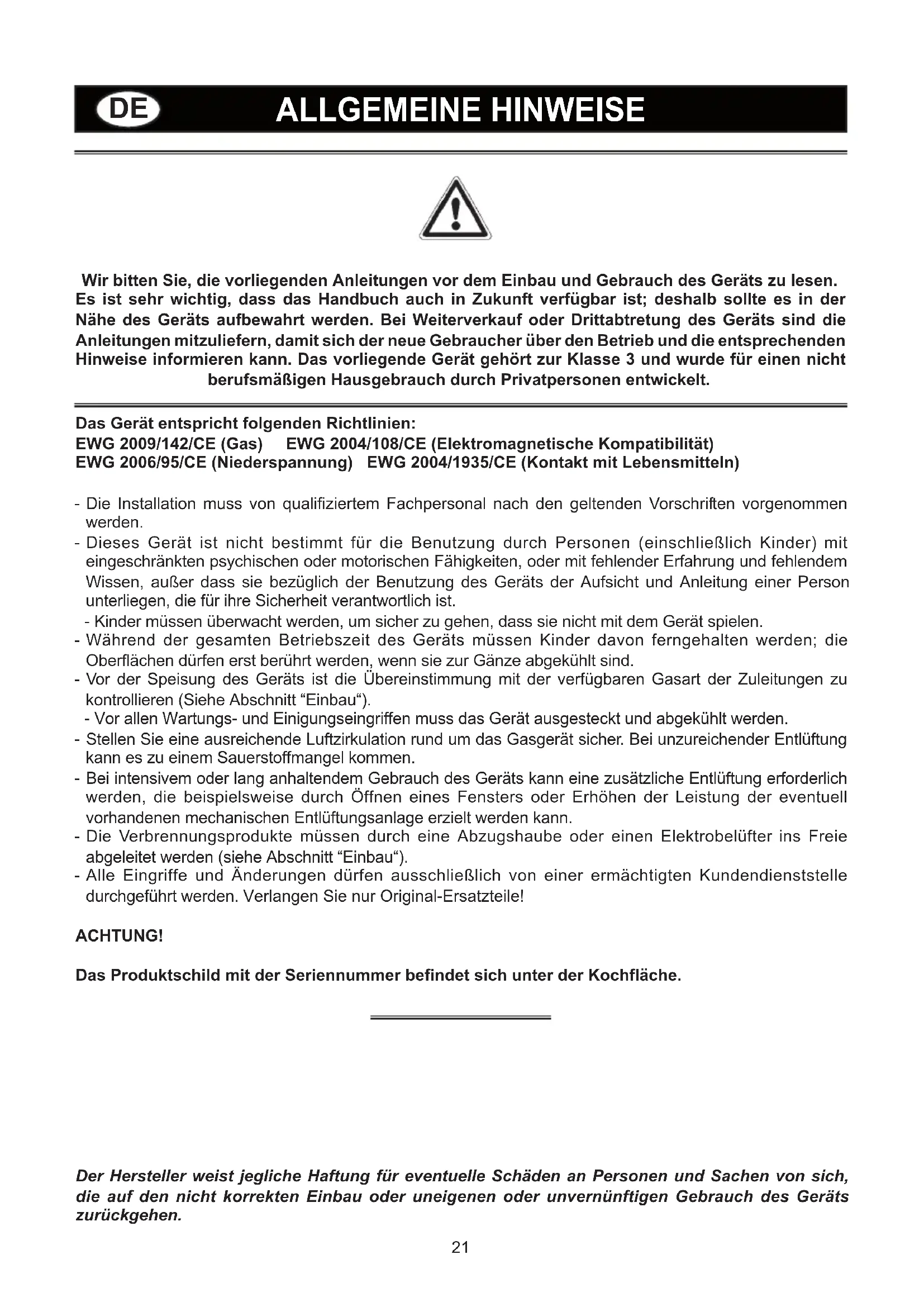 ALLGEMEINE HINWEISE Wir bitten Sie, die vorliegenden Anleitungen vor dem Einbau und Gebrauch des Geräts zu lesen. Es ist sehr wichtig, dass das Handbuch auch in Zukunft verfügbar ist; deshalb sollte es in der Nähe des Geräts aufbewahrt werden. Bei Weiterverkauf oder Drittabtretung des Geräts sind die Anleitungen mitzuliefern, damit sich der neue Gebraucher über den Betrieb und die entsprechenden Hinweise informieren kann. Das vorliegende Gerät gehört zur Klasse 3 und wurde für einen nicht berufsmäßigen Hausgebrauch durch Privatpersonen entwickelt. Das Gerät entspricht folgenden Richtlinien: EWG 2009/142/CE (Gas) EWG 2004/108/CE (Elektromagnetische Kompatibilität) EWG 2006/95/CE (Niederspannung) EWG 2004/1935/CE (Kontakt mit Lebensmitteln) - Die Installation muss von qualifiziertem Fachpersonal nach den geltenden Vorschriften vorgenommen werden. - Dieses Gerät ist nicht bestimmt für die Benutzung durch Personen (einschließlich Kinder) mit eingeschränkten psychischen oder motorischen Fähigkeiten, oder mit fehlender Erfahrung und fehlendem Wissen, außer dass sie bezüglich der Benutzung des Geräts der Aufsicht und Anleitung einer Person unterliegen, die für ihre Sicherheit verantwortlich ist. - Kinder müssen überwacht werden, um sicher zu gehen, dass sie nicht mit dem Gerät spielen. - Während der gesamten Betriebszeit des Geräts müssen Kinder davon ferngehalten werden; die Oberflächen dürfen erst berührt werden, wenn sie zur Gänze abgekühlt sind. - Vor der Speisung des Geräts ist die Übereinstimmung mit der verfügbaren Gasart der Zuleitungen zu kontrollieren (Siehe Abschnitt “Einbau“). - Vor allen Wartungs- und Einigungseingriffen muss das Gerät ausgesteckt und abgekühlt werden. - Stellen Sie eine ausreichende Luftzirkulation rund um das Gasgerät sicher. Bei unzureichender Entlüftung kann es zu einem Sauerstoffmangel kommen. - Bei intensivem oder lang anhaltendem Gebrauch des Geräts kann eine zusätzliche Entlüftung erforderlich werden, die beispielsweise durch Öffnen eines Fensters oder Erhöhen der Leistung der eventuell vorhandenen mechanischen Entlüftungsanlage erzielt werden kann. - Die Verbrennungsprodukte müssen durch eine Abzugshaube oder einen Elektrobelüfter ins Freie abgeleitet werden (siehe Abschnitt “Einbau“). - Alle Eingriffe und Änderungen dürfen ausschließlich von einer ermächtigten Kundendienststelle durchgeführt werden. Verlangen Sie nur Original-Ersatzteile! ACHTUNG! Das Produktschild mit der Seriennummer befindet sich unter der Kochfläche. Der Hersteller weist jegliche Haftung für eventuelle Schäden an Personen und Sachen von sich, die auf den nicht korrekten Einbau oder uneigenen oder unvernünftigen Gebrauch des Geräts zurückgehen.22 1 Schnellbrenner 3000 W 2 Mittlerer Brenner 1750 W 3 Hilfsbrenner 1000 W 4 Dreifacher Brennkranz 3800 W 5 Dreifacher Doppel Brennkranz 3500 W 8 Bedienungsknöpfe der Brenner