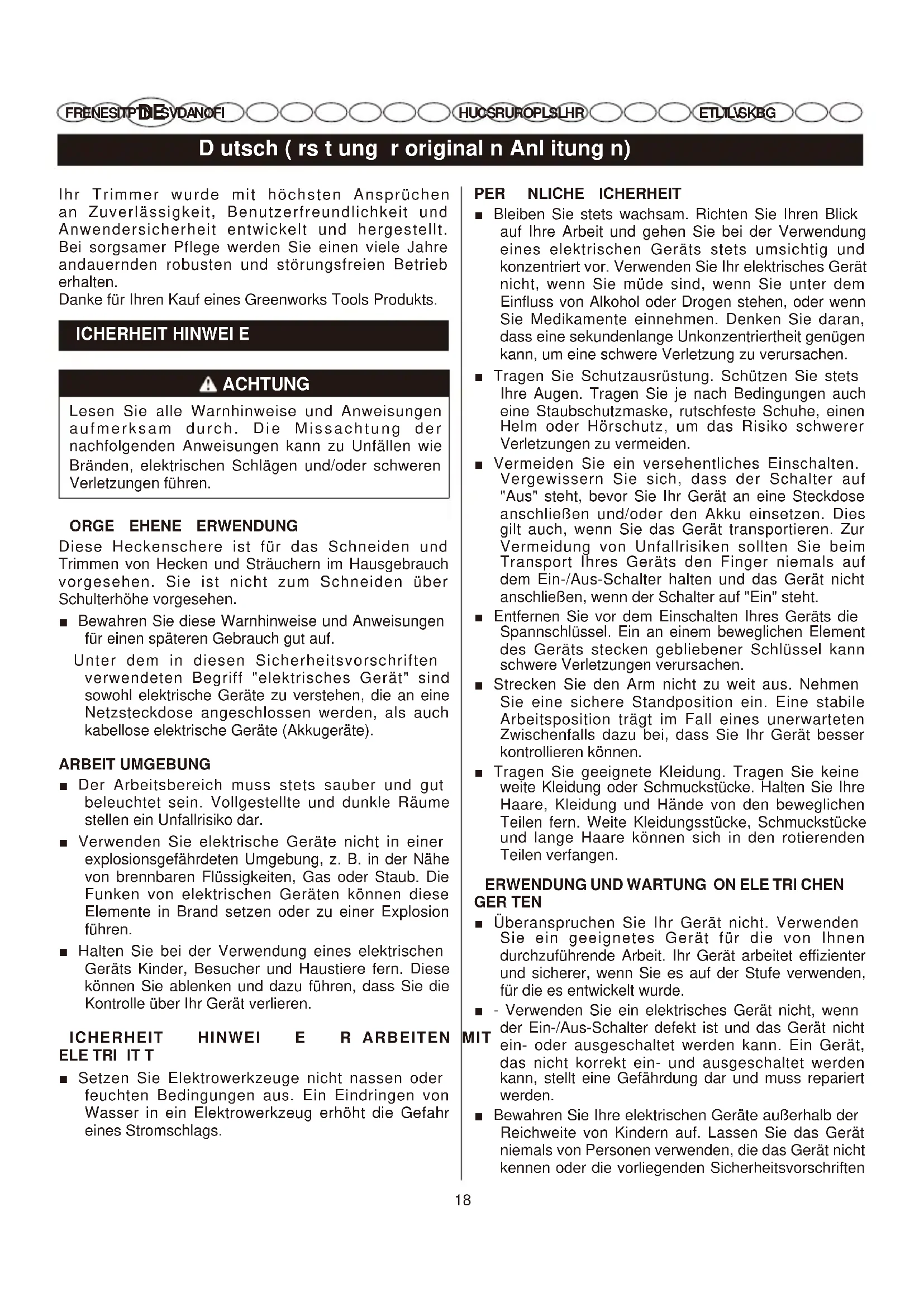 FR EN ES IT PT NL SV DA NO FI HU CS RU RO PL SL HR HU CS RU RO PL SL HR ET LT L V SK BG ET LT LV SK BG Ihr Trimmer wurde mit höchsten Ansprüchen an Zuverlässigkeit, Benutzerfreundlichkeit und Anwendersicherheit entwickelt und hergestellt. Bei sorgsamer Pflege werden Sie einen viele Jahre andauernden robusten und störungsfreien Betrieb erhalten. Danke für Ihren Kauf eines Greenworks Tools Produkts.