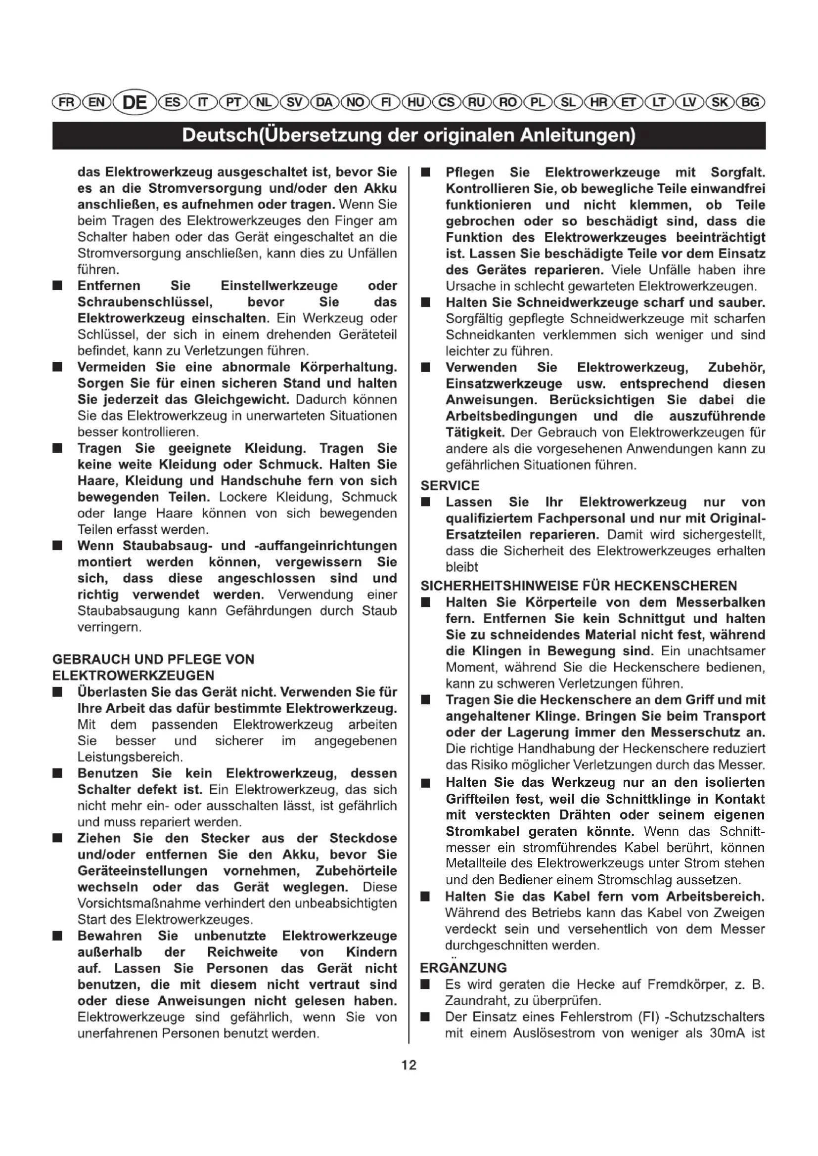 Hersteller: Changzhou Globe Tools Co., Ltd. Adresse: No.65 Xinggang Road Zhonglou Zone Changzhou, Jiangsu 213000 P.R.China Name und Adresse der Person, die autorisiert ist, die technische Dokumentation zusammenzustellen: Name: Dennis Jacobson (Director of Outdoor Power Equipment) Adresse: Hiermit erklären wir, dass das Produkt Kategorie ........................................................................................................ Heckenschere Model Seriennummer .............................................................................. siehe Produkt-Typenschild Baujahr .........................................................................................siehe Produkt-Typenschild E mit den entsprechenden Bestimmungen der Maschinenrichtlinie (2006/42/EC) E mit den Bestimmungen der folgenden anderen EC-Richtlinien übereinstimmt 2004/108/EC (EMC-Richtlinie), und 2000/14/EC (Outdoor Richtlinie) einschl. Modifikationen (2005/88/EC) und weiterhin erklären wir, dass E die folgenden (Teile/Bestimmungen aus) europäischen harmonisierten Normen verwendet wurden Gemessener Schallleistungspegel: L