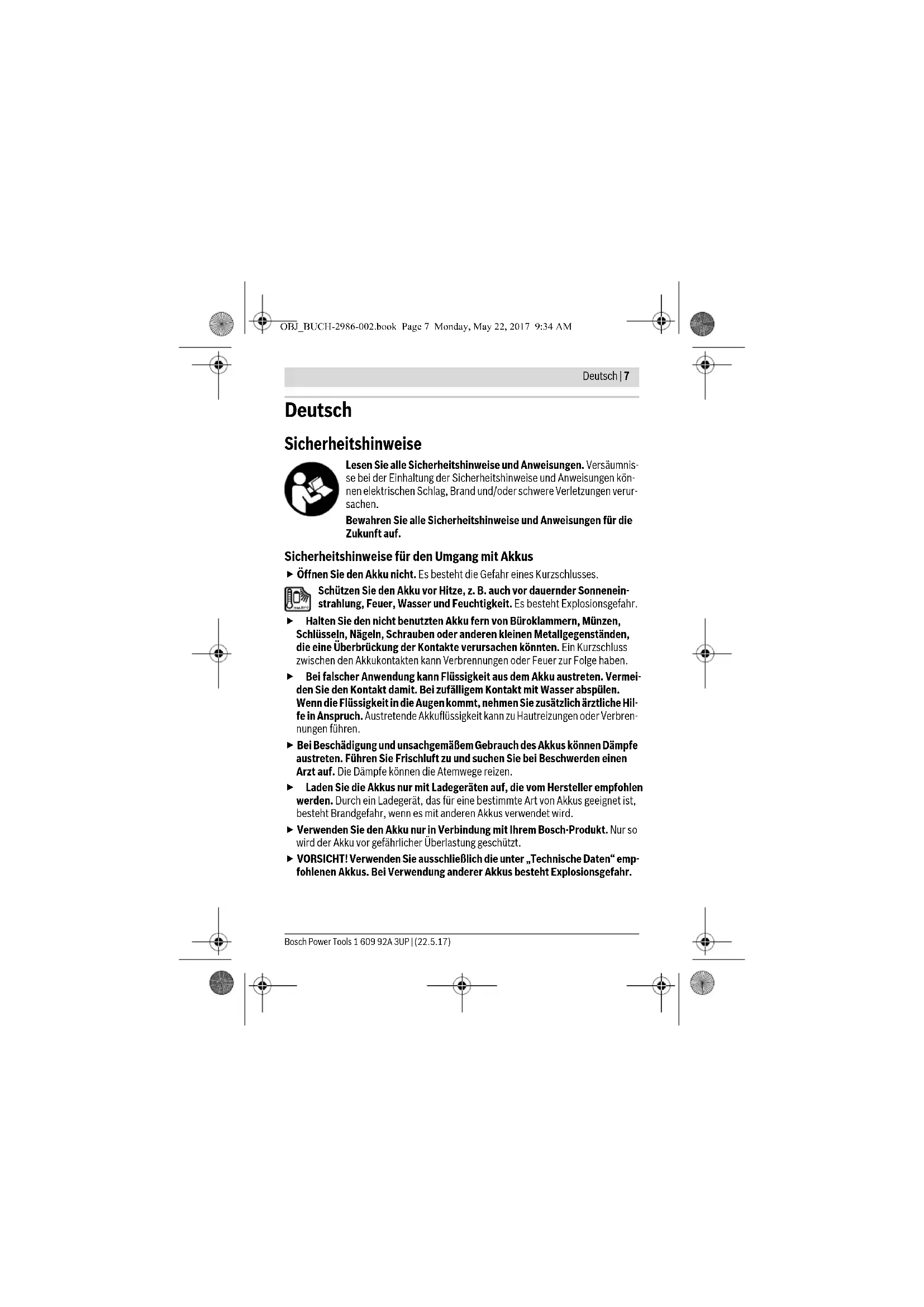 GAL 1880 CV GBA 14,4 V ... OBJ_BUCH-2986-002.book Page 6 Monday, May 22, 2017 8:57 AMDeutsch | 7 Bosch Power Tools 1 609 92A 3UP | (22.5.17) Deutsch Sicherheitshinweise Lesen Sie alle Sicherheitshinweise und Anweisungen. Versäumnis- se bei der Einhaltung der Sicherheitshinweise und Anweisungen kön- nen elektrischen Schlag, Brand und/oder schwere Verletzungen verur- sachen. Bewahren Sie alle Sicherheitshinweise und Anweisungen für die Zukunft auf. Sicherheitshinweise für den Umgang mit Akkus Öffnen Sie den Akku nicht. Es besteht die Gefahr eines Kurzschlusses. Schützen Sie den Akku vor Hitze, z. B. auch vor dauernder Sonnenein- strahlung, Feuer, Wasser und Feuchtigkeit. Es besteht Explosionsgefahr. Halten Sie den nicht benutzten Akku fern von Büroklammern, Münzen, Schlüsseln, Nägeln, Schrauben oder anderen kleinen Metallgegenständen, die eine Überbrückung der Kontakte verursachen könnten. Ein Kurzschluss zwischen den Akkukontakten kann Verbrennungen oder Feuer zur Folge haben. Bei falscher Anwendung kann Flüssigkeit aus dem Akku austreten. Vermei- den Sie den Kontakt damit. Bei zufälligem Kontakt mit Wasser abspülen. Wenn die Flüssigkeit in die Augen kommt, nehmen Sie zusätzlich ärztliche Hil- fe in Anspruch. Austretende Akkuflüssigkeit kann zu Hautreizungen oder Verbren- nungen führen. Bei Beschädigung und unsachgemäßem Gebrauch des Akkus können Dämpfe austreten. Führen Sie Frischluft zu und suchen Sie bei Beschwerden einen Arzt auf. Die Dämpfe können die Atemwege reizen. Laden Sie die Akkus nur mit Ladegeräten auf, die vom Hersteller empfohlen werden. Durch ein Ladegerät, das für eine bestimmte Art von Akkus geeignet ist, besteht Brandgefahr, wenn es mit anderen Akkus verwendet wird. Verwenden Sie den Akku nur in Verbindung mit Ihrem Bosch-Produkt. Nur so wird der Akku vor gefährlicher Überlastung geschützt. VORSICHT! Verwenden Sie ausschließlich die unter „Technische Daten“ emp- fohlenen Akkus. Bei Verwendung anderer Akkus besteht Explosionsgefahr. OBJ_BUCH-2986-002.book Page 7 Monday, May 22, 2017 9:34 AM8 | Deutsch 1 609 92A 3UP | (22.5.17) Bosch Power Tools Durch spitze Gegenstände wie z. B. Nagel oder Schraubenzieher oder durch äußere Krafteinwirkung kann der Akku beschädigt werden. Es kann zu einem internen Kurzschluss kommen und der Akku brennen, rauchen, explodieren oder überhitzen. Stecken Sie den Akku nicht in den Akku-Adapter, wenn die Entriegelungstas- ten gebrochen oder defekt sind. Der Akku kann während des Betriebs herausfal- len. Verbrauchte Akkus sollen einer umweltgerechten Wiederverwertung zuge- führt werden. Beachten Sie dazu die Anweisungen in den Abschnitten „Trans- port“ und „Entsorgung“. Produkt- und Leistungsbeschreibung Der Akku-Adapter dient zur Aufnahme eines Bosch 14,4- oder 18-V-Lithium-Ionen- Akkus als Spannungsquelle. Mit dem Akku-Adapter können maximal zwei USB-Geräte sowie ein Heizelement für die Heizjacke gleichzeitig mit Spannung versorgt werden. Abgebildete Komponenten Die Nummerierung der abgebildeten Komponenten bezieht sich auf die Darstellungen auf den Grafikseiten. 1 Akku-Adapter 2 USB-Buchse 3 Buchse für Anschlussstecker des Heizelements der Heizjacke 4 Gurthalteclip 5 Ein-Taste zur Aktivierung des Akku-Adapters 6 Akku* 7 Akku-Entriegelungstaste *Abgebildetes oder beschriebenes Zubehör gehört nicht zum Standard-Lieferumfang. Das vollständige Zubehör finden Sie in unserem Zubehörprogramm. OBJ_BUCH-2986-002.book Page 8 Monday, May 22, 2017 9:34 AMDeutsch | 9 Bosch Power Tools 1 609 92A 3UP | (22.5.17) Technische Daten Betrieb Akku einsetzen und entnehmen (siehe Bilder A1–A2) Wenden Sie beim Einsetzen des Akkus keine Gewalt an. Der Akku ist so kon- struiert, dass er nur in der richtigen Position in den Akku-Adapter eingesteckt wer- den kann. – Zum Einsetzen des Akkus 6 schieben Sie den Akku bis zum Anschlag in den Akku- Adapter 1 ein. – Zum Entnehmen des Akkus 6 drücken Sie die Entriegelungstasten 7 am Akku und ziehen ihn aus dem Akku-Adapter 1. Akku-Adapter GAA 18V-24 Sachnummer 1 600 A00 J.. USB-Anschluss –Ladespannung – Ladestrom (max.)* bei 1 USB-Gerät – Ladestrom (max.)* bei 2 USB-Geräten