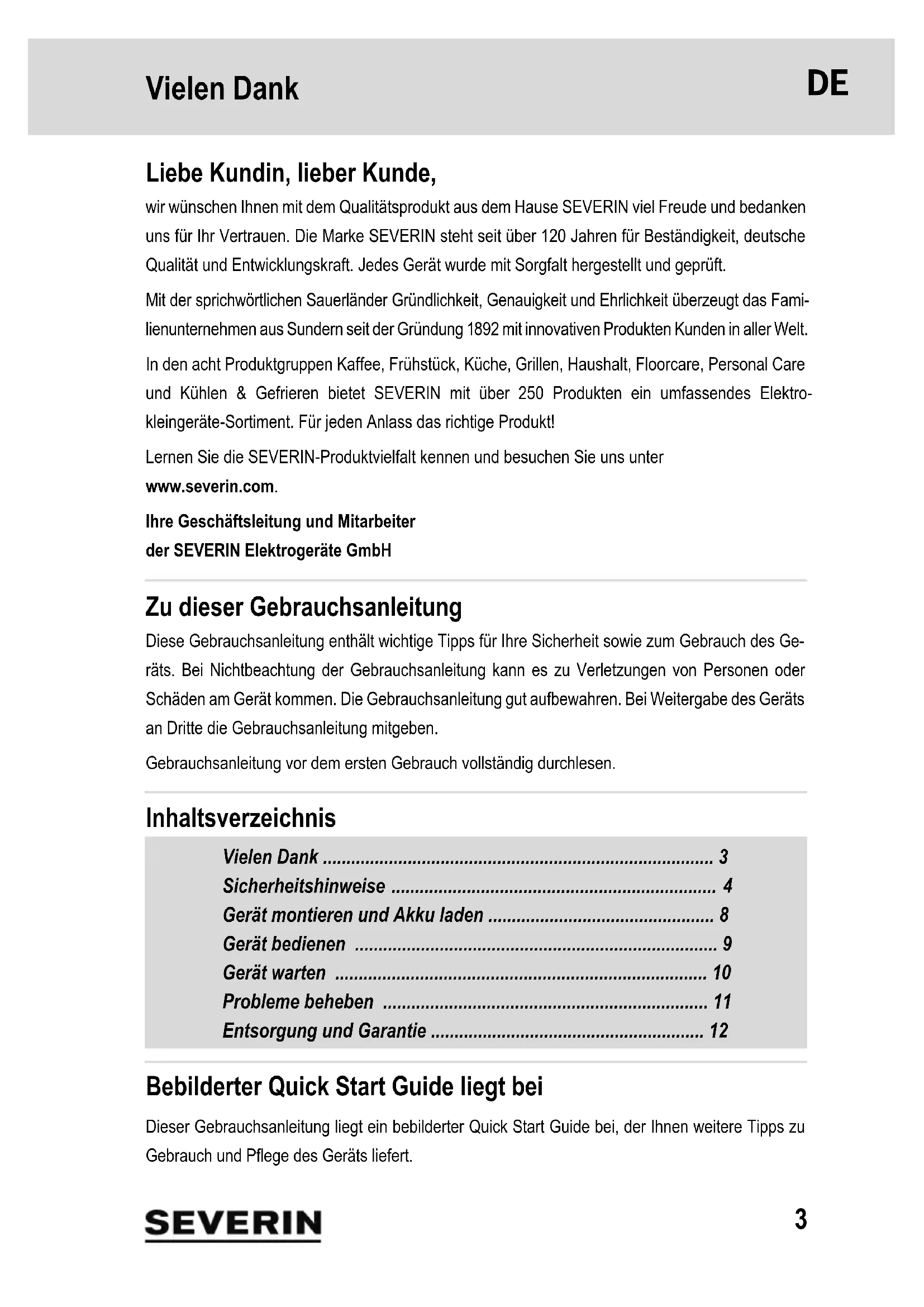 Für weitere Informationen siehe bebilderter Quick Start Guide.11 Probleme beheben 6 Probleme be heben Probleme selbst beheben Damit möglichst gar keine Probleme auftreten, ist es wichtig, den Staubbehälter rechtzeitig zu lee- ren sowie bei dieser Gelegenheit den Motorschutzfilter zu kontrollieren und zu reinigen. Servicehotline Falls Sie das Problem anhand der Tabelle nicht beheben können, rufen Sie unsere Servicehotline an (siehe Kontaktdaten im Anhang dieser Gebrauchsanleitung). Ersatzteile bestellen Ersatzteile oder Zubehör können Sie im Internet unter https://shop.severin.com/shop/search oder über unseren Kundendienst bequem bestellen. Problem mögliche Ursache / Lösung Gerät lässt sich nicht einschalten. Sicherstellen, dass länger als 1 Sekunde gedrückt wurde, um das Gerät einzuschalten. Akku ist völlig leer. Gerät ausschalten und Akku laden, Kapitel „Akku la- den“. Gerät lässt sich nicht laden (LEDs blinken nicht). Netzteil ist nicht korrekt eingesteckt. Prüfen, ob Netzteilstecker bzw. Netz- teiladapter korrekt in ihren Buchsen sitzen, Kapitel „Akku laden“. Akku ist nicht korrekt in das Gerät eingesetzt. Netzteil trennen. Akku erneut in das Gerät einsetzen. Netzteil erneut anschließen. Gerät nimmt kaum Schmutz auf. Staubbehälter muss geleert oder Motorschutzfilter und Zykloneneinheit muss gereinigt werden, Kapitel „Gerät warten“. Betriebsdauer ver- kürzt sich zuneh- mend. Bürstwalze ist verschmutzt und muss gereinigt werden, Kapitel „Bürst- walze reinigen“. Bürstwalze dreht sich langsam oder unregelmäßig. Bürstwalze ist verschmutzt und muss gereinigt werden, Kapitel „Bürst- walze reinigen“. Artikelnummer Beschreibung 106-048 Motorschutzfilter 3567-048 Bürstwalze 5424-048 Akku 22,2 V12 Entsorgung und Garantie 7 Entsorgung und Garanti e Akku ausbauen
