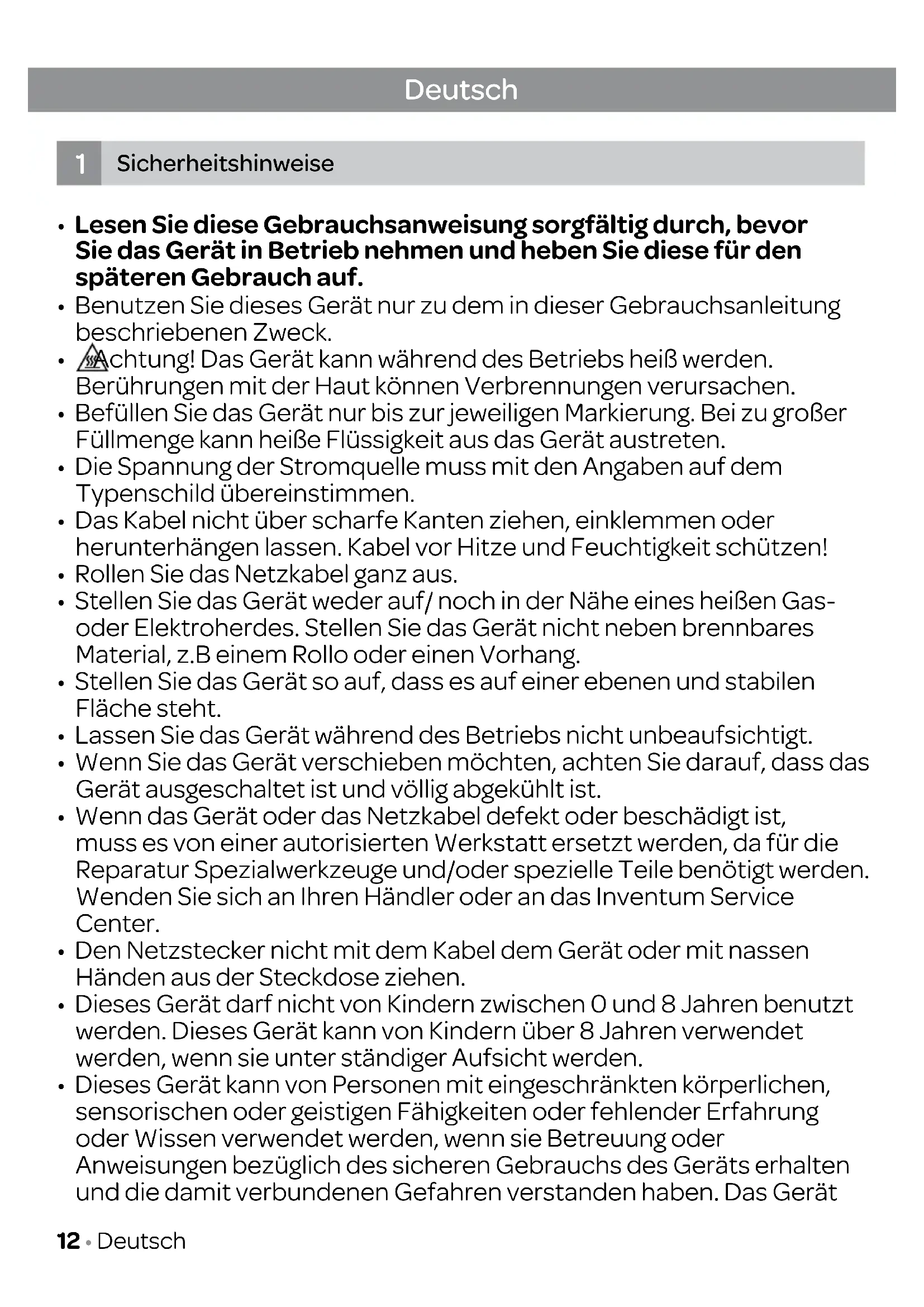 - Dieses Gerät ist nur für den häuslichen Gebrauch bestimmt. Wird es nicht ordnungsgemäß, (halb)professionell oder entgegen den Anweisungen dieser Anleitung verwendet, erlischt die Garantie und Inventum übernimmt keine Haftung für eingetretenen Schäden.