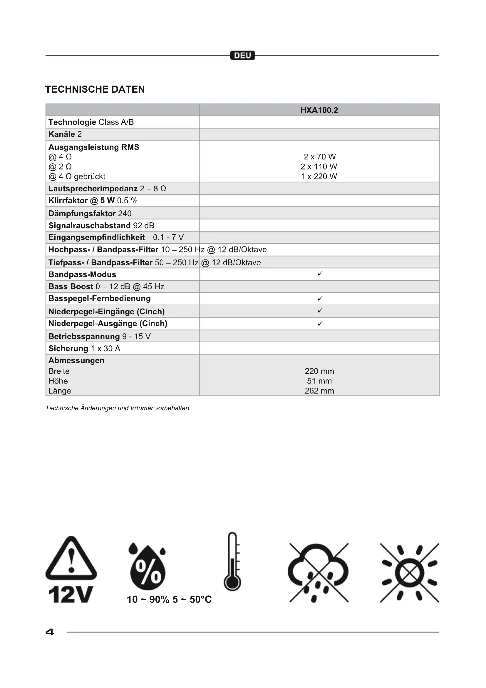 Überprüfen Sie folgende Schritte: Ist ein Eingangspegelregler am Gerät zu hoch eingestellt? Drehen Sie den Regler langsam zurück, bis ein sauberes Audiosignal zu hören. Ist der Bass Boost (Bassanhebung) am Gerät zu hoch eingestellt? Drehen Sie den Regler langsam zurück, bis ein sauberes Audiosignal zu hören. Ist die Loudness Funktion am Autoradio zu hoch eingestellt? Deaktivieren Sie Loudness oder drehen Sie die Loudness Einstellung zurück, bis ein sauberes Audiosignal zu hören ist. Sind die EQ- und Klangeinstellungen am Autoradio zu hoch eingestellt? Drehen Sie die Einstellungen für Treble, Mitten und Bass zurück oder deaktivieren Sie den Equalizer, bis ein sauberes Audiosignal zu hören ist. HÖRBARE STÖRGERÄUSCHE (DREHZAHLABHÄNGIG) Überprüfen Sie folgende Schritte: Sind die RCA/Cinchkabel getrennt vom Stromkabel im Fahrzeug verlegt worden? Verlegen Sie gegebenenfalls die Kabel erneut und achten Sie darauf, dass die RCA/Cinchkabel getrennt vom Stromkabel jeweils links und rechts im Fahrzeug verlegt werden. Ist der Masseanschluss des Geräts korrekt angeschlossen? Achten Sie darauf, dass der Masseanschluss des Geräts nicht direkt am Minuspol der Fahrzeugbatterie angeschlossen ist. Wählen Sie einen geeigneten Massepunkt an der Fahrzeugkarosserie zum Anschließen aus. Verwenden Sie gegebenenfalls Kontaktspray um die Leitfähigkeit der Anschlüsse zu verbes- sern. Ist die Leitfähigkeit des Massekabels der Fahrzeugbatterie zur Karosserie in Ordnung? Achten Sie darauf, dass der Masseanschluss der Fahrzeugbatterie eine stabile und leitfähige Verbindung zur Karosserie hat. Verwenden Sie gegebenenfalls Kontaktspray um die Leitfähigkeit der Anschlüsse zu verbessern.11 SPECIFICATIONS 10 ~ 90% 5 ~ 50°C HXA100.2 Technology Class A/B Channels 2 Output Power RMS (14.4 V) @ 4 Ω @ 2 Ω @ 4 Ω bridged 2 x 70 W 2 x 110 W 1 x 220 W Loudspeaker impedance 2 – 8 Ω Total Harmonic Distortion @ 5 W 0.5 % Damping factor 240 Signal-to-noise ratio 92 dB Input sensitivity 0.1 - 7 V High pass / bandpass lter 10 – 250 Hz @ 12 dB/octave Low pass / bandpass lter 50 – 250 Hz @ 12 dB/octave Bandpass mode