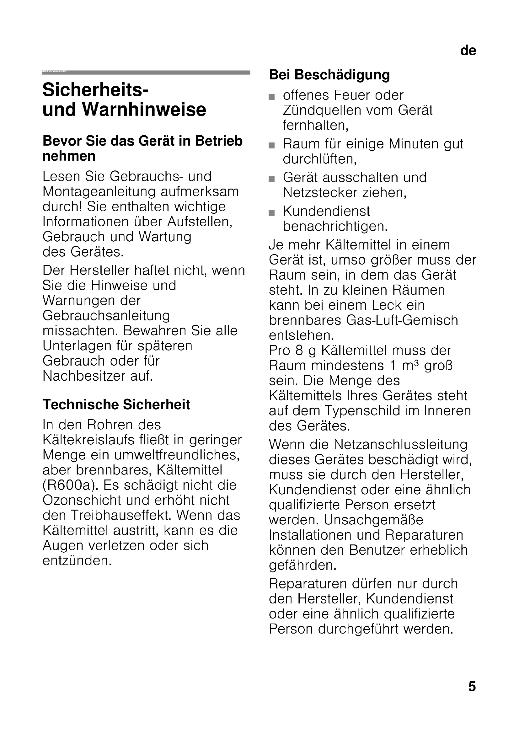 deInhaltsverzeichnis deGebrauchsanleitung Sicherheits- und Warnhinweise Bevor Sie das Gerät in Betrieb nehmen Lesen Sie Gebrauchs- und Montageanleitung aufmerksam durch! Sie enthalten wichtige Informationen über Aufstellen, Gebrauch und Wartung des Gerätes. Der Hersteller haftet nicht, wenn Sie die Hinweise und Warnungen der Gebrauchsanleitung missachten. Bewahren Sie alle Unterlagen für späteren Gebrauch oder für Nachbesitzer auf. Technische Sicherheit In den Rohren des Kältekreislaufs fließt in geringer Menge ein umweltfreundliches, aber brennbares, Kältemittel (R600a). Es schädigt nicht die Ozonschicht und erhöht nicht den Treibhauseffekt. Wenn das Kältemittel austritt, kann es die Augen verletzen oder sich entzünden. Bei Beschädigung ■ offenes Feuer oder Zündquellen vom Gerät fernhalten, ■ Raum für einige Minuten gut durchlüften, ■ Gerät ausschalten und Netzstecker ziehen, ■ Kundendienst benachrichtigen. Je mehr Kältemittel in einem Gerät ist, umso größer muss der Raum sein, in dem das Gerät steht. In zu kleinen Räumen kann bei einem Leck ein brennbares Gas-Luft-Gemisch entstehen. Pro 8 g Kältemittel muss der Raum mindestens 1 m³ groß sein. Die Menge des Kältemittels Ihres Gerätes steht auf dem Typenschild im Inneren des Gerätes. Wenn die Netzanschlussleitung dieses Gerätes beschädigt wird, muss sie durch den Hersteller, Kundendienst oder eine ähnlich qualifizierte Person ersetzt werden. Unsachgemäße Installationen und Reparaturen können den Benutzer erheblich gefährden. Reparaturen dürfen nur durch den Hersteller, Kundendienst oder eine ähnlich qualifizierte Person durchgeführt werden.de