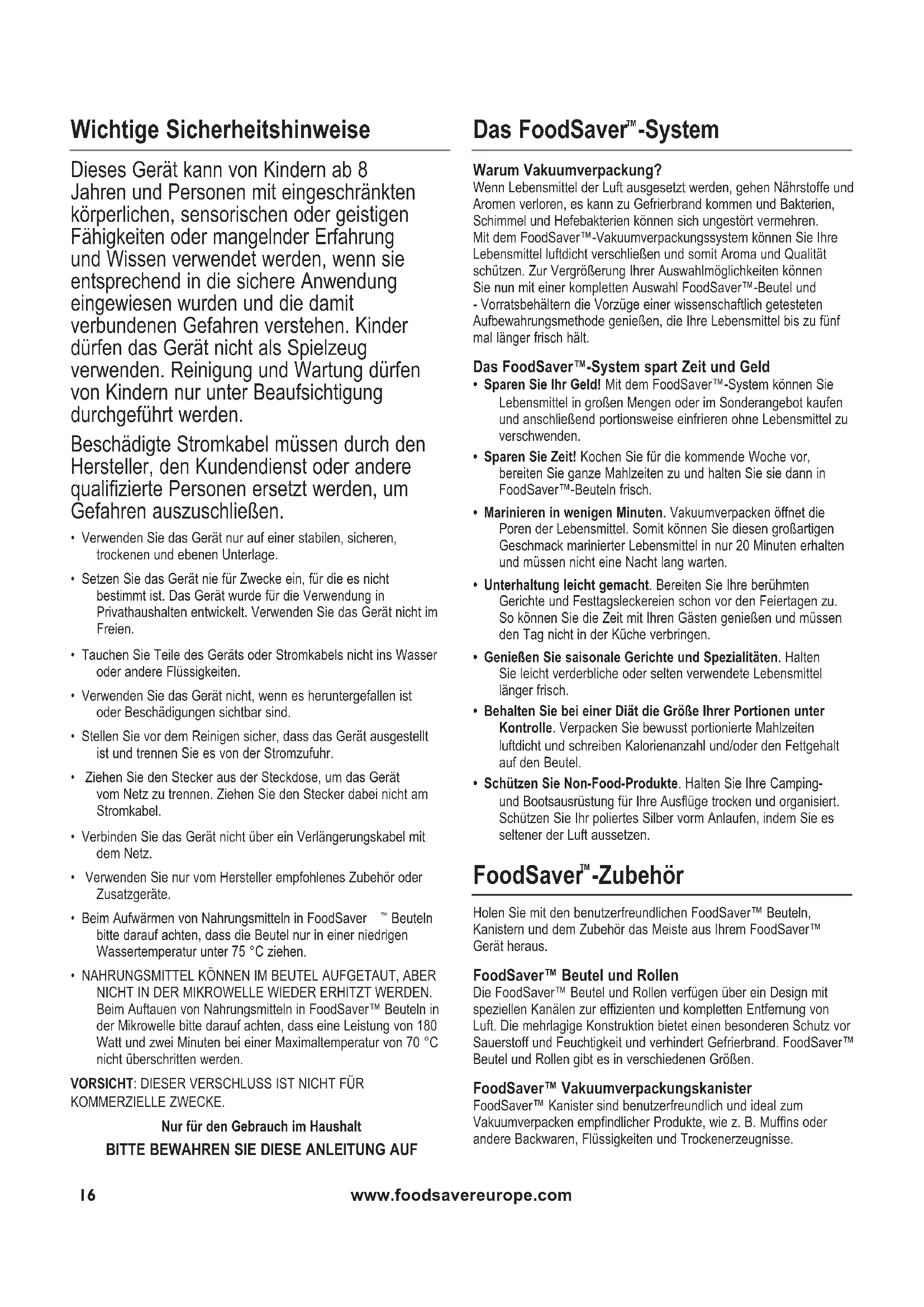 Vakuumverpacken eingefroren werden muss, muss auch nach dem Vakuumverpacken gekühlt oder eingefroren werden. Zur Vermeidung eventueller Erkrankungen die Beutel nach dem Aufbewahren von rohem Fleisch oder Fisch sowie fettigen Nahrungsmitteln nicht erneut verwenden. Beutel nicht erneut verwenden, wenn sie in der Mikrowelle waren oder geköchelt haben. Auftauen und Erhitzen vakuumverpackter Lebensmittel NAHRUNGSMITTEL KÖNNEN IM BEUTEL AUFGETAUT, ABER NICHT IN DER MIKROWELLE WIEDER ERHITZT WERDEN. Auftauen – Nahrungsmittel stets entweder im Kühlschrank oder in der Mikrowelle auftauen. Verderbliche Nahrungsmittel niemals bei Zimmertemperatur auftauen. Bevor der Beutel in die Mikrowelle gelegt wird, zuerst eine Ecke abschneiden. Beutel auf einen für die Mikrowelle geeigneten Teller legen, um zu vermeiden, dass Flüssigkeit überschwappt. Sicherstellen, dass die Maximalleistung von 180 Watt, maximal zwei Minuten und Maximaltemperatur von 70 °C nicht überschritten werden. Aufwärmen – Zum Aufwärmen von Nahrungsmitteln in der Mikrowelle nehmen Sie das Nahrungsmittel aus dem Beutel und legen es auf einen für die Mikrowelle geeigneten Teller. Sie können Nahrungsmittel in FoodSaver™ Beuteln auch aufwärmen, indem Sie den Beutel im Wasser bei einer Temperatur unter 75 °C ziehen lassen. Lebensmittel Haltbarkeit Lagerort Anmerkungen Rindfleisch, Schweinefleisch, Lamm, Huhn 2 - 3 Jahre Gefrierschrank Frieren Sie feuchte Lebensmittel vor dem Vakuumieren vor. Sie können auch ein gefaltetes Haushaltstuch aus Papier zwischen die Lebensmittel und die Öffnung des Beutels legen, um überschüssige Flüssigkeit aufzusaugen. Denken Sie daran, nach dem Papiertuch 75 mm Platz bis zur Versiegelungsnaht zu lassen. Hinweis: Rindfleisch kann nach dem Vakuumieren dunkler erscheinen, da Sauerstoff entfernt wurde. Dies deutet jedoch nicht darauf hin, dass das Fleisch verdorben ist. Hackfleisch 1 Jahr Gefrierschrank Fisch 2 Jahre Gefrierschrank Hartkäse (Gouda, Parmesan, Edamer, Cheddar usw.) 4 - 8 Monate Kühlschrank Vakuumieren Sie Käse nach jedem Verzehr, um ihn frisch zu halten. Verwenden Sie einen extra langen Beutel, damit für jede neue Versiegelung 25 mm zur Verfügung stehen. Vakuumieren Sie Weichkäse NICHT. Spargel, Brokkoli, Blumenkohl, Karotten, Kohl, Rosenkohl, grüne Bohnen, Erbsen, Mais usw. 2 - 3 Jahre Immer im Gefrierschrank. Blanchieren Sie Gemüse vor dem Verpacken bis es gekocht aber noch bissfest ist. Frieren Sie das Gemüse vor dem Verpacken ein. Trennen Sie dabei die Einzelstücke, damit diese beim Verpacken nicht aneinanderkleben. Vakuumieren Sie NIE frische Pilze. Salat, Spinat usw. 2 Wochen Kühlschrank Waschen und trocknen Sie das Gemüse. Beste Ergebnisse erzielen Sie mit einem FoodSaver