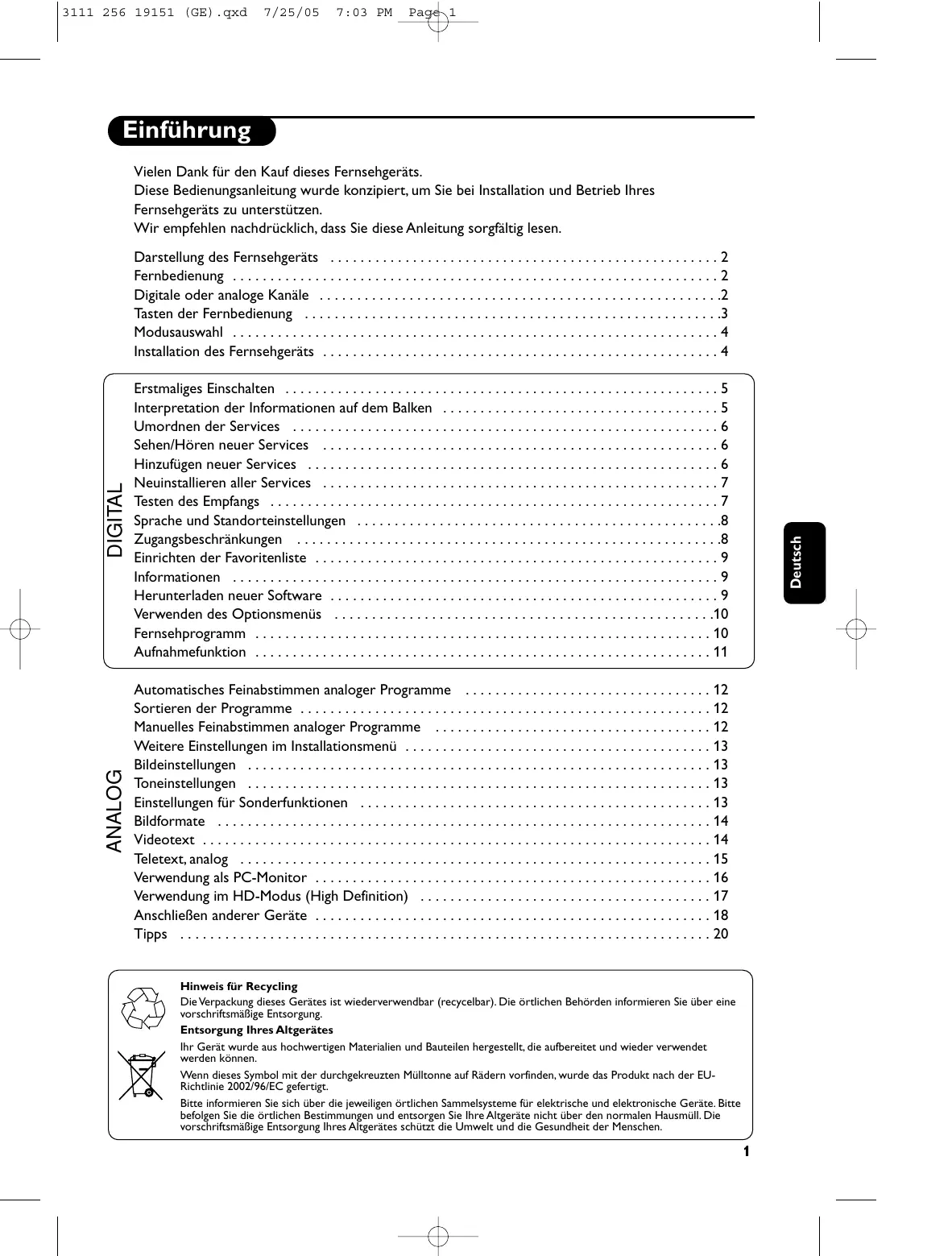 Laden Sie die Anleitung für Ihr Fernseher kostenlos im PDF-Format! Finden Sie Ihr Handbuch 42PF7520D - PHILIPS und nehmen Sie Ihr elektronisches Gerät wieder in die Hand. Auf dieser Seite sind alle Dokumente veröffentlicht, die für die Verwendung Ihres Geräts notwendig sind. 42PF7520D von der Marke PHILIPS.