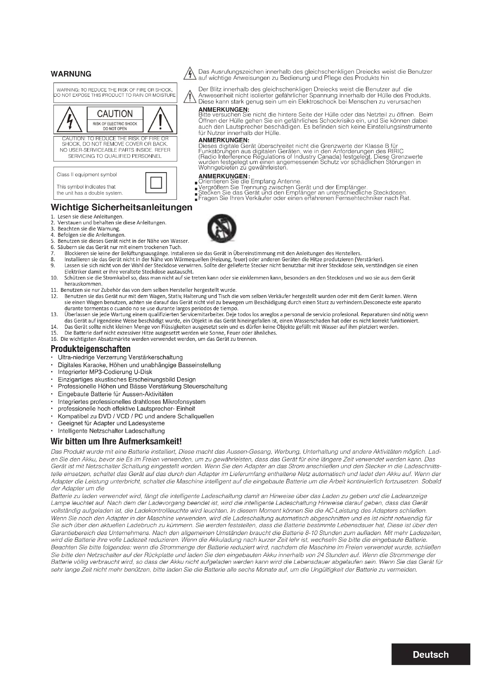 Das Produkt wurde mit eine Batterie installiert, Diese macht das Aussen-Gesang, Werbung, Unterhaltung und andere Aktivitäten möglich. Laden Sie den Akku, bevor sie Es im Freien verwenden, um zu gewährleisten, dass das Gerät für eine langere Zeit verwendet werden kann. Das Gerät ist mit Netzschalter Schaltung eingestellt worden. Wenn Sie den Adapter an das Strom anschließen und den Stecker in die Ladeschnittstelle einsetzen, schaltet das Gerät auf das durch den Adapter im Lieferumfang enthaltene Netz automatisch und ladet den Akku auf. Wenn der Adapter die Leistung unterbricht, schaltet die Maschine intelligent auf die eingebaute Batterie um die Arbeit kontinuierlich fortzusetzen. Sobald der Adapter um die