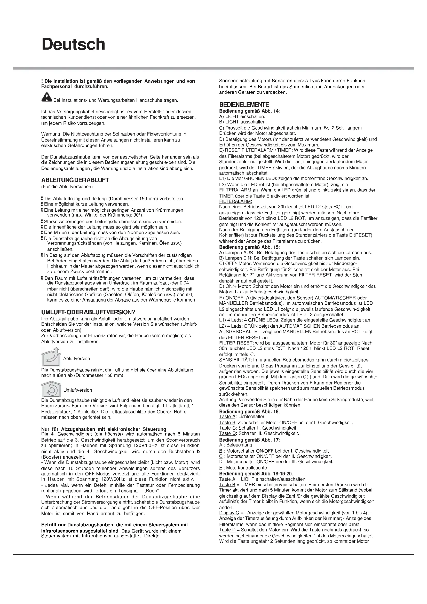 ! Den Raum mit Lufteintrittsöffnungen versehen, um zu vermeiden, dass die Dunstabzugshaube einen Unterdruck im Raum aufbaut (der 0,04 mbar nicht überschreiten darf); wird die Haube nämlich gleichzeitig mit nicht elektrischen Geräten (Gasöfen, Ölöfen, Kohleöfen usw.) benutzt, kann es zu einer Ansaugung der Abgase aus der Wärmequelle kommen. UMLUFT- ODER ABLUFTVERSION? Die Abzugshaube kann als Abluft- oder Umluftversion installiert werden. Entscheiden Sie vor der Installation, welche Version Sie wünschen (Umluft- oder Abluftversion). Zur Verbesserung der Effizienz raten wir, die Haube (sofern möglich) als Abluftversion zu installieren. Abluftversion Die Dunstabzugshaube reinigt die Luft und gibt sie über eine Abluftleitung nach außen ab (Durchmesser 150 mm). Umluftversion Die Dunstabzugshaube reinigt die Luft und leitet sie sauber wieder in den Raum zurück. Für diese Version wird Folgendes benötigt: 1 Luftleitbrett, 1 Reduzierstück, 1 Kohlefilter. Die Luftauslasschlitze des Oberen Rohrs müssen nach oben gerichtet sein. Nur für Abzugshauben mit elektronischer Steuerung: Die 4. Geschwindigkeit (die höchste) wird automatisch nach 5 Minuten Betrieb auf die 3. Geschwindigkeit herabgesetzt, um den Stromverbrauch zu optimieren; In Hauben mit Spannung 120V/60Hz ist diese Funktion nicht aktiv und die 4. Geschwindigkeit wird durch den Buchstaben b (Booster) angezeigt. - Wenn die Dunstabzugshaube eingeschaltet bleibt (Licht bzw. Motor), wird diese nach 10 Stunden fehlender Anweisungen seitens des Benutzers automatisch in den OFF-Modus versetzt und alle Funktionen deaktiviert. In Hauben mit Spannung 120V/60Hz ist diese Funktion nicht aktiv. - Jedes Mal, wenn ein Befehl mithilfe der Tastatur oder Fernbedienung (optional) gegeben wird, ertönt ein Tonsignal - „Beep”. - Wenn während der Betriebsdauer der Dunstabzugshaube eine Unterbrechung der Stromversorgung eintritt, schaltet die Dunstabzugshaube sich automatisch aus und die Taste geht in die OFF-Position über. Der Motor ist somit von Hand erneut zu betätigen. Betrifft nur Dunstabzugshauben, die mit einem Steuersystem mit Infrarotsensoren ausgestattet sind: Das Gerät wurde mit einem Steuersystem mit Infrarotsensor ausgestattet. Direkte Sonneneinstrahlung auf Sensoren dieses Typs kann deren Funktion beeinflussen. Bei Bedarf ist das Sonnenlicht mit Abdeckungen oder anderen Geräten zu verdecken. BEDIENELEMENTE Bedienung gemäß Abb. 14: A) LICHT einschalten. B) LICHT ausschalten. C) Drosselt die Geschwindigkeit auf ein Minimum. Bei 2 Sek. langem Drücken wird der Motor abgeschaltet. D) Betätigung des Motors (mit der zuletzt verwendeten Geschwindigkeit) und Erhöhen der Geschwindigkeit bis zum Maximum. E) RESET FILTERALARM / TIMER: Wird diese Taste während der Anzeige des Filteralarms (bei abgeschaltetem Motor) gedrückt, wird der Stundenzähler nullgestellt. Wird die Taste hingegen bei laufendem Motor gedrückt, wird der TIMER aktiviert, der die Abzughaube nach 5 Minuten automatisch abschaltet. L1) Die vier GRÜNEN LEDs zeigen die momentane Geschwindigkeit an. L2) Wenn die LED rot ist (bei abgeschaltetem Motor), zeigt sie FILTERALARM an. Wenn die LED grün ist und blinkt, zeigt sie an, dass der TIMER über die Taste E aktiviert worden ist. FILTERALARM: Nach einer Betriebszeit von 30h leuchtet LED L2 stets ROT, um anzuzeigen, dass die Fettfilter gereinigt werden müssen. Nach einer Betriebszeit von 120h blinkt LED L2 ROT, um anzuzeigen, dass die Fettfilter gereinigt und die Kohlenfilter ausgetauscht werden müssen. Nach der Reinigung den Fettfiltern (und/oder dem Austausch der Kohlenfilter) ist zur Rückstellung des Stundenzählers die Taste E (RESET) während der Anzeige des Filteralarms zu drücken. Bedienung gemäß Abb. 15: A) Lampen AUS : Bei Betätigung der Taste schalten sich die Lampen aus. B) Lampen EIN: Bei Betätigung der Taste schalten sich Lampen ein. C) OFF/- Motor: Vermindert die Geschwindigkeit bis zur Mindestge- schwindigkeit. Bei Betätigung für 2” schaltet sich der Motor aus. Bei Betätigung für 2” und Aktivierung von FILTER RESET wird der Stun- denzähler auf null gestellt. D) ON/+ Motor: Schaltet den Motor ein und erhöht die Geschwindigkeit des Motors bis zur Höchstgeschwindigkeit. E) ON/OFF: Aktiviert/deaktiviert den Sensor( AUTOMATISCHER oder MANUELLER Betriebsmodus). Im automatischen Betriebsmodus ist LED L2 eingeschaltet und LED L1 zeigt die jeweils laufende Geschwin-digkeit an. Im manuellen Betriebsmodus ist LED L2 ausgeschaltet. L1) 4 Leds: 4 GRÜNE LEDs. Zeigen die eingestellte Geschwindigkeit an L2) 4 Leds: GRÜN zeigt den AUTOMATISCHEN Betriebsmodus an. AUSGESCHALTET: zeigt den MANUELLEN Betriebsmodus an ROT zeigt das FILTER RESET an FILTER RESET: wird bei ausgeschaltetem Motor für 30” angezeigt: Nach 30h leuchtet LED L2 stets ROT. Nach 120h blinkt LED L2 ROT Reset erfolgt mittels C. SENSIBILITÄT: Im manuellen Betriebsmodus kann durch gleichzeitiges Drücken von E und D das Programm zur Einstellung der Sensibilität aufgerufen werden. Die jeweils eingestellte Sensibilität wird durch die vier grünen LEDs angezeigt. Mit den Tasten C(-) und D(+) wird die ge-wünschte Sensibilität eingestellt. Durch Drücken von E kann der Bediener die gewünschte Sensibilität speichern und zum manuellen Betriebsmodus zurückkehren. Achtung: Verwenden Sie in der Nähe der Haube keine Silikonprodukte, weil diese den Sensor beschädigen könnten! Bedienung gemäß Abb. 16: Taste A: Lichtschalter. Taste B: Zündschalter Motor ON/OFF bei der I. Geschwindigkeit. Taste C: Schalter II. Geschwindigkeit. Taste D: Schalter III. Geschwindigkeit. Bedienung gemäß Abb. 17: A : Beleuchtung. B : Motorschalter ON/OFF bei der I. Geschwindigkeit. C : Motorschalter ON/OFF bei der II. Geschwindigkeit. D : Motorschalter ON/OFF bei der III. Geschwindigkeit. E : Motorkontrolleuchte. Bedienung gemäß Abb. 18-19-20: Taste A = LICHT einschalten/ausschalten. Taste B = TIMER einschalten/ausschalten: Beim ersten Drücken wird d