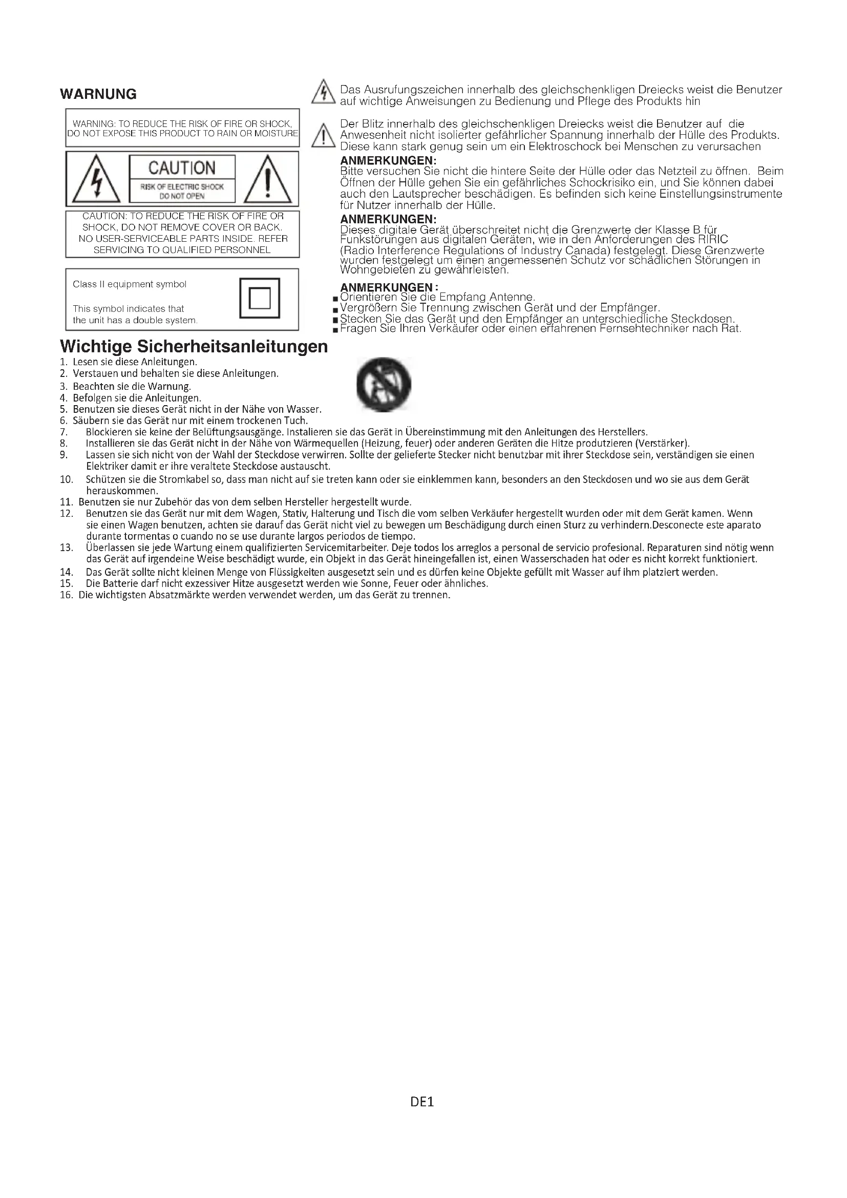 - Überlassen sie jeder Wartung einem qualifizierten Servicemitarbeiter. Deje todos los arreglos a personal de servicei profesional. Reparaturen sind nigtig wenn das Gerat auf igendeine Weise beschadigt wurde, ein Objekt in das Gerat hineingefallen ist, einen Wasserschaden hat oder es nicht korrekt Funktioniert.