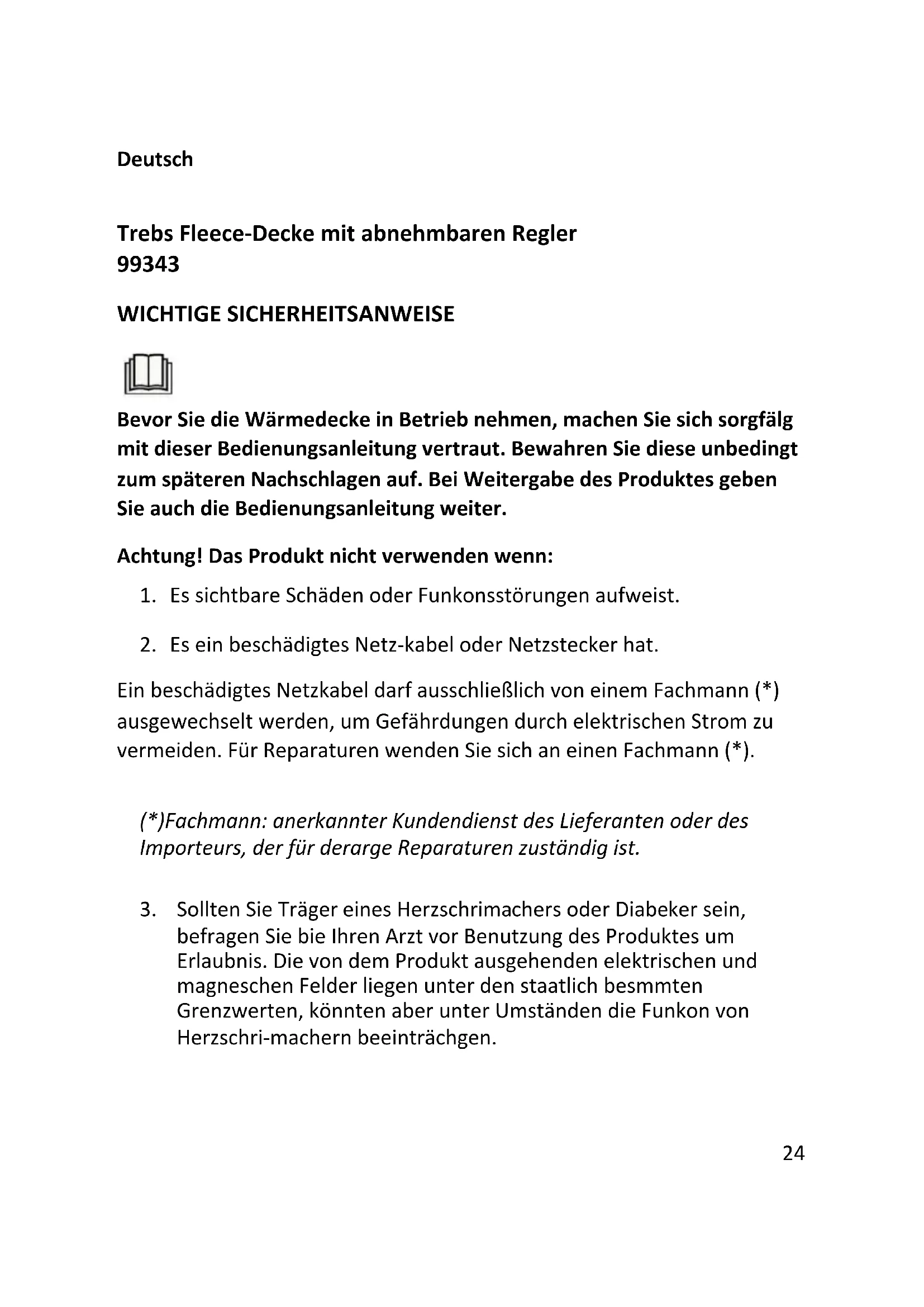 Achtung Stromschlag-gefahr! Produkt, Netzkabel und Netzstecker dürfen nicht mit Wasser oder anderen Flüssigkeiten in Berührung kommen. Achtung! Aus Sicher-heitsgründen ziehen Sie nach jedem Gebrauch, sowie vor der Reinigung, Aufbewahrung oder dem Transport grundsätzlich den Netzstecker und lassen die Wärmedecke abkühlen.