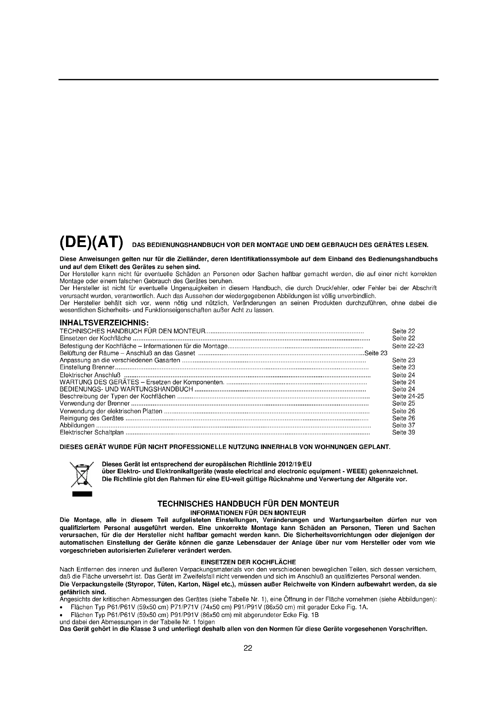 (DE)(AT) DAS BEDIENUNGSHANDBUCH VOR DER MONTAGE UND DEM GEBRAUCH DES GERÄTES LESEN. Diese Anweisungen gelten nur für die Zielländer, deren Identifikationssymbole auf dem Einband des Bedienungshandbuchs und auf dem Etikett des Gerätes zu sehen sind. Der Hersteller kann nicht für eventuelle Schäden an Personen oder Sachen haftbar gemacht werden, die auf einer nicht korrekten Montage oder einem falschen Gebrauch des Gerätes beruhen. Der Hersteller ist nicht für eventuelle Ungenauigkeiten in diesem Handbuch, die durch Druckfehler, oder Fehler bei der Abschrift verursacht wurden, verantwortlich. Auch das Aussehen der wiedergegebenen Abbildungen ist völlig unverbindlich. Der Hersteller behält sich vor, wenn nötig und nützlich, Veränderungen an seinen Produkten durchzuführen, ohne dabei die wesentlichen Sicherheits- und Funktionseigenschaften außer Acht zu lassen. INHALTSVERZEICHNIS: TECHNISCHES HANDBUCH FÜR DEN MONTEUR......................................................................................... Seite 22 Einsetzen der Kochfläche ..................................................................................................................................... Seite 22 Befestigung der Kochfläche – Informationen für die Montage............................................................................ Seite 22-23 Belüftung der Räume – Anschluß an das Gasnet ............................................................................................. Seite 23 Anpassung an die verschiedenen Gasarten ....................................................................................................... Seite 23 Einstellung Brenner .............................................................................................................................................. Seite 23 Elektrischer Anschluß .......................................................................................................................................... Seite 24 WARTUNG DES GERÄTES – Ersetzen der Komponenten................................................................................. Seite 24 BEDIENUNGS- UND WARTUNGSHANDBUCH ................................................................................................ Seite 24 Beschreibung der Typen der Kochflächen ............................................................................................................ Seite 24-25 Verwendung der Brenner ..................................................................................................................................... Seite 25 Verwendung der elektrischen Platten ................................................................................................................... Seite 26 Reinigung des Gerätes ........................................................................................................................................ Seite 26 Abbildungen .......................................................................................................................................................... Seite 37 Elektrischer Schaltplan ......................................................................................................................................... Seite 39 DIESES GERÄT WURDE FÜR NICHT PROFESSIONELLE NUTZUNG INNERHALB VON WOHNUNGEN GEPLANT. Dieses Gerät ist entsprechend der europäischen Richtlinie 2012/19/EU über Elektro- und Elektronikaltgeräte (waste electrical and electronic equipment - WEEE) gekennzeichnet. Die Richtlinie gibt den Rahmen für eine EU-weit gültige Rücknahme und Verwertung der Altgeräte vor.