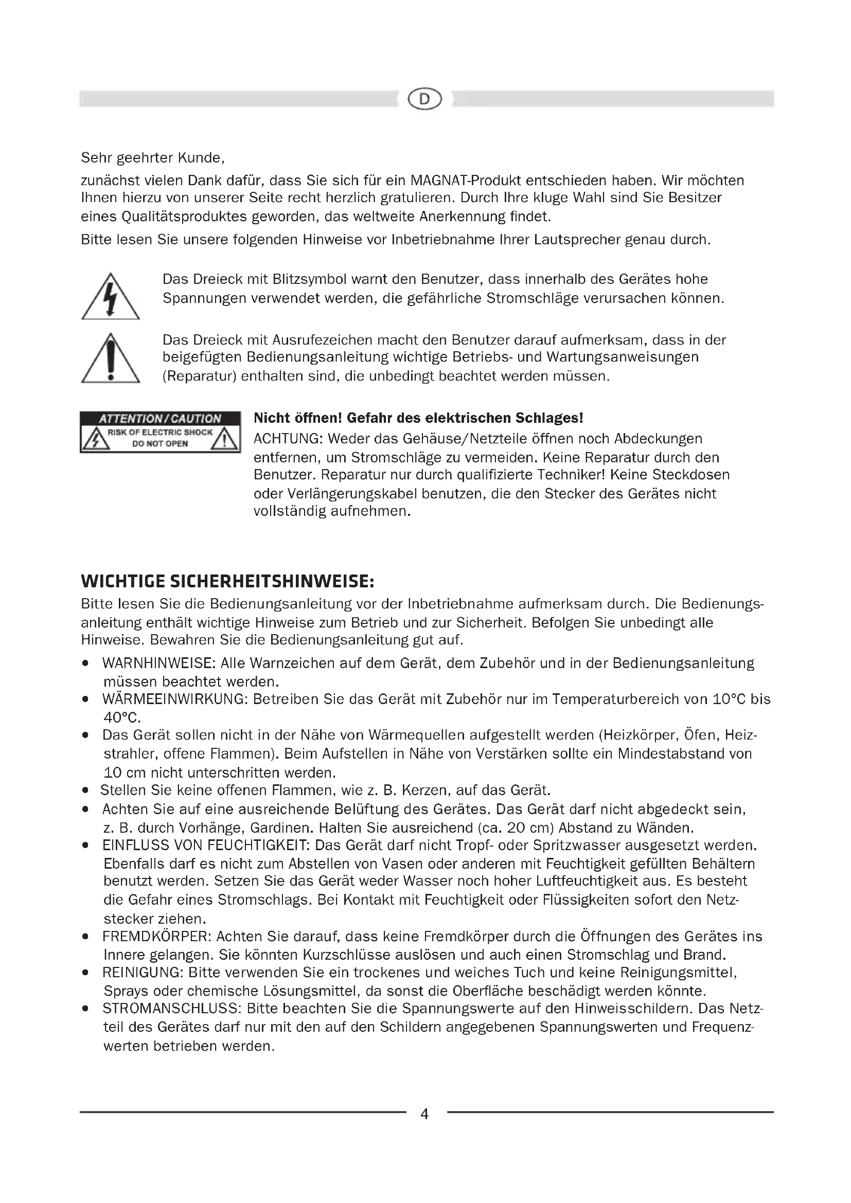 3Wir gratulieren Ihnen! Durch Ihre kluge Wahl sind Sie Besitzer eines MAGNAT HiFi-Produktes geworden. MAGNAT HiFi-Produkte erfreuen sich aufgrund der hohen Qualität eines ausgezeichneten Rufes weltweit. Dieser hohe Qualitätsstandard ermöglicht es für MAGNAT HiFi-Lautsprecher 5 Jahre und für MAGNAT HiFi-Elektronik 2 Jahre Garantie zu gewähren. Die Produkte werden während des gesamten Fertigungsvorganges laufend kontrolliert und geprüft. Im Servicefall beachten Sie bitte folgendes: