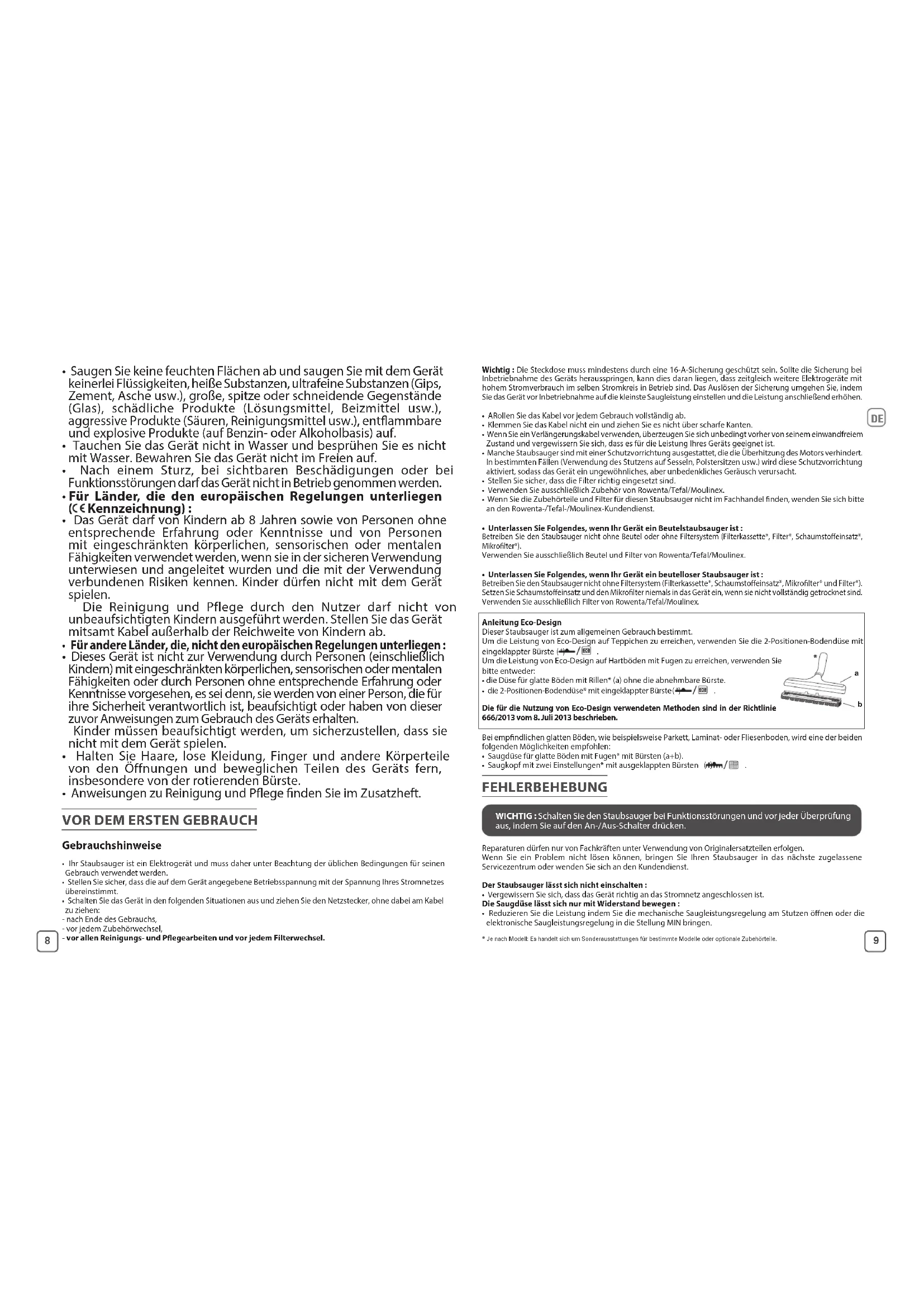 EN8 9 Wichtig : Die Steckdose muss mindestens durch eine 16-A-Sicherung geschützt sein. Sollte die Sicherung bei Inbetriebnahme des Geräts herausspringen, kann dies daran liegen, dass zeitgleich weitere Elektrogeräte mit hohem Stromverbrauch im selben Stromkreis in Betrieb sind. Das Auslösen der Sicherung umgehen Sie, indem Sie das Gerät vor Inbetriebnahme auf die kleinste Saugleistung einstellen und die Leistung anschließend erhöhen.• ARollen Sie das Kabel vor jedem Gebrauch vollständig ab.• Klemmen Sie das Kabel nicht ein und ziehen Sie es nicht über scharfe Kanten.• Wenn Sie ein Verlängerungskabel verwenden, überzeugen Sie sich unbedingt vorher von seinem einwandfreiem Zustand und vergewissern Sie sich, dass es für die Leistung Ihres Geräts geeignet ist.• Manche Staubsauger sind mit einer Schutzvorrichtung ausgestattet, die die Überhitzung des Motors verhindert. In bestimmten Fällen (Verwendung des Stutzens auf Sesseln, Polstersitzen usw.) wird diese Schutzvorrichtung aktiviert, sodass das Gerät ein ungewöhnliches, aber unbedenkliches Geräusch verursacht.• Stellen Sie sicher, dass die Filter richtig eingesetzt sind.• Verwenden Sie ausschließlich Zubehör von Rowenta/Tefal/Moulinex.• Wenn Sie die Zubehörteile und Filter für diesen Staubsauger nicht im Fachhandel nden, wenden Sie sich bitte an den Rowenta-/Tefal-/Moulinex-Kundendienst.• Unterlassen Sie Folgendes, wenn Ihr Gerät ein Beutelstaubsauger ist :Betreiben Sie den Staubsauger nicht ohne Beutel oder ohne Filtersystem (Filterkassette*, Filter*, Schaumstoeinsatz*, Mikrolter*).Verwenden Sie ausschließlich Beutel und Filter von Rowenta/Tefal/Moulinex.• Unterlassen Sie Folgendes, wenn Ihr Gerät ein beutelloser Staubsauger ist :Betreiben Sie den Staubsauger nicht ohne Filtersystem (Filterkassette*, Schaumstoeinsatz*, Mikrolter* und Filter*).Setzen Sie Schaumstoeinsatz und den Mikrolter niemals in das Gerät ein, wenn sie nicht vollständig getrocknet sind.Verwenden Sie ausschließlich Filter von Rowenta/Tefal/Moulinex Anleitung Eco-DesignDieser Staubsauger ist zum allgemeinen Gebrauch bestimmt.Um die Leistung von Eco-Design auf Teppichen zu erreichen, verwenden Sie die 2-Positionen-Bodendüse mit eingeklappter Bürste ( *) Um die Leistung von Eco-Design auf Hartböden mit Fugen zu erreichen, verwenden Sie bitte entweder:• die Düse für glatte Böden mit Rillen* (a) ohne die abnehmbare Bürste.• die 2-Positionen-Bodendüse* mit eingeklappter Bürste ( *) Die für die Nutzung von Eco-Design verwendeten Methoden sind in der Richtlinie 666/2013 vom 8. Juli 2013 beschrieben.Bei empndlichen glatten Böden, wie beispielsweise Parkett, Laminat- oder Fliesenboden, wird eine der beiden folgenden Möglichkeiten empfohlen:• Saugdüse für glatte Böden mit Fugen* mit Bürsten (a+b).• Saugkopf mit zwei Einstellungen* mit ausgeklappten Bürsten ( *)
