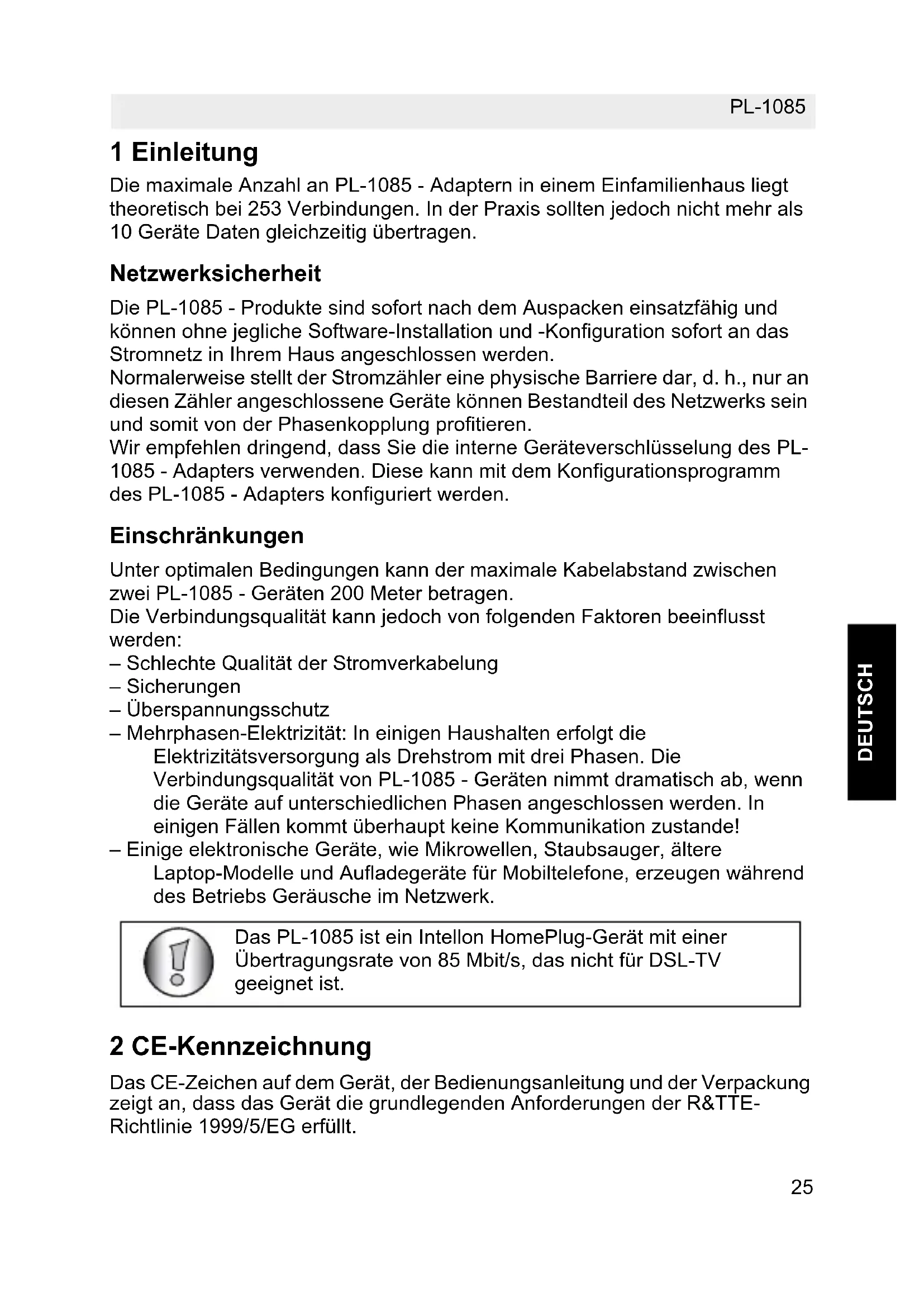 -Mehrphasen-Elektrizität: In einigen Haushalten erfolgt die Elektrizitätsversorgung als Drehstrom mit drei Phasen. Die Verbindungsqualität von PL-1085 - Geräten nimmt dramatisch ab, wenn die Geräte auf entsprechenden Phasen angeschlossen werden. In einigen Fälle kommt überhaupt keine Kommunikation zustande! - Einige elektronische Geräte, wie Mikrowellen, Staubsauger, ältere Laptop-Modelle und Aufladegeräte für Mobiltelefon, erzeugen während des Betriebs Gerausche im Netzwerk.