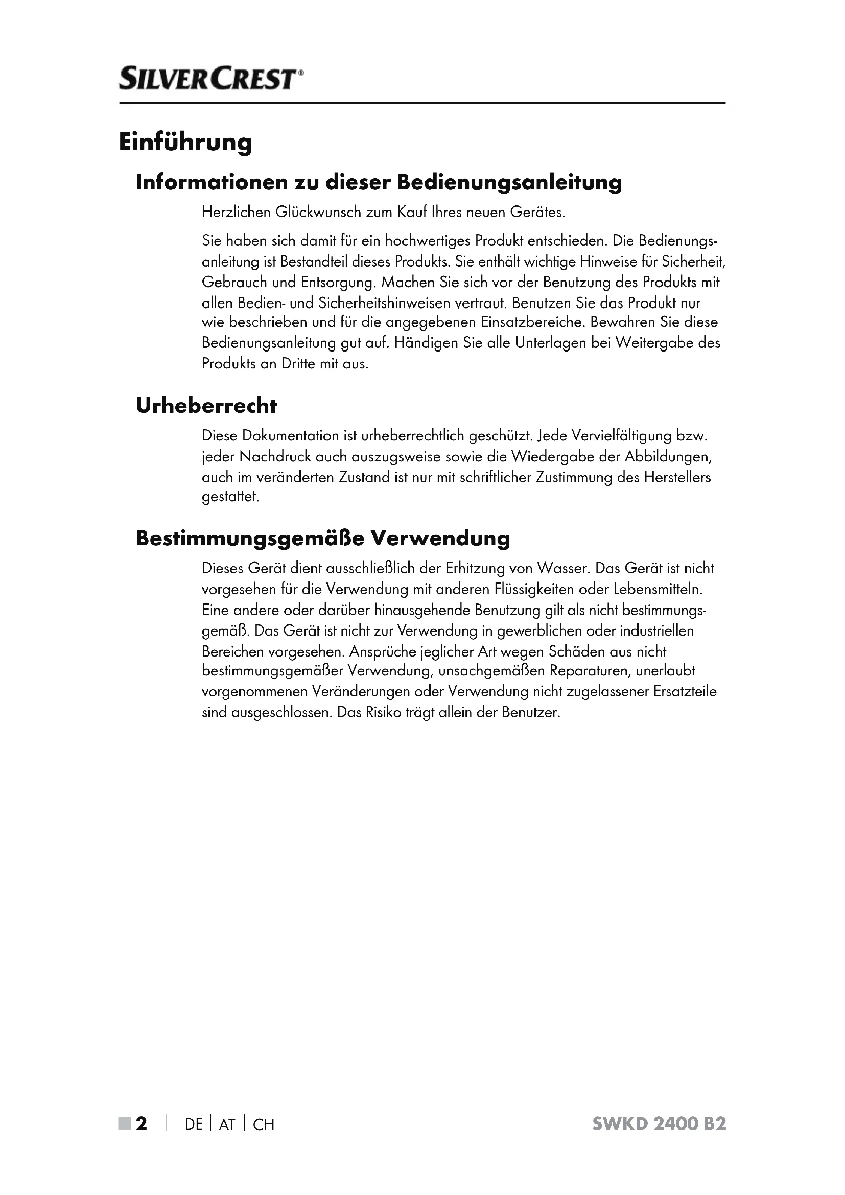SWKD 2400 B2 Einführung Informationen zu dieser Bedienungsanleitung Herzlichen Glückwunsch zum Kauf Ihres neuen Gerätes. Sie haben sich damit für ein hochwertiges Produkt entschieden. Die Bedienungs- anleitung ist Bestandteil dieses Produkts. Sie enthält wichtige Hinweise für Sicherheit, Gebrauch und Entsorgung. Machen Sie sich vor der Benutzung des Produkts mit allen Bedien- und Sicherheitshinweisen vertraut. Benutzen Sie das Produkt nur wie beschrieben und für die angegebenen Einsatzbereiche. Bewahren Sie diese Bedienungsanleitung gut auf. Händigen Sie alle Unterlagen bei Weitergabe des Produkts an Dritte mit aus. Urheberrecht Diese Dokumentation ist urheberrechtlich geschützt. Jede Vervielfältigung bzw. jeder Nachdruck auch auszugsweise sowie die Wiedergabe der Abbildungen, auch im veränderten Zustand ist nur mit schriftlicher Zustimmung des Herstellers gestattet. Bestimmungsgemäße Verwendung Dieses Gerät dient ausschließlich der Erhitzung von Wasser. Das Gerät ist nicht vorgesehen für die Verwendung mit anderen Flüssigkeiten oder Lebensmitteln. Eine andere oder darüber hinausgehende Benutzung gilt als nicht bestimmungs- gemäß. Das Gerät ist nicht zur Verwendung in gewerblichen oder industriellen Bereichen vorgesehen. Ansprüche jeglicher Art wegen Schäden aus nicht bestimmungsgemäßer Verwendung, unsachgemäßen Reparaturen, unerlaubt vorgenommenen Veränderungen oder Verwendung nicht zugelassener Ersatzteile sind ausgeschlossen. Das Risiko trägt allein der Benutzer.DE