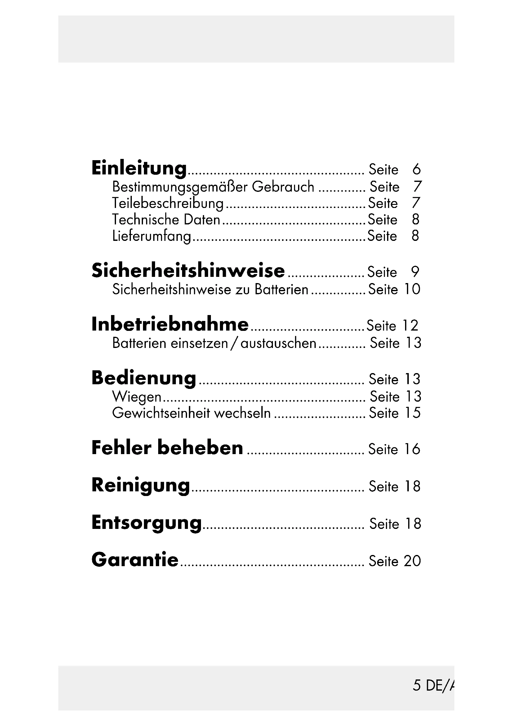 max. 50 kg5 DE/AT/CH Einleitung ................................................ Seite 6 Bestimmungsgemäßer Gebrauch ............. Seite 7 Teilebeschreibung ...................................... Seite 7 Technische Daten ....................................... Seite 8 Lieferumfang ............................................... Seite 8 Sicherheitshinweise ..................... Seite 9 Sicherheitshinweise zu Batterien ............... Seite 10 Inbetriebnahme ............................... Seite 12 Batterien einsetzen / austauschen ............. Seite 13 Bedienung ............................................. Seite 13 Wiegen ....................................................... Seite 13 Gewichtseinheit wechseln ......................... Seite 15 Fehler beheben ................................ Seite 16 Reinigung ............................................... Seite 18 Entsorgung............................................ Seite 18 Garantie .................................................. Seite 206 DE/AT/CH Kofferwaage Einleitung Wir beglückwünschen Sie zum Kauf Ihres neuen Produkts. Sie haben sich damit für ein hochwertiges Produkt entschieden. Die Bedienungsanleitung ist Teil dieses Produkts. Sie enthält wichtige Hinweise für Sicherheit, Gebrauch und Entsorgung. Machen Sie sich vor der Benutzung des Produkts mit allen Bedien- und Sicher- heitshinweisen vertraut. Benutzen Sie das Produkt nur wie beschrieben und für die angegebenen Einsatzbereiche. Händigen Sie alle Unterlagen bei Weitergabe des Produkts an Dritte mit aus.7 DE/AT/CH Bestimmungsgemäßer Gebrauch Dieses Gerät ist zum Wiegen von Gepäck- stücken bestimmt. Das Produkt ist ausschließ- lich für den privaten Gebrauch bestimmt. Teilebeschreibung