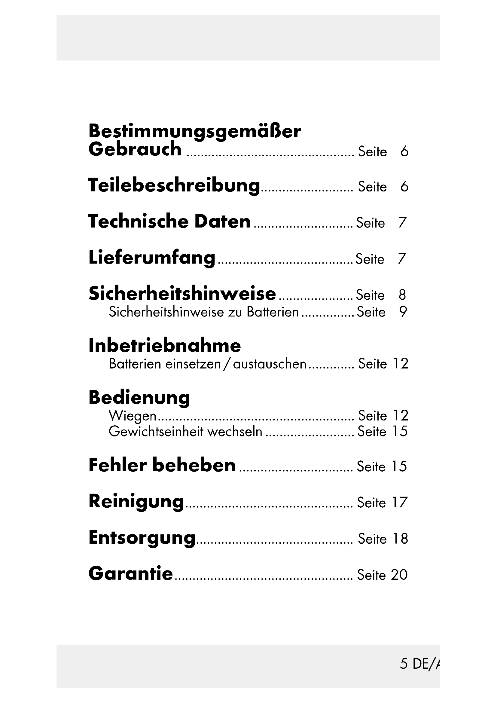105 DE/AT/CH Bestimmungsgemäßer Gebrauch ............................................... Seite 6 Teilebeschreibung.......................... Seite 6 Technische Daten ............................ Seite 7 Lieferumfang ...................................... Seite 7 Sicherheitshinweise ..................... Seite 8 Sicherheitshinweise zu Batterien ............... Seite 9 Inbetriebnahme Batterien einsetzen / austauschen ............. Seite 12 Bedienung Wiegen ....................................................... Seite 12 Gewichtseinheit wechseln ......................... Seite 15 Fehler beheben ................................ Seite 15 Reinigung ............................................... Seite 17 Entsorgung............................................ Seite 18 Garantie .................................................. Seite 206 DE/AT/CH Kofferwaage Bestimmungsgemäßer Gebrauch Dieses Gerät ist zum Wiegen von Gepäck- stücken bestimmt. Das Produkt ist ausschließ- lich für den privaten Gebrauch bestimmt. Teilebeschreibung