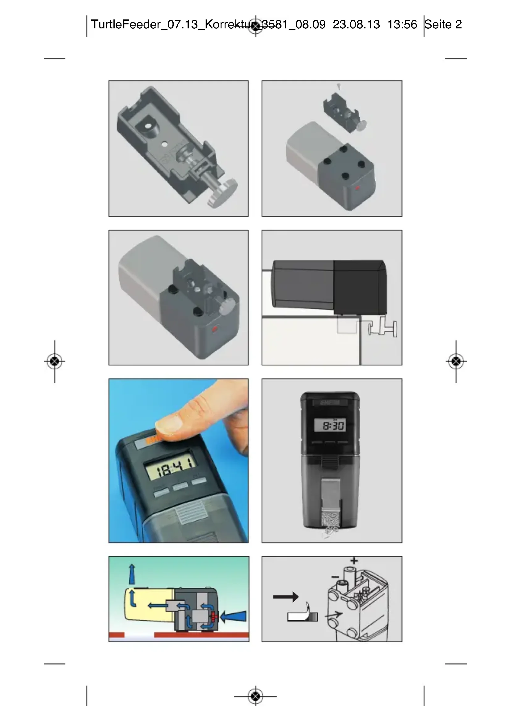 = Füttervorgang wird 2 x im Abstand von einer Minute ausgeführt. SET > Fütterzeit 1 wird gespeichert. MODE > Die nächste Fütterzeit wird angezeigt. Über SET kann diese wie oben programmiert werden oder wiederholtes MODE schaltet über die weiteren Füt- terzeiten wieder bis zur aktuellen Uhrzeit. D Manuelle Bedienung Für Fütterungen außerhalb der programmierten Zeiten genügt ein Druck auf die Taste oberhalb des Displays, mit der die Trommeldre- hung manuell ausgelöst werden kann. E Befüllung Trommeleinheit in Längsrichtung abziehen und den rückseitigen De- ckel abnehmen. Trommel trocken reinigen (Pinsel) und Futtermenge einfüllen. Anschließend Deckel wieder aufsetzen und Trommeleinheit auf Achse stecken. Der Futterautomat eignet sich für Bachflohkrebse, Garnelen, Futter- sticks und Granulate. Nicht für Frisch- oder Feuchtfutter verwenden! TurtleFeeder_07.13_Korrektur_3581_08.09 23.08.13 13:56 Seite 5English To insert the batteries (2 x ”AA“ size 1.5 V alkaline batteries), open the housing cover by applying light pressure on the locking clip. Pay atten- tion to the proper poling of the batteries. Attention: do not use rechargeable batteries. Closing the housing cover: Insert into the upper edge of the drive unit and pivot downwards until the lock engages. Changing batteries: If the symbol LO appears on the display, it means B Setup A Function