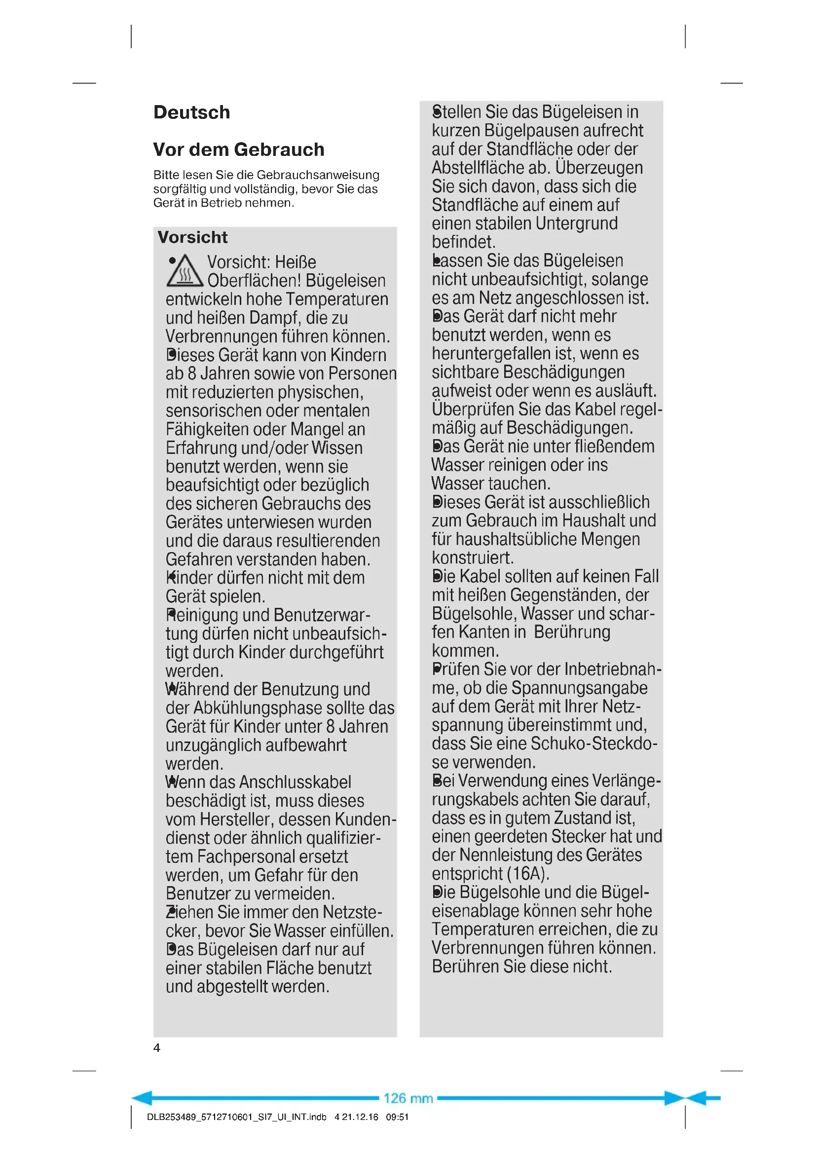 Vorsicht: Heiße Oberflächen! Bügeleisen entwickeln hohe Temperaturen und heißen Dampf, die zu Verbrennungen führen können.